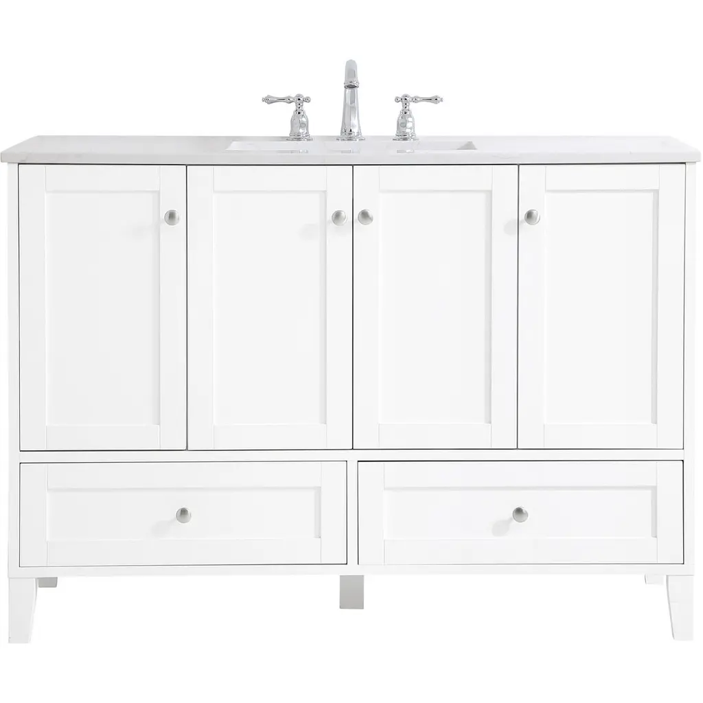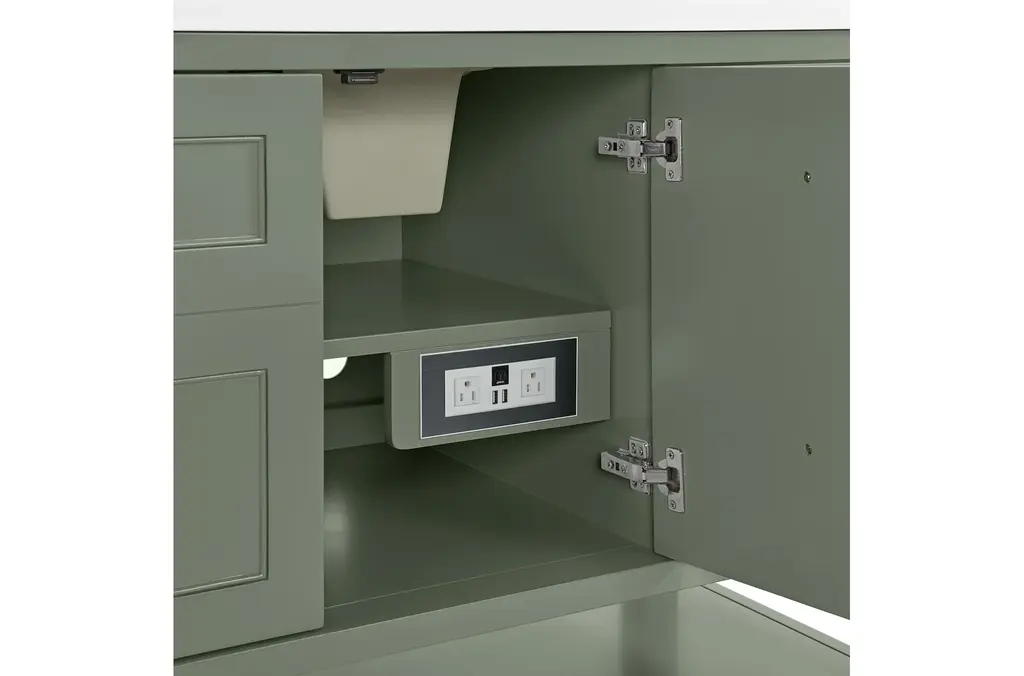 Includes quartz vanity top and rectangular sink Included Components: Covered under James Martin Vanities' 1 Year warranty Poplar vanity cabinet with 2 doors, 4 drawers , and 1 shelf Quartz single basin vanity top with rectangular porcelain sink Cabinet Features: Constructed from poplar Cabinet bottoms, sides, and shelves are constructed from 1/2" (13mm) thick multi-layered plywood with stain-grade wood veneers Free standing installation – vanity is seated on the floor with wall anchors Drawer boxes feature English Dovetail joinery with premium, soft-close undermount drawer slides; doors feature soft-close, adjustable door hinges Cabinet features a multi-stage premium finish coat to offer UV and moisture resistance Integrated 120V outlet with USB ports Drawers lined with our signature brushed aluminum laminate for easy cleaning Double door design provides easy access to storage space Interior shelves are adjustable and removable with pre-cut channels to allow for plumbing drain pipes 4 full extension drawers with soft-close slides allows for organized storage Soft close drawer slides operate on smooth ball-bearings and prevent drawers from slamming shut Vertical supports and corner brackets reinforce the strength of the cabinet and distributes weight of the countertop Cabinet ships with a full back panel to allow for variable plumbing locations Vanity cabinet includes matching decorative hardware Vanity will need to be assembled Vanity Top Features: Quartz vanity top includes rectangular porcelain sinks Quartz vanity tops are curated from a 95 percent blend of ground natural quartz with 5 percent polymer resin to create an ultra-durable and low maintenance surface Quartz requires no sealing and resists staining and corrosion from liquids, including most household cleaning products 3 pre-drilled faucet holes Center drain location provides optimal draining capability Cabinet Specifications: Cabinet Width: 59-7/8" (left to right) Cabinet Height: 34-1/4" (top to bottom) Cabinet Depth: 23-1/2" (front to back) Number of Doors: 2 Number of Drawers: 4 Number of Shelves: 1 Vanity Top Specifications: Vanity Top Width: 59-7/8" (left edge to right edge) Vanity Top Depth: 23-1/2" (front edge to back edge) Number of Basins: 1 Sink Measurements: 19-1/2" L X 14-3/8" W X 6-7/8" H Number of Faucet Holes: 3 Faucet Centers: 8" (distance between the installation holes for the faucet handles)