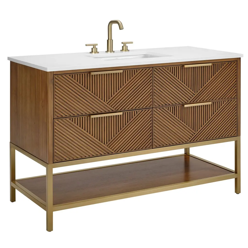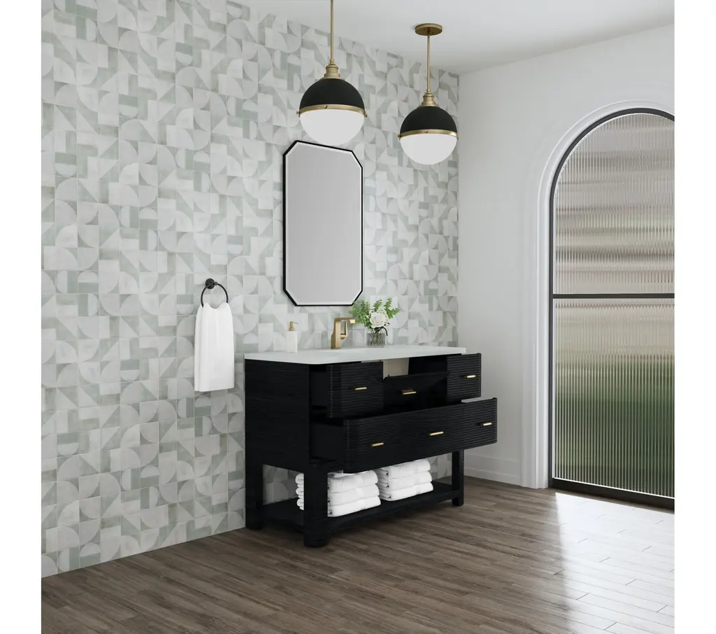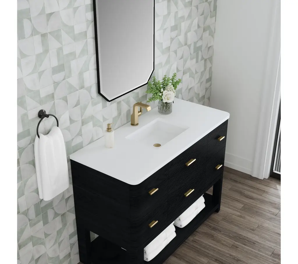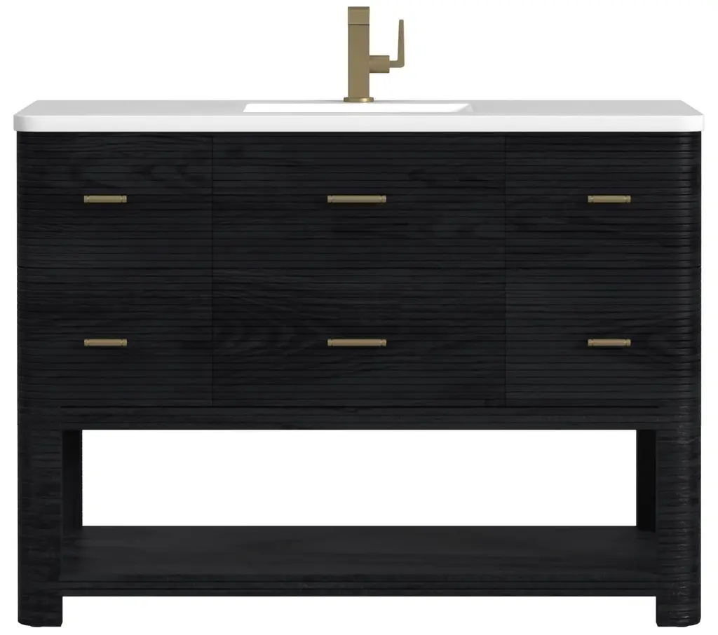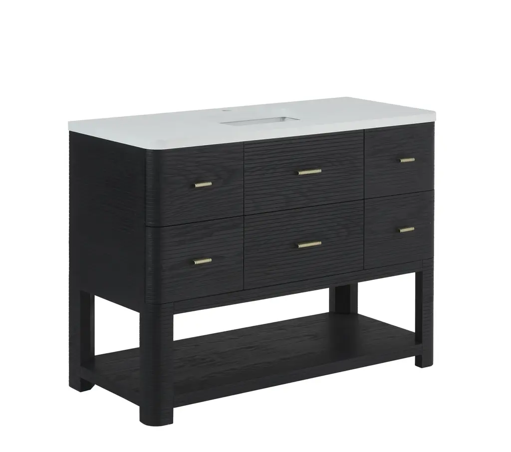 Included Components: Covered under James Martin Vanities' 1 year limited warranty Wood vanity cabinet with 5 drawers, 1 tip-out drawer, and 1 shelf Quartz vanity top with a single porcelain sink Faucet is not included and must be purchased separately Cabinet Features: Constructed from wood providing a lifetime of durability Free standing installation - vanity is seated on the floor with wall anchors, providing a functional design 5 full extension drawers with soft-close slides allow for organized storage Drawers lined with our signature brushed aluminum laminate for easy cleaning 1 tip-out drawer Includes one removable drawer organizer in solid Ash, matched to finish, and lined with our signature brushed aluminum laminate Soft close drawer slides operate on smooth ball-bearings and prevent drawers from slamming shut Drawer boxes feature English Dovetail joinery with premium undermount drawer glides Cabinet features a multi-stage premium finish coat to offer UV and moisture resistance Vanity cabinet includes matching decorative hardware Vanity Top Features: Quartz vanity top includes a sink constructed of porcelain Single pre-drilled faucet hole Each sink features its own rectangular single basin workspace Center drain location provides optimal draining capability Cabinet Specifications: Number of Drawers: 5 Number of Shelves: 1 Vanity Top Specifications: Vanity Top Width: 48" (left edge to right edge) Vanity Top Depth: 21-1/2" (front edge to back edge) Number of Basins: 1 Sink Dimensions: 6-7/8"H x 14-3/8"W x 19-1/2"L Sink Basin Dimensions: 17-1/8" L x 12" W x 4-3/8" D Number of Faucet Holes: 1 Faucet Centers: 0" (distance between the installation holes for the faucet handles)