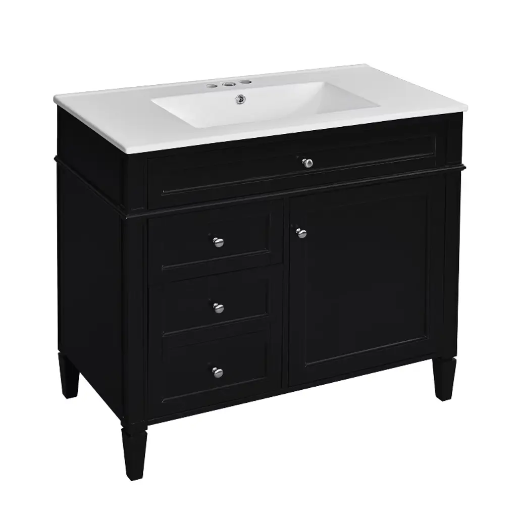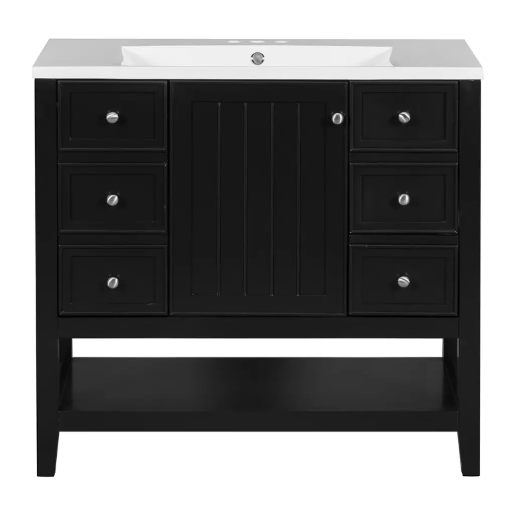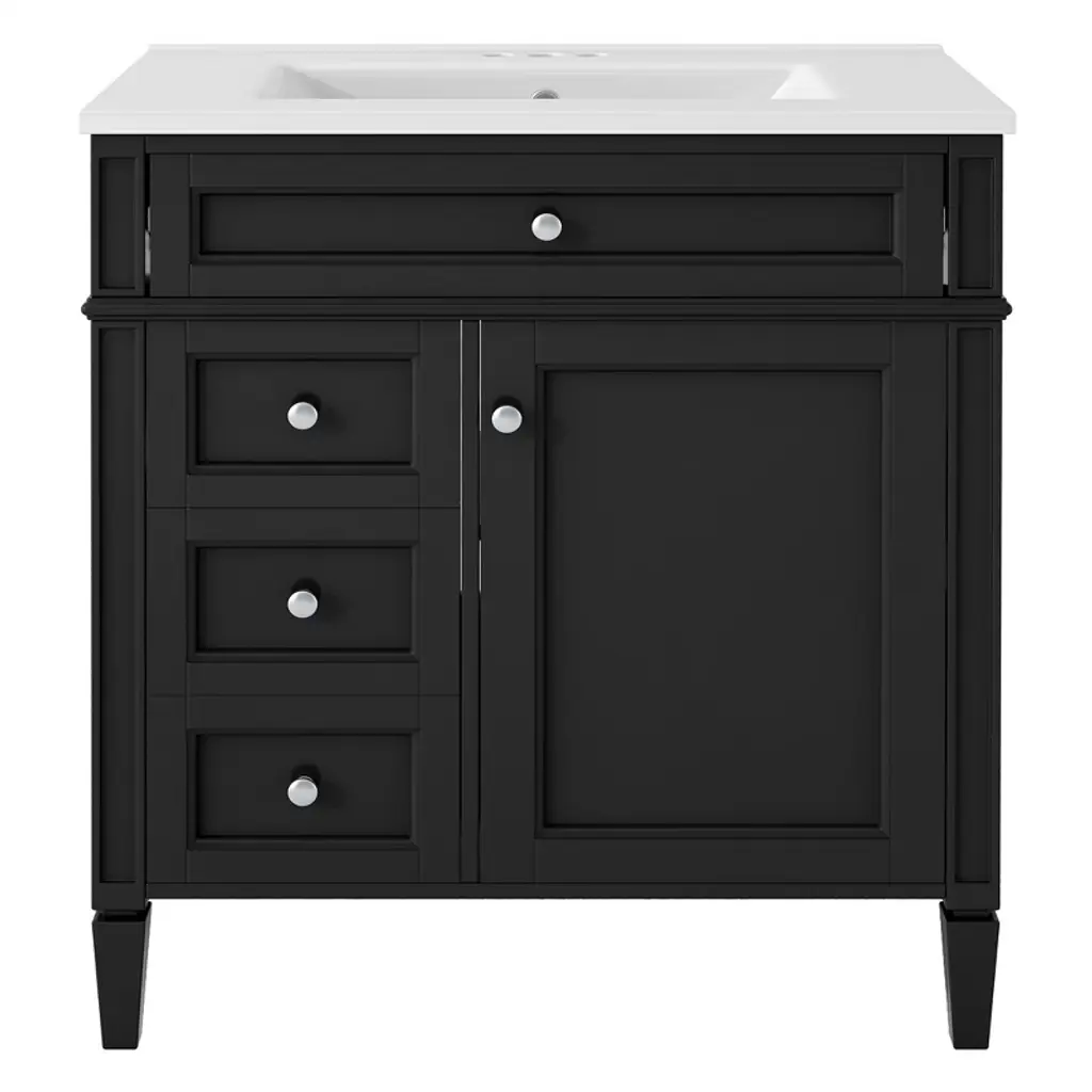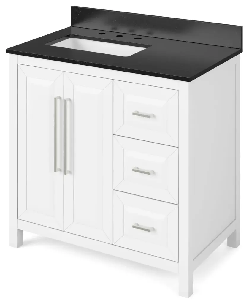 Sleek lines and raised panels come together to create a unique design for the sophisticated Cade vanity collection. Contemporary Stanton pulls adorn this vanity collection, adding elegance and class. Cade's design styles merge to create a perfectly transitional vanity collection. A hardwood dovetail rollout drawer with full extension soft-close undermount slides is situated underneath the adjustable shelf. Additional offset dovetail drawers provide extra storage space. The complete Cade collection is available in a full range of sizes: 18", 24", 30", 36", 48", and 60" double. Each Cade vanity can accept any top material with an oval or rectangle bowl cutout. Top and bowl are not assembled. Some assembly required. Golden flecks bring out the natural elements of this polished Black Granite surface. Granite is still a trending countertop material and a great option for bathrooms. Three holes are cut for an 8" widespread faucet, and a 4" tall backsplash is included. Included vanity top is designed to overhang ½” on each side of the vanity and is 25 mm thick. Included Components: Covered under Jeffrey Alexander's limited lifetime warranty MDF and wood vanity cabinet with 2 doors, 4 drawers, and 1 shelf Granite vanity top with a single sink Faucet is not included and must be purchased separately Cabinet Features: Constructed from MDF and wood providing a lifetime of durability Free standing installation - vanity is seated on the floor with wall anchors, providing a functional design Double door design provides easy access to storage space 4 full extension drawers with soft-close slides allows for organized storage Soft close drawer slides operate on smooth ball-bearings and prevent drawers from slamming shut Vanity will need to be assembled Vanity Top Features: Granite vanity top includes a free standing sink 3 pre-drilled faucet holes Each sink features its own rectangular single basin workspace Center drain location provides optimal draining capability Cabinet Specifications: Cabinet Width: 36" (left to right) Cabinet Height: 35" (top to bottom) Cabinet Depth: 21-1/2" (front to back) Number of Doors: 2 Number of Drawers: 4 Number of Shelves: 1 Vanity Top Specifications: Vanity Top Width: 37" (left edge to right edge) Vanity Top Depth: 22" (front edge to back edge) Number of Basins: 1 Sink Dimensions: 13-3/8"W x 20-7/8"L Number of Faucet Holes: 3