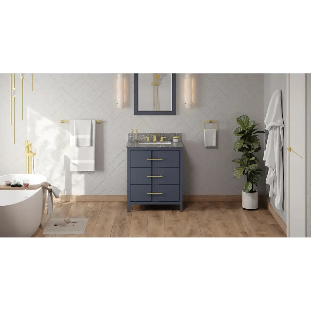 In a world of chaos, the bathroom can be transformed into your utopian Zen space with a Jeffrey Alexander Katara vanity. The smooth calmness of the doors and drawer fronts are accentuated by a slight recession behind the pulls. Everything needed to create an oasis can be stored in the fully maximized storage spaces. Each cabinet smoothly opens and closes with soft-close hinges and holds an adjustable shelf with a dovetail rollout drawer. Every dovetail drawer features full extension undermount slides for the best access to the entire drawer. The drawer front beneath the bowl is fully functional and houses a custom sized hardwood tip out tray. Katara is available in a gamut of sizes, 24”, 30”, 36”, new 42”, 48”, and 60” double so that no matter the size of your oasis, there is a vanity to fit. Enhancing Katara's overall aesthetic is the addition of Dominique knobs and pulls in a blissful array of complementing finishes. Katara vanities can accept tops with either an oval or rectangle bowl cutout. Top and bowl are not assembled. Some assembly required. Grey mid-tones and flecks of white blend to create a warm, deep grey visual texture that is reminiscent of majestic boulders glistening in the bright sun. Three holes are cut for an 8" widespread faucet, and a 4" tall backsplash is included. Included vanity top is designed to overhang ½” on each side of the vanity and is 25 mm thick. Included Components: Covered under Jeffrey Alexander's limited lifetime warranty MDF and wood vanity cabinet with 2 drawers Marble vanity top with a single sink Faucet is not included and must be purchased separately Cabinet Features: Constructed from MDF and wood providing a lifetime of durability Free standing installation - vanity is seated on the floor with wall anchors, providing a functional design 2 full extension drawers with soft-close slides allows for organized storage Soft close drawer slides operate on smooth ball-bearings and prevent drawers from slamming shut Vanity will need to be assembled Vanity Top Features: Marble vanity top includes a free standing sink 3 pre-drilled faucet holes Each sink features its own rectangular single basin workspace Center drain location provides optimal draining capability Cabinet Specifications: Cabinet Width: 30" (left to right) Cabinet Height: 35" (top to bottom) Cabinet Depth: 21-1/2" (front to back) Number of Drawers: 2 Vanity Top Specifications: Vanity Top Width: 31" (left edge to right edge) Vanity Top Depth: 22" (front edge to back edge) Number of Basins: 1 Sink Dimensions: 13-3/8"W x 20-7/8"L Number of Faucet Holes: 3