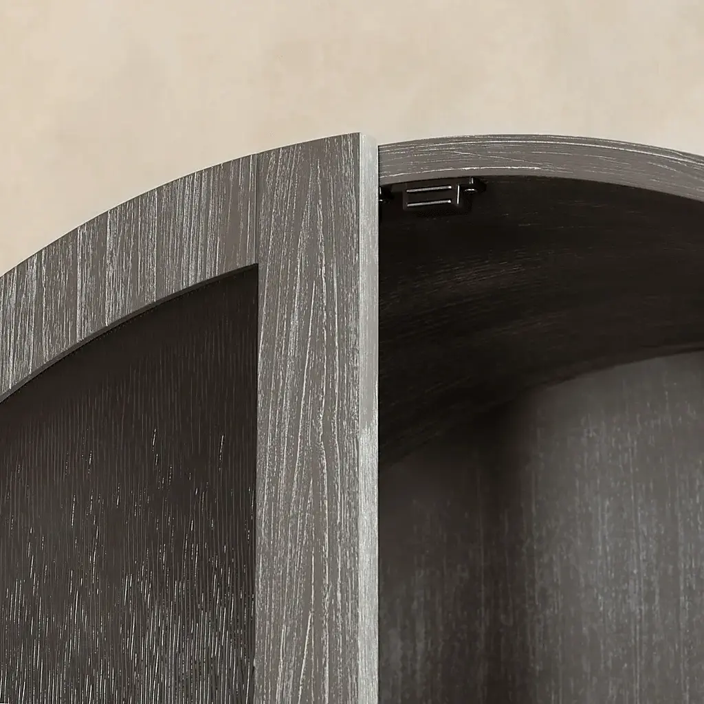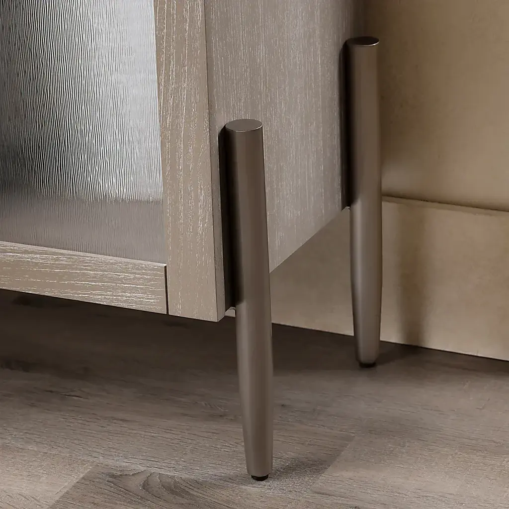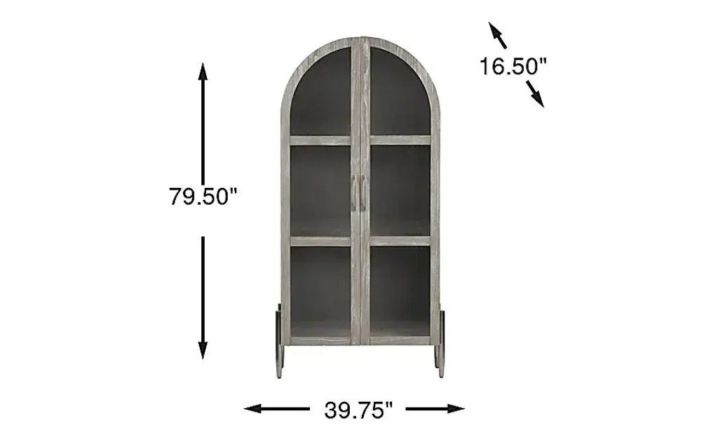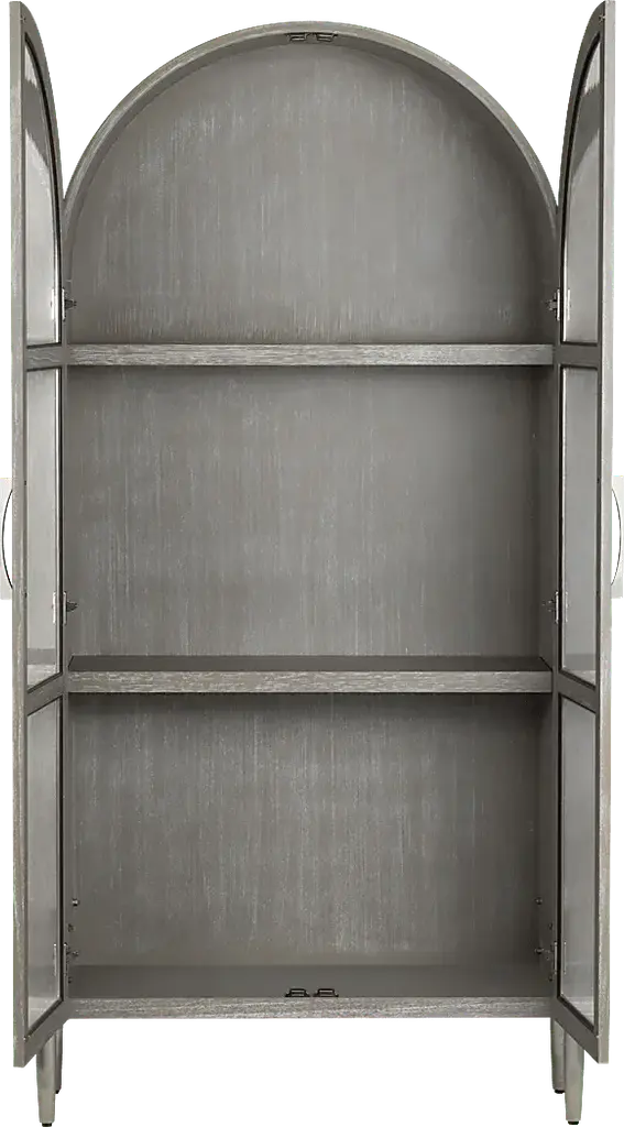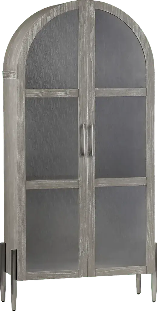 Like a breeze dappling the reflection of light as it dances across still waters, the Jenkins cabinet inspires a fresh perspective on a classic of interior decor. This transitional accent features two glass-paneled doors, the variegated texture on the clear surface obscuring the shapes but not the colors of items stored inside. Its arched design in khaki brown is grounded by four tapered metal legs, helping to create a floating effect.