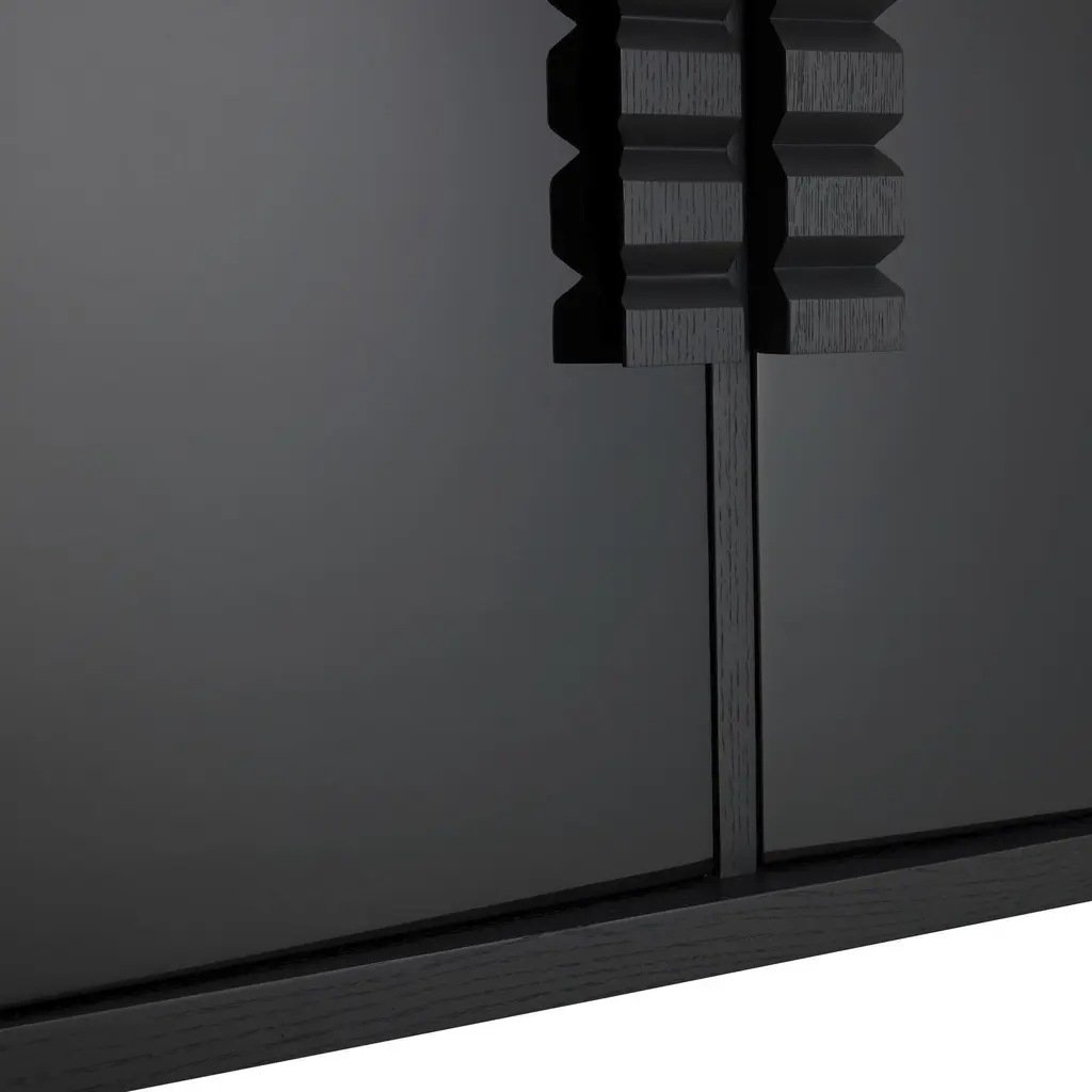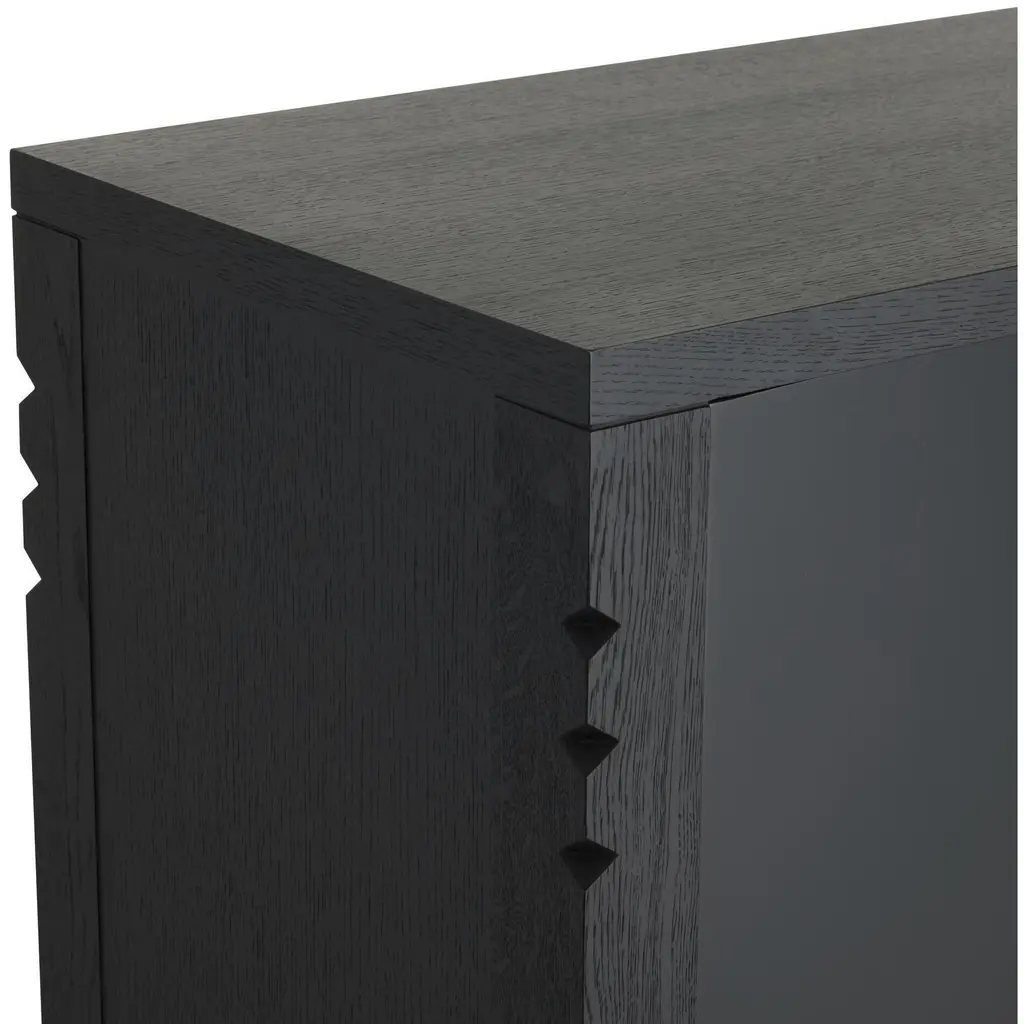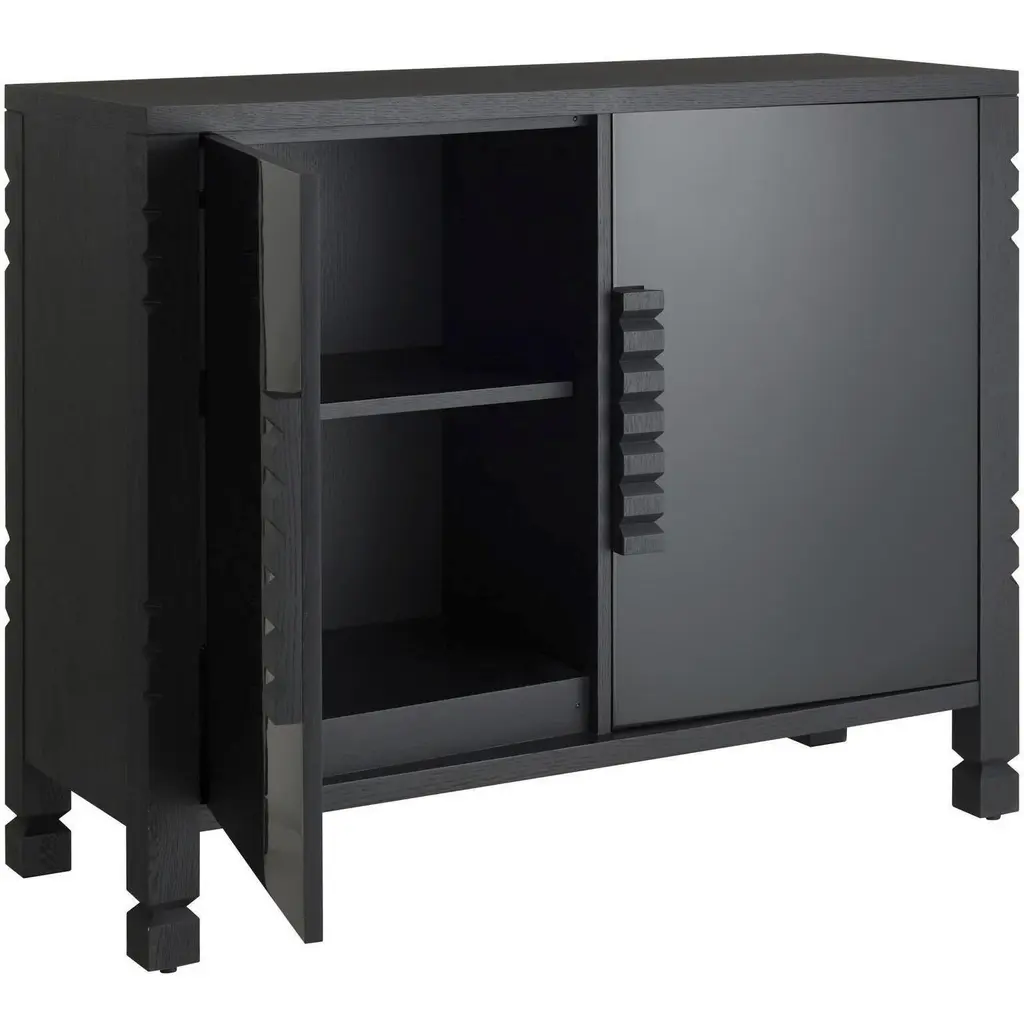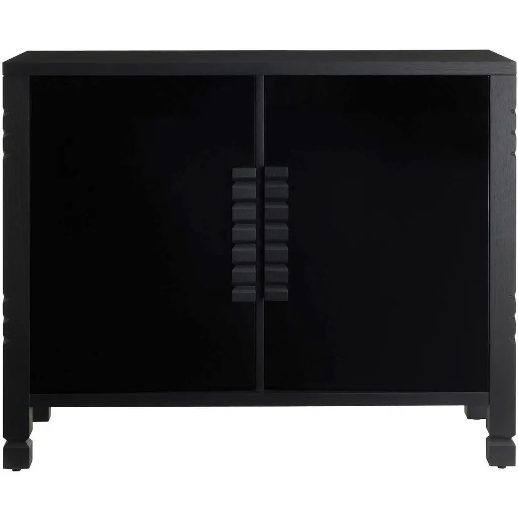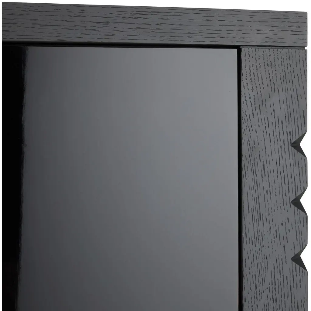 The juxtaposition of the ebony oak veneer and high-gloss black lacquer adds a pleasing mix of textures to our Jericho Cabinet. Accented with wood hardware cut to resemble traditional tribal motifs, it is an elegant addition to the hall or accent piece. Single adjustable solid oak wood ebony interior shelf.