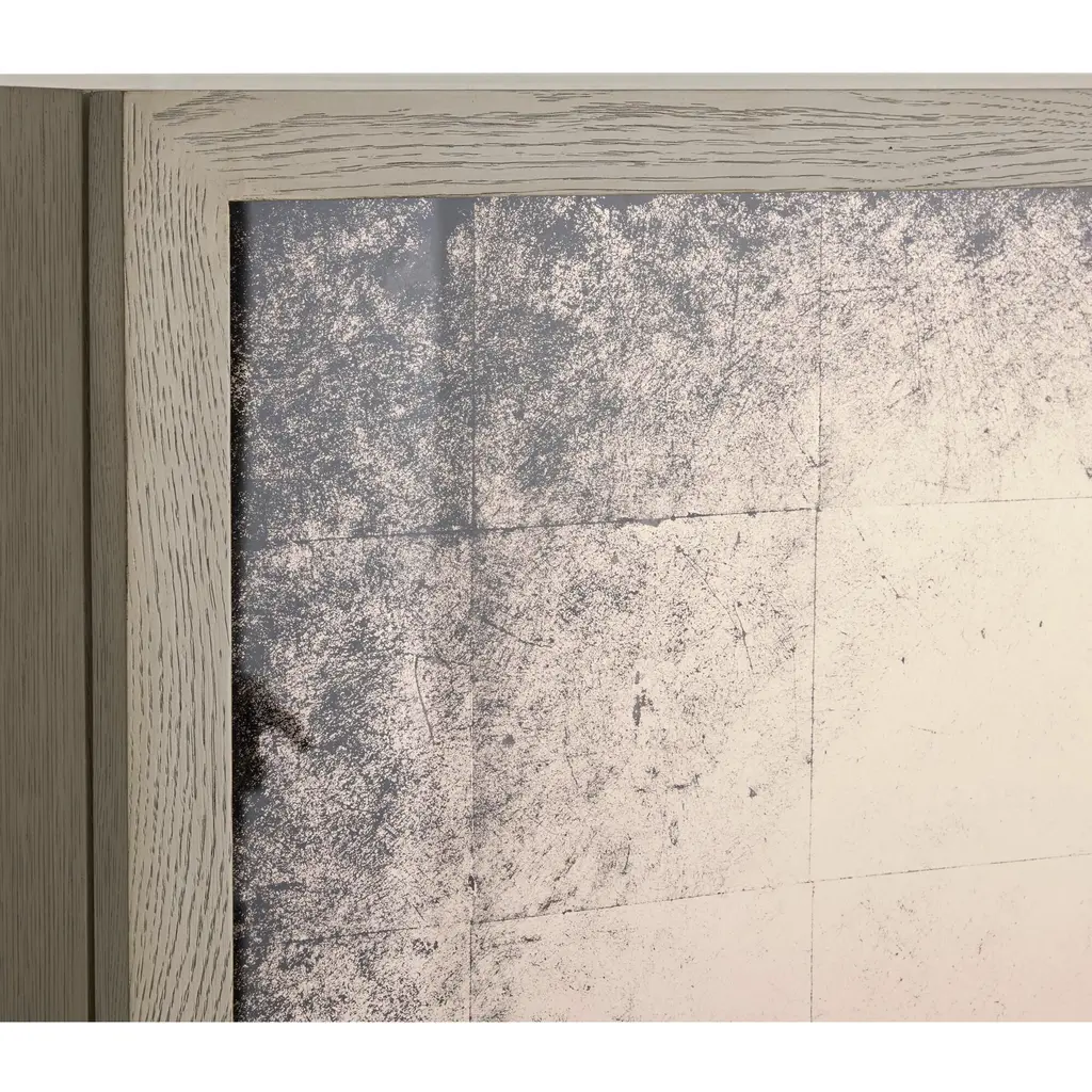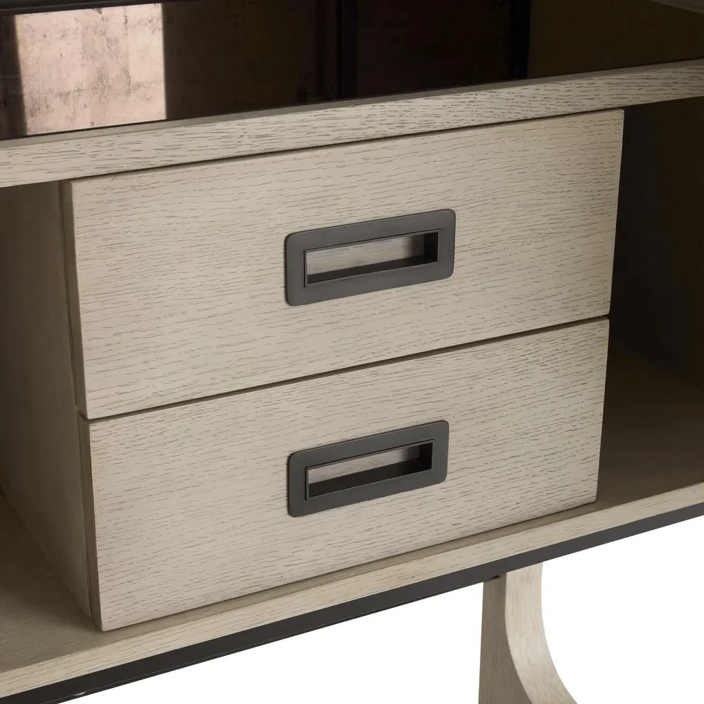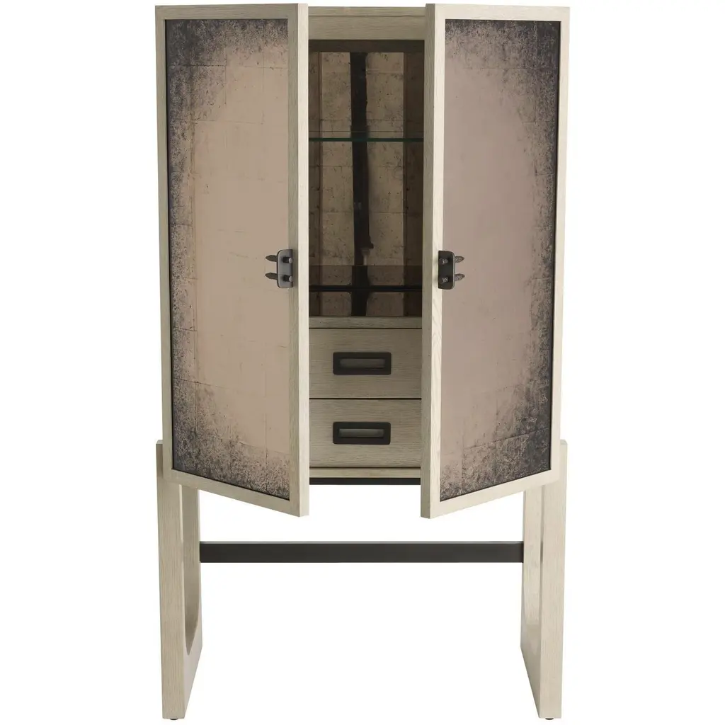 Our alluring cabinet is inlaid with an églomisé antiqued amber mirror front to appear darker along the edges and lighter at the center. The elevated case of smoke oak wood features a U-shaped cutout at the legs to add an airy finish. Double spear pulls of bronze iron appear to pierce the surface, while a matching iron bar at the back pulls the silhouette together. Double soft-close doors open to reveal an LED-lit clear glass prep surface and mirrored interior to showcase a chic cocktail glassware collection. Finish will vary.
