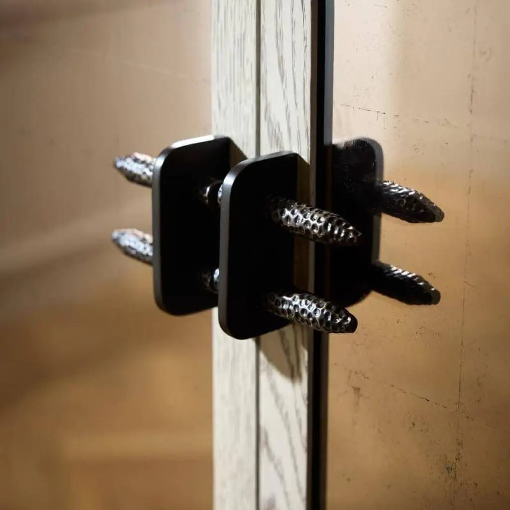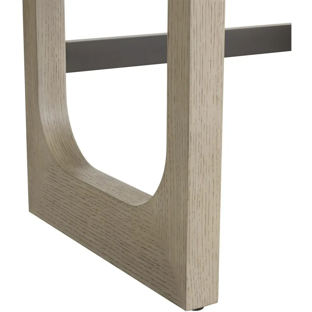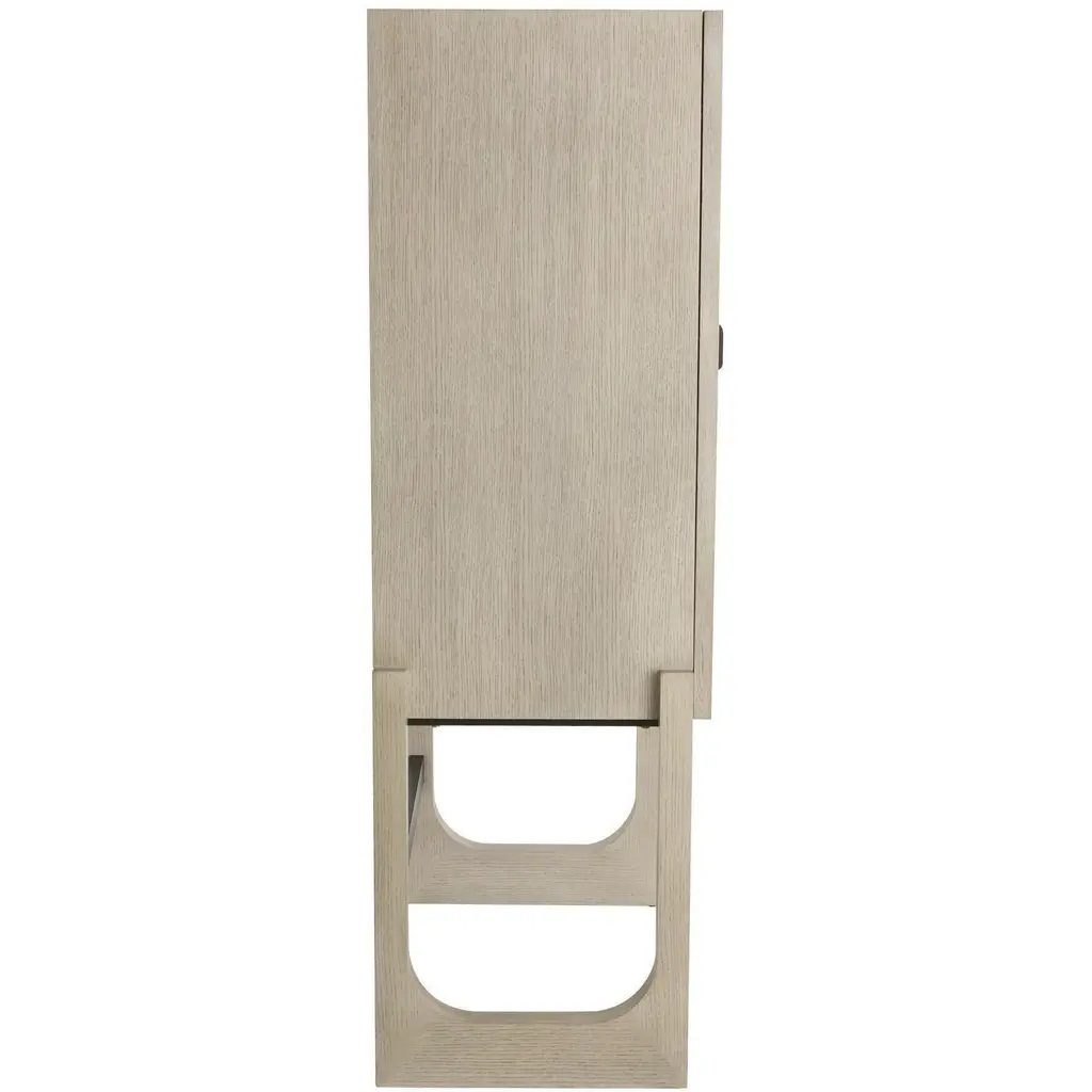 Our alluring cabinet is inlaid with an églomisé antiqued amber mirror front to appear darker along the edges and lighter at the center. The elevated case of smoke oak wood features a U-shaped cutout at the legs to add an airy finish. Double spear pulls of bronze iron appear to pierce the surface, while a matching iron bar at the back pulls the silhouette together. Double soft-close doors open to reveal an LED-lit clear glass prep surface and mirrored interior to showcase a chic cocktail glassware collection. Finish will vary.