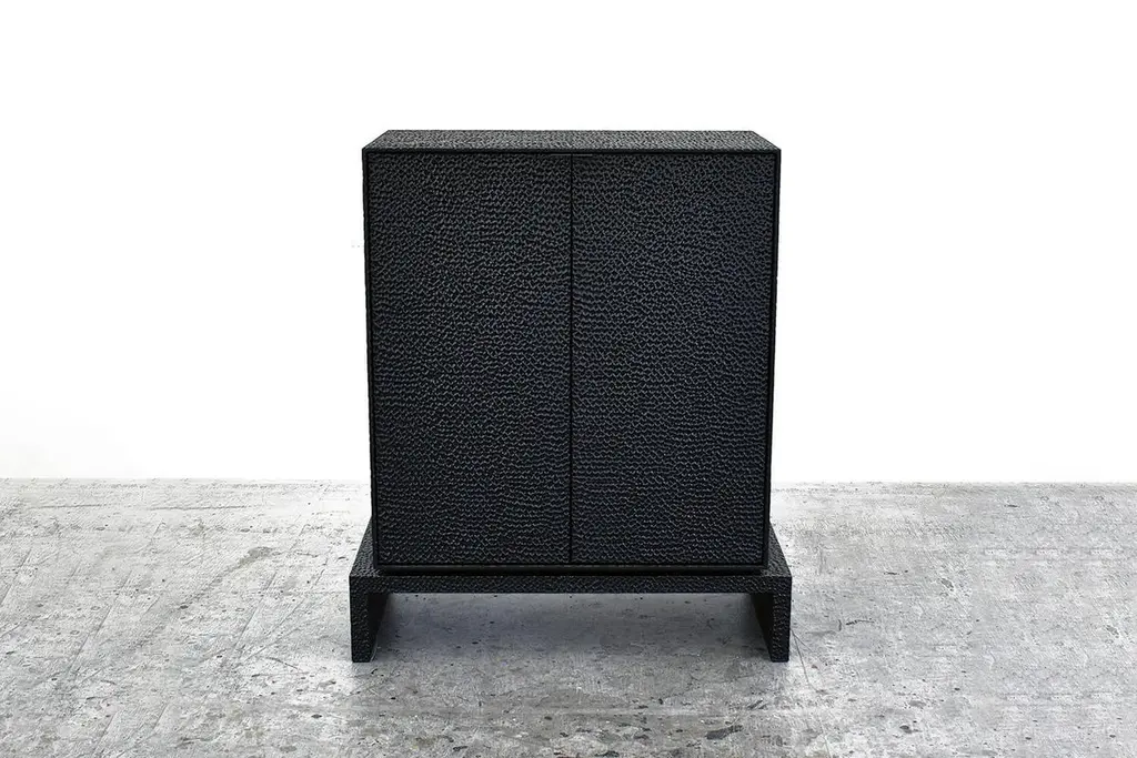 These cabinets merge bold, modern geometries with traditional craft. The wood is hand-sawn and lacquered with a distinctive textured pattern to give a sophisticated finish to a simplified silhouette.John Eric Byers is an artist/designer/craftsman who works exclusively with wood. The wood medium to Byers is like clay to a potter; he transforms the material through exceptional care and thoroughness, hand-tooling the surface and creating something completely unique. His works succeed due to somewhat of a contradiction. While the forms are strikingly geometric and minimal, they are contrasted with the superb craftsmanship and intricacy he brings to the material's outer surface. As noted by Grace Glueck in the New York Times, "The carved, patterned surfaces add considerable interest to his simplified forms, as does his exquisite attention to detail." A former student of Wendell Castle, John's work is guided by purity of form, structure, and surface texture, as well as a great respect for the materials he works with.John Eric Byers is an American artist with works in the permanent collections of the Museum of Arts and Design in New York and the Smithsonian American Art Museum in Washington, D.C. Numerous awards include the Louis Comfort Tiffany Foundation Award and inclusion in the Smithsonian's Archives of American Arts.John Eric Byers, "V4", Cabinet.