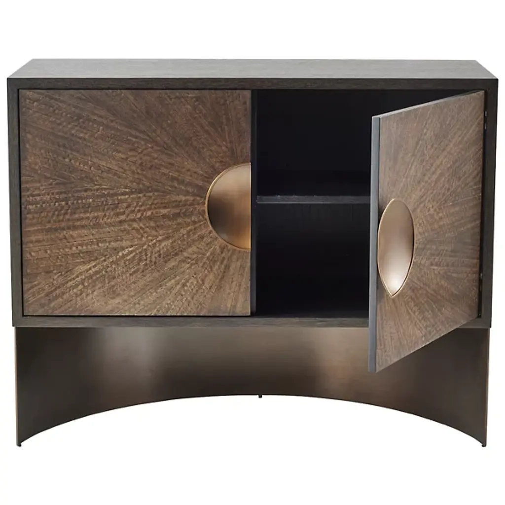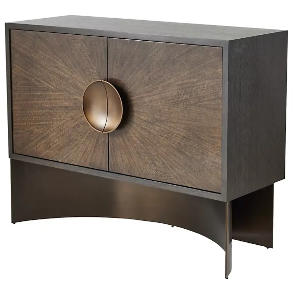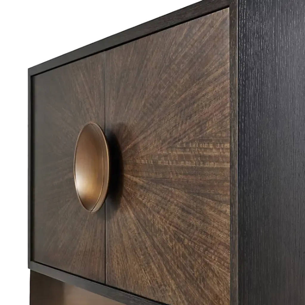 Rich and striking, the John Short Cabinet from Arteriors features doors embellished with dual iron antique brass pulls. Highlighted by a Deco-inspired radial eucalyptus veneer pattern in brindle finish, it captivates attention in any setting. The cabinet rests on a rounded base with flowing metal planes, offering an airy yet grounded quality. Inside, a single adjustable shelf provides practical storage. With each piece showcasing unique variations in finish, this cabinet combines elegance and functionality with timeless appeal.