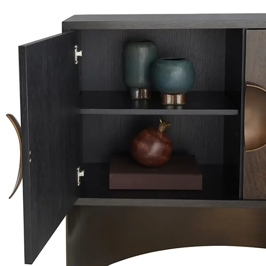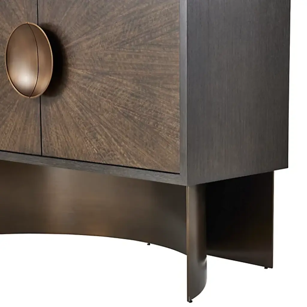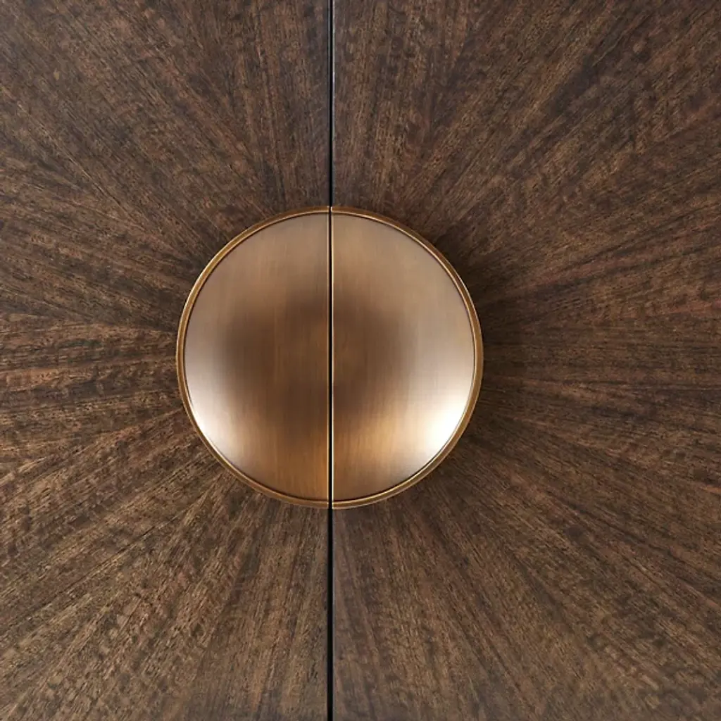 Rich and striking, the John Short Cabinet from Arteriors features doors embellished with dual iron antique brass pulls. Highlighted by a Deco-inspired radial eucalyptus veneer pattern in brindle finish, it captivates attention in any setting. The cabinet rests on a rounded base with flowing metal planes, offering an airy yet grounded quality. Inside, a single adjustable shelf provides practical storage. With each piece showcasing unique variations in finish, this cabinet combines elegance and functionality with timeless appeal.