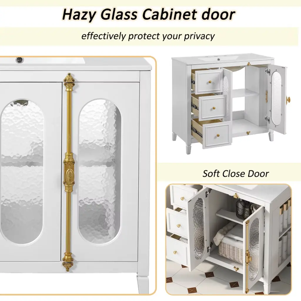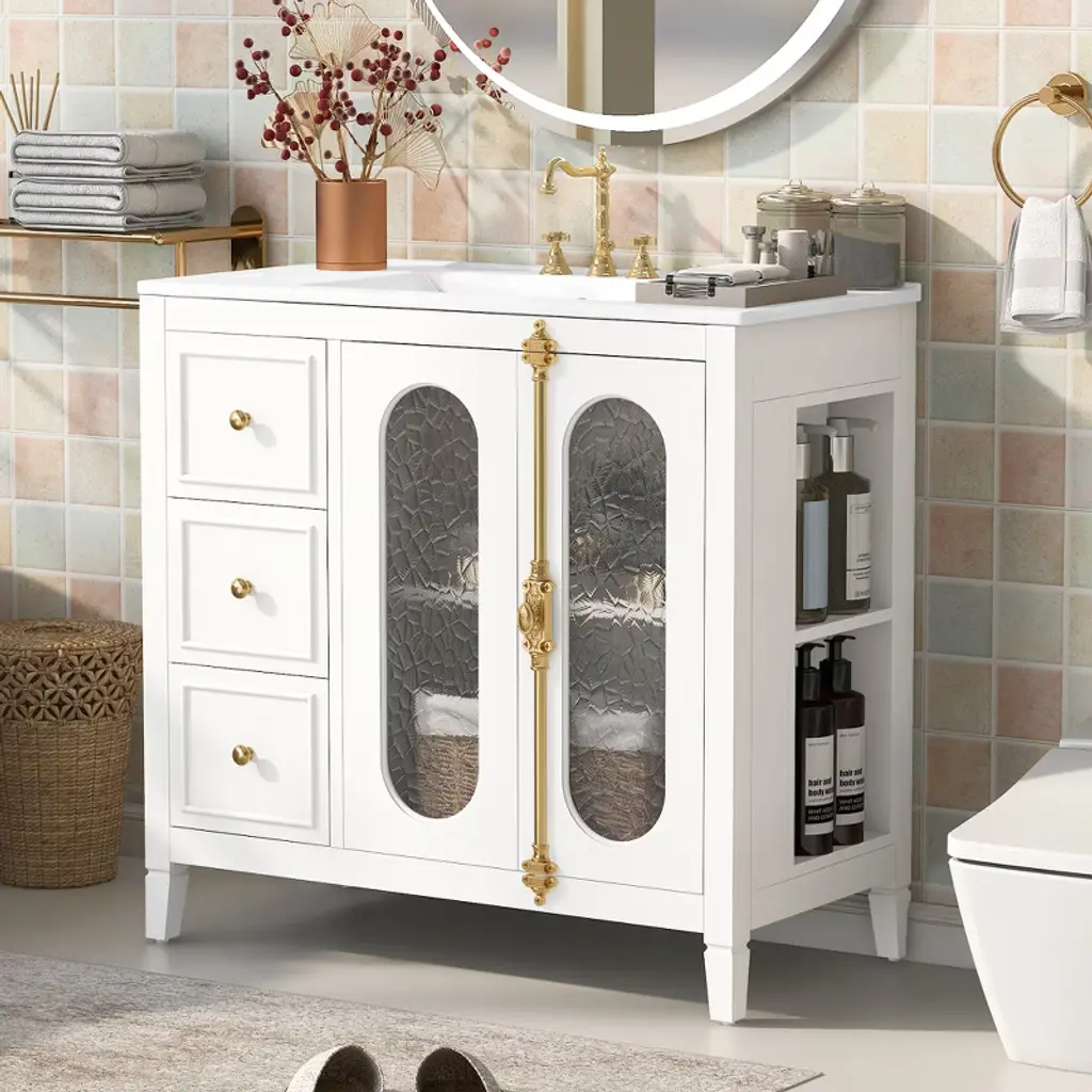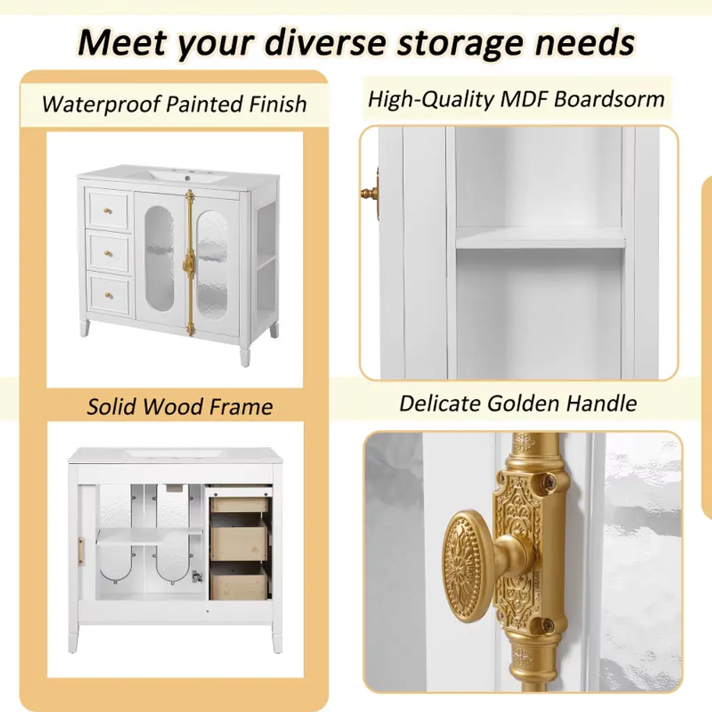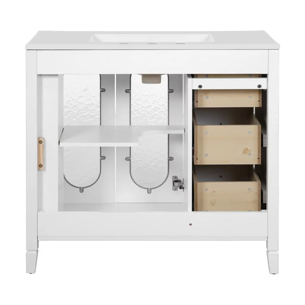 This 36-inch modern bathroom vanity offers a stylish blend of elegance and functionality, solid wood frame, and translucent patterned glass doors that add a bright and airy feel. It includes three fully pull-out drawers and a spacious cabinet, providing ample storage for toiletries and daily essentials. The integrated ceramic sink offers a smooth, stain-resistant surface that’s easy to clean and built to last. Crafted from durable MDF with a moisture-resistant painted finish, this cabinet is ideal for long-term bathroom use. With a wall-mounted design and all hardware included, installation is straightforward and convenient.