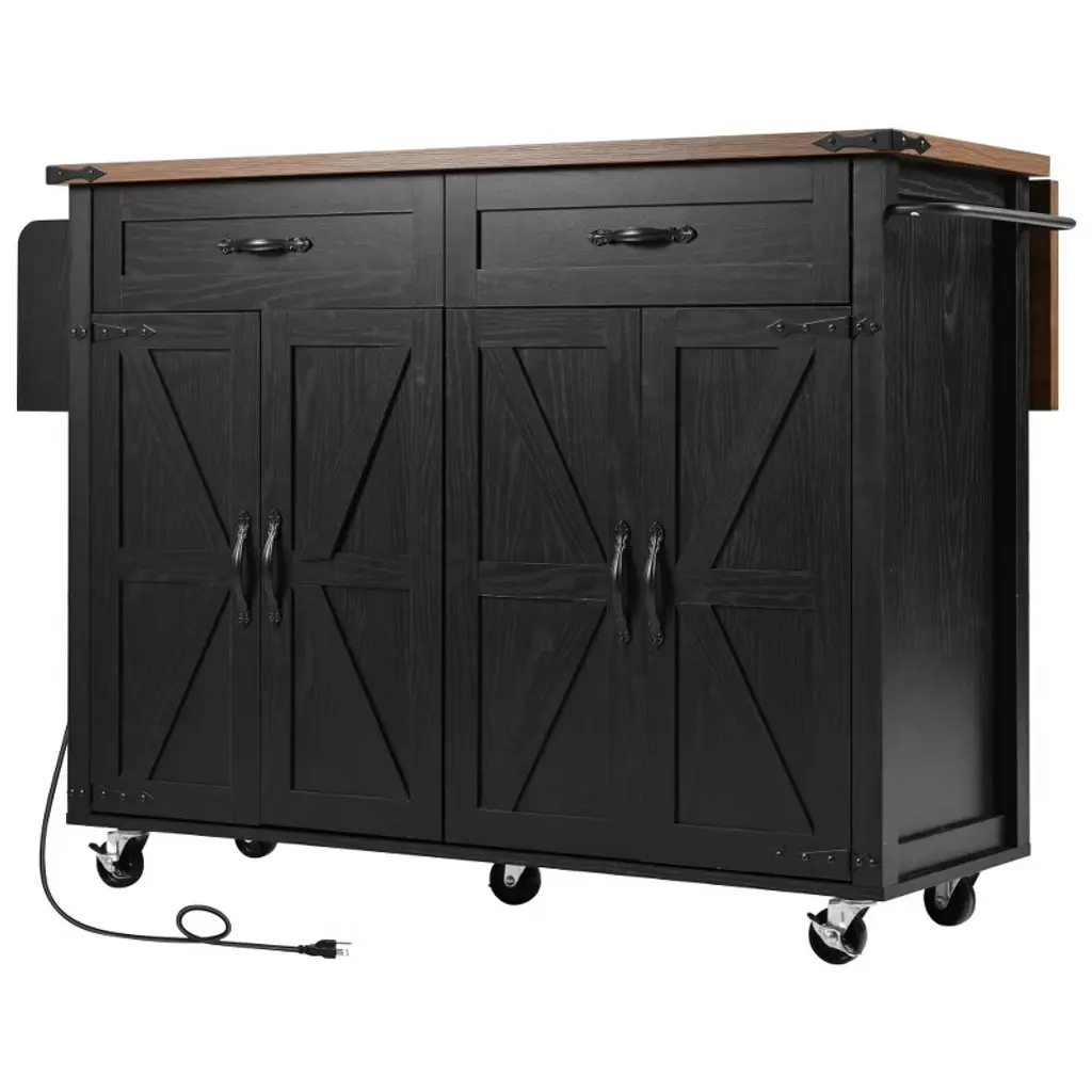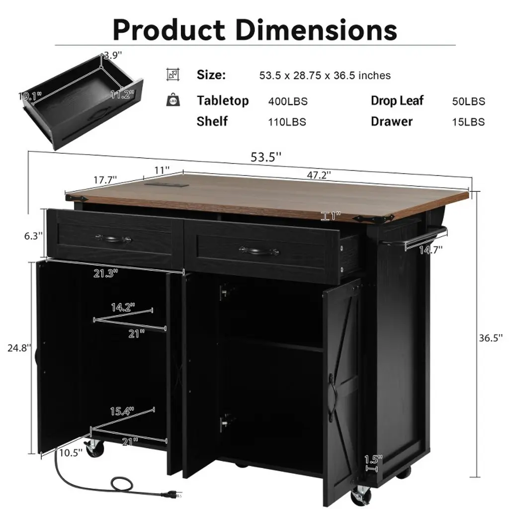 Jujabu 53.5''farmhouse Kitchen Island With Power Outlet, Drop Leaf, Spice Rack And Drawer, Black