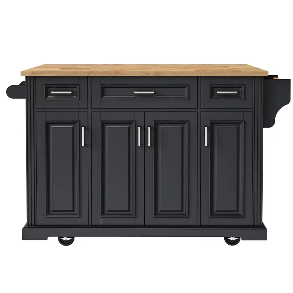 Jujabu 54'' Large Kitchen Island With Rubber Wood Drop Leaf, Rolling Cart With Embossed Texture, 4 Wheels, 4 Doors & 3 Drawers, Black