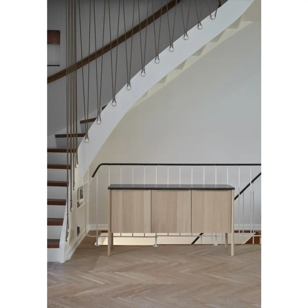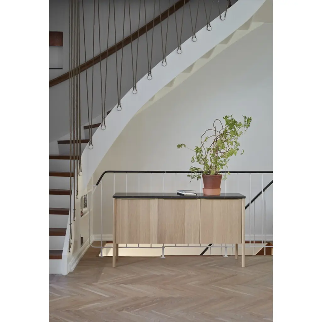 Designed by Thomas Jenkins for Skagerak, Jut is a sophisticated cabinet for storing tableware, clothes, office supplies, and other necessities. The frame is crafted from oiled oak, the handles are in brass, and the tabletop is made of beautiful marble. The space behind the right and mid doors is divided by a removable shelf, and the room behind the left door has been left empty. The combination of luxurious materials and smart design makes Jut both a practical storage cabinet and an eye-catching design object. Please note that the cabinet's height was updated in 2021.