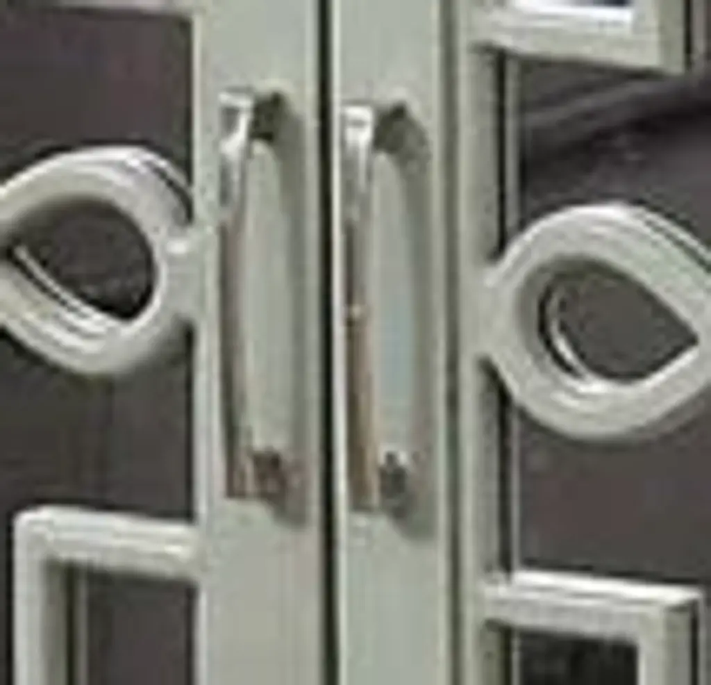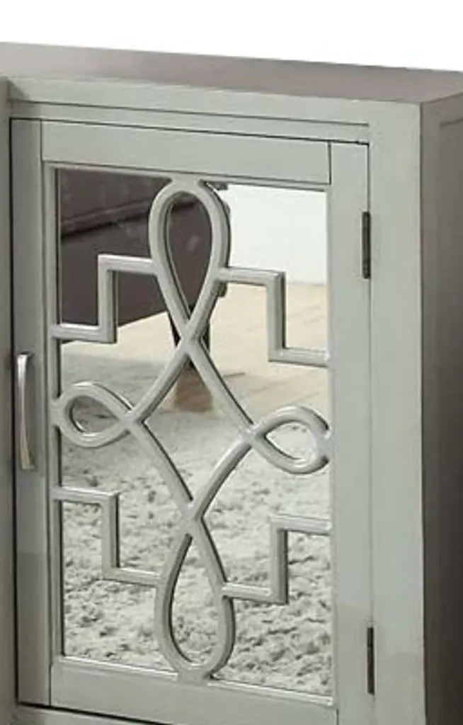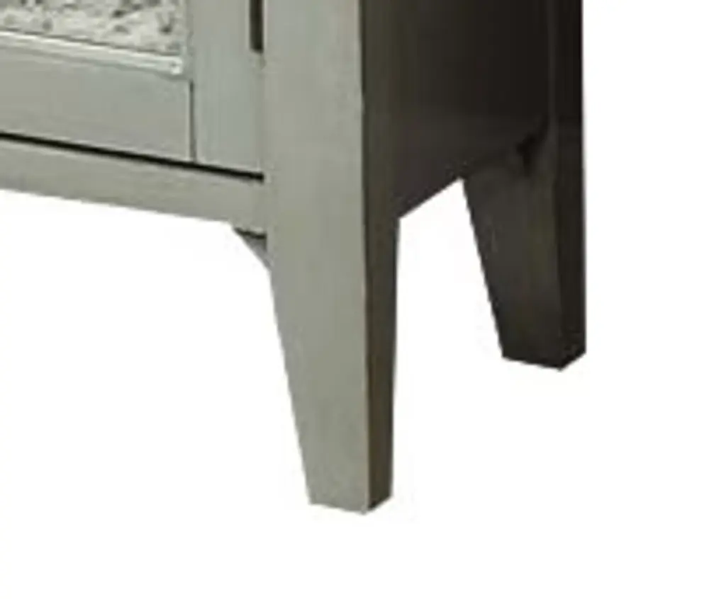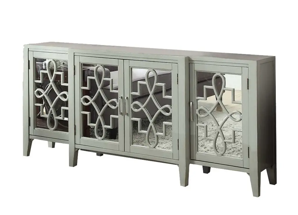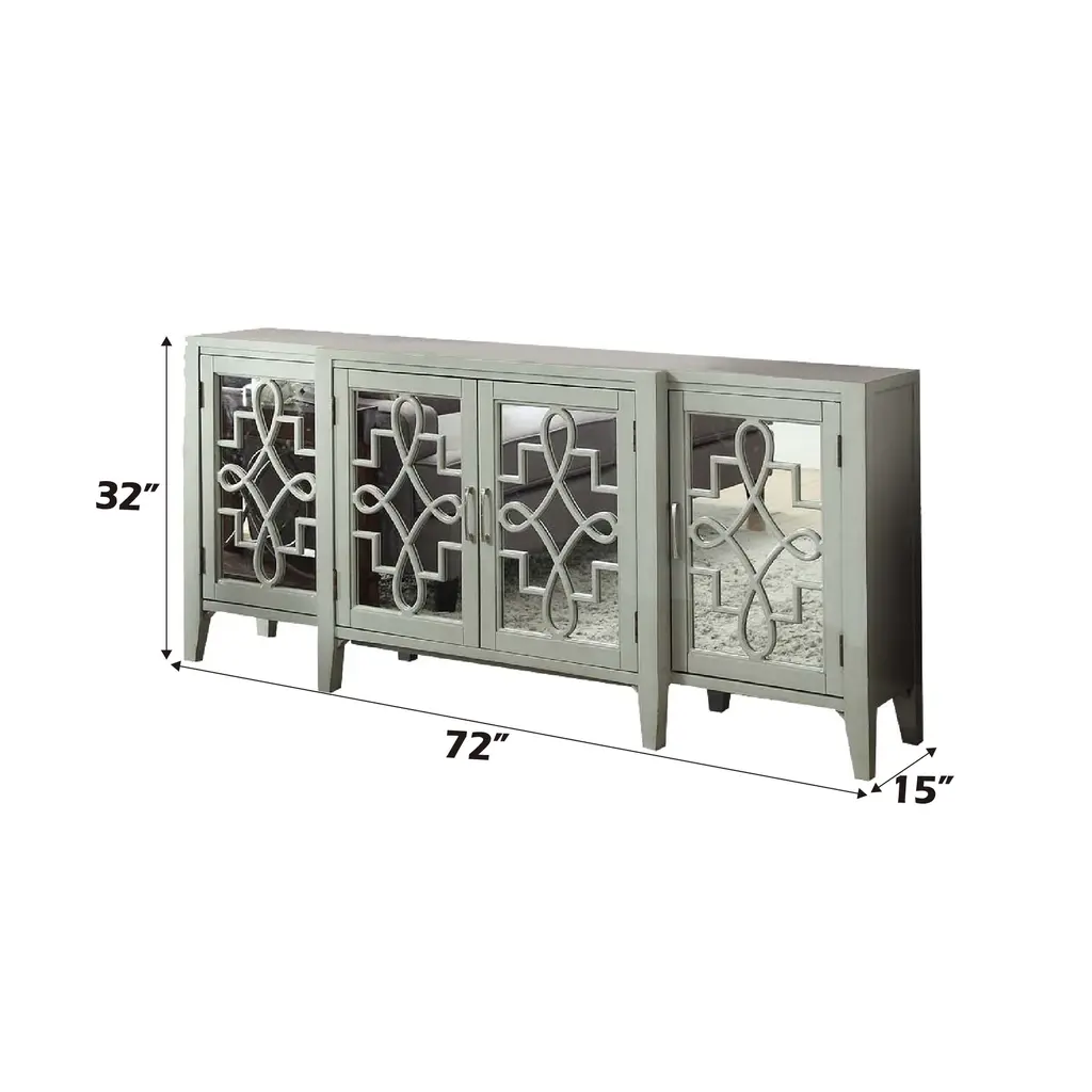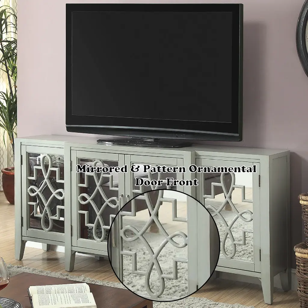 Assembled, 4 Door Cabinet, Each Door w/1 Shelf Inside, Front w/Gray MDF Ornamental Detail, Tapered Leg: Solid Hardwood, Rest MDF. Large Capacity Storage: 4 Doors Storage (w/4 Shelves), Texture Increased Design: Mirrored & Pattern Ornamental Door Front, Durable & Long-Lasting Structure: Solid Wood & Composite Wood, Versatile Storage Cabinet for Various Scenes: Console/TV Stand/Server. Material: Wood, Mirror, Composite Wood, Wood Leg (Solid Wood), MDF. 4 Doors Storage (4 Shelves Included), Weight Limit (Top): 70lbs, (Shelf): 60lbs