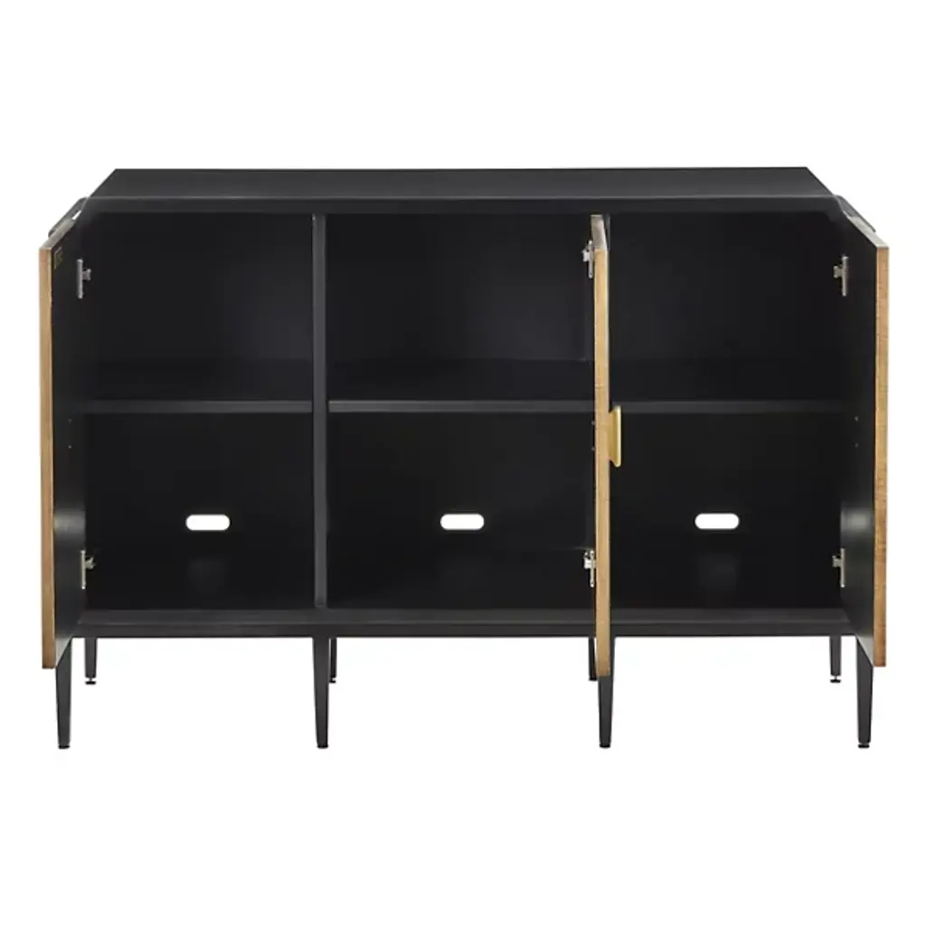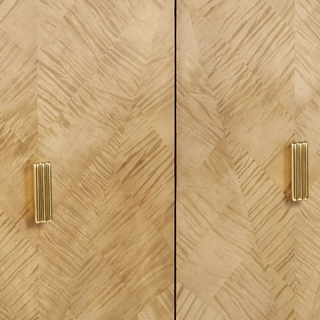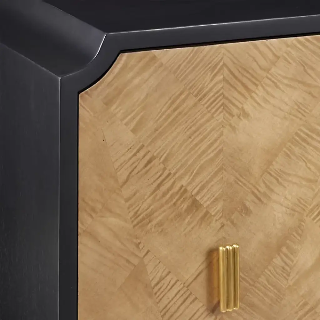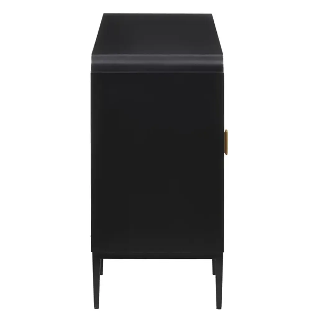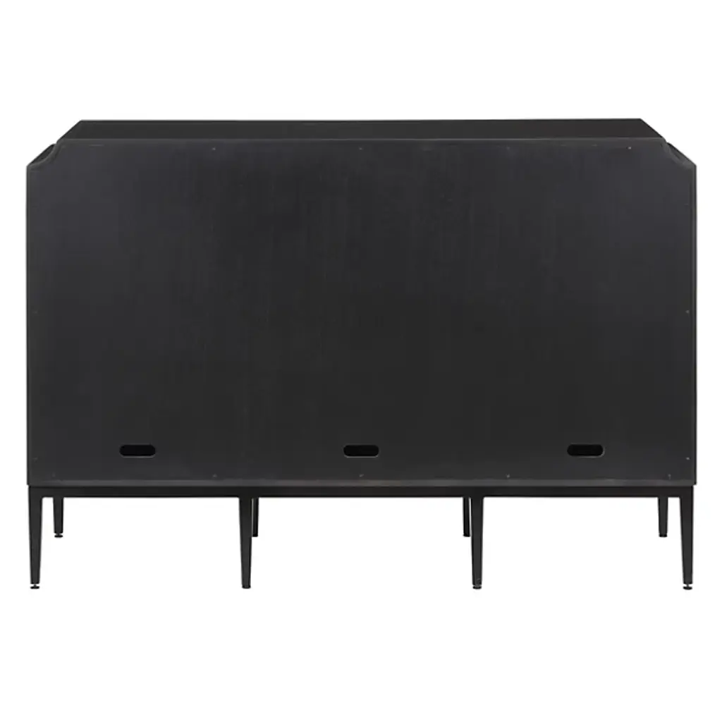 The Kallista Cabinet from Currey & Company is a study in material contrasts and refined storage solutions. Its exterior, finished in rich tones, provides a dramatic backdrop for door fronts adorned with figured sycamore veneers. This juxtaposition creates an appealing visual tension, with the wood grain adding a hint of organic texture to the piece's sleek profile. Polished brass hardware punctuates the design and the cabinet's functionality is enhanced with soft-close doors and cord management features.