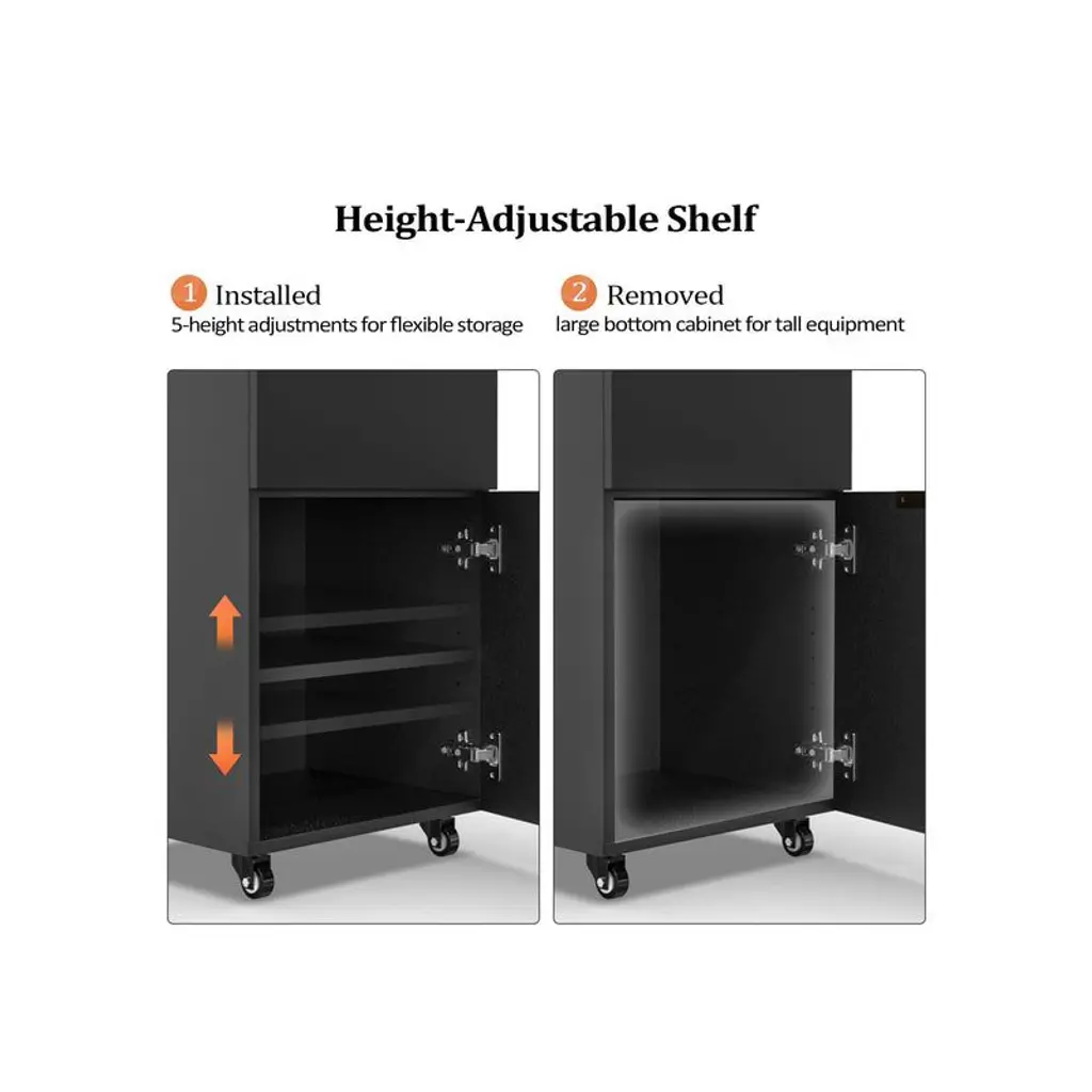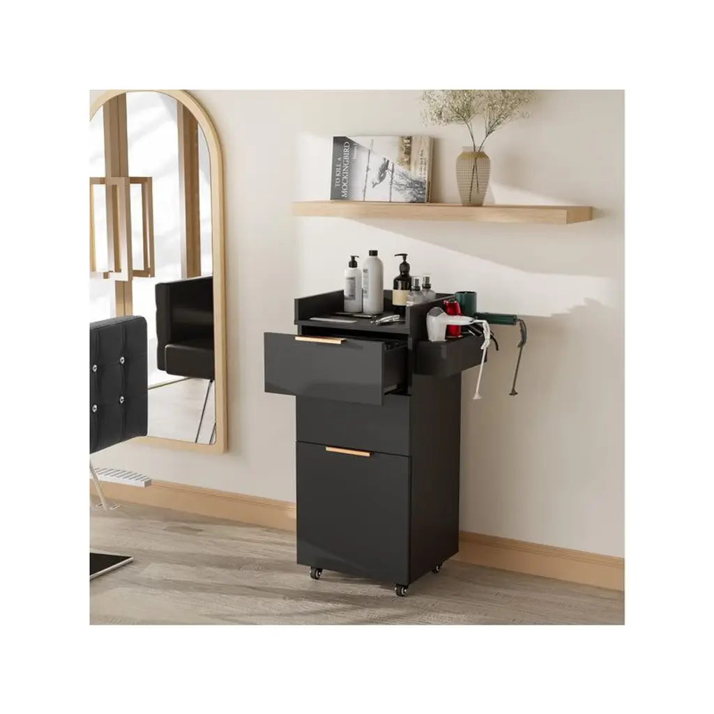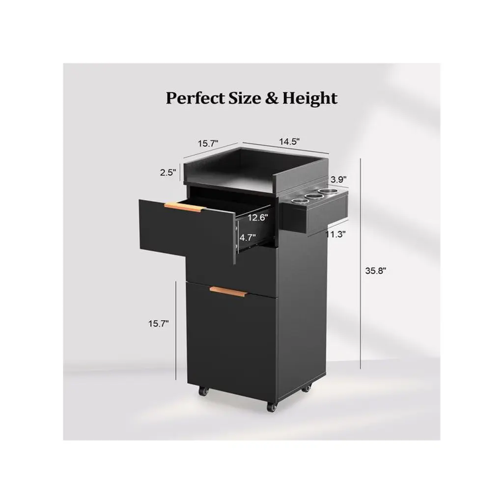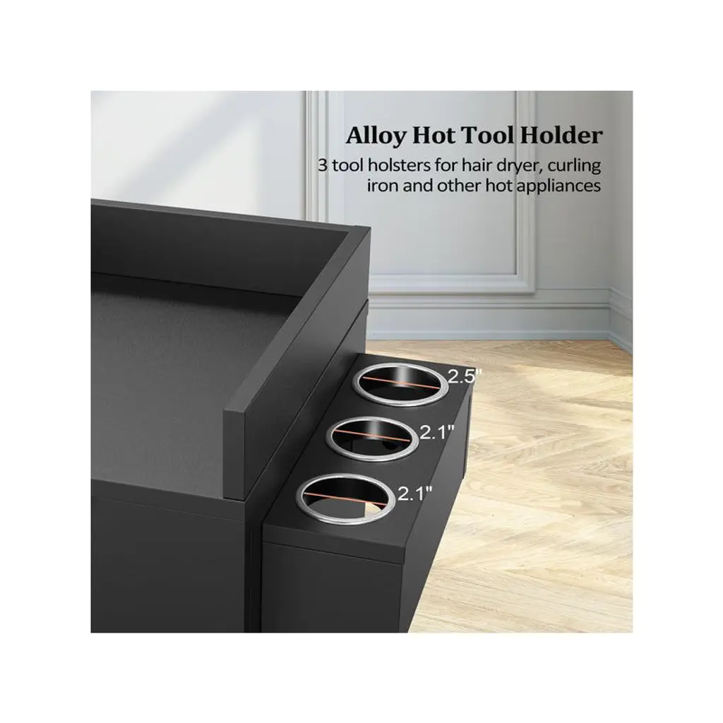 Featuring a robust construction and a durable wood exterior, this luxurious mobile salon station includes two spacious pullout drawers, a big bottom storage cabinet, a built-in appliance holder, and a compact streamlined body design. Easy to assemble with clear instructions.