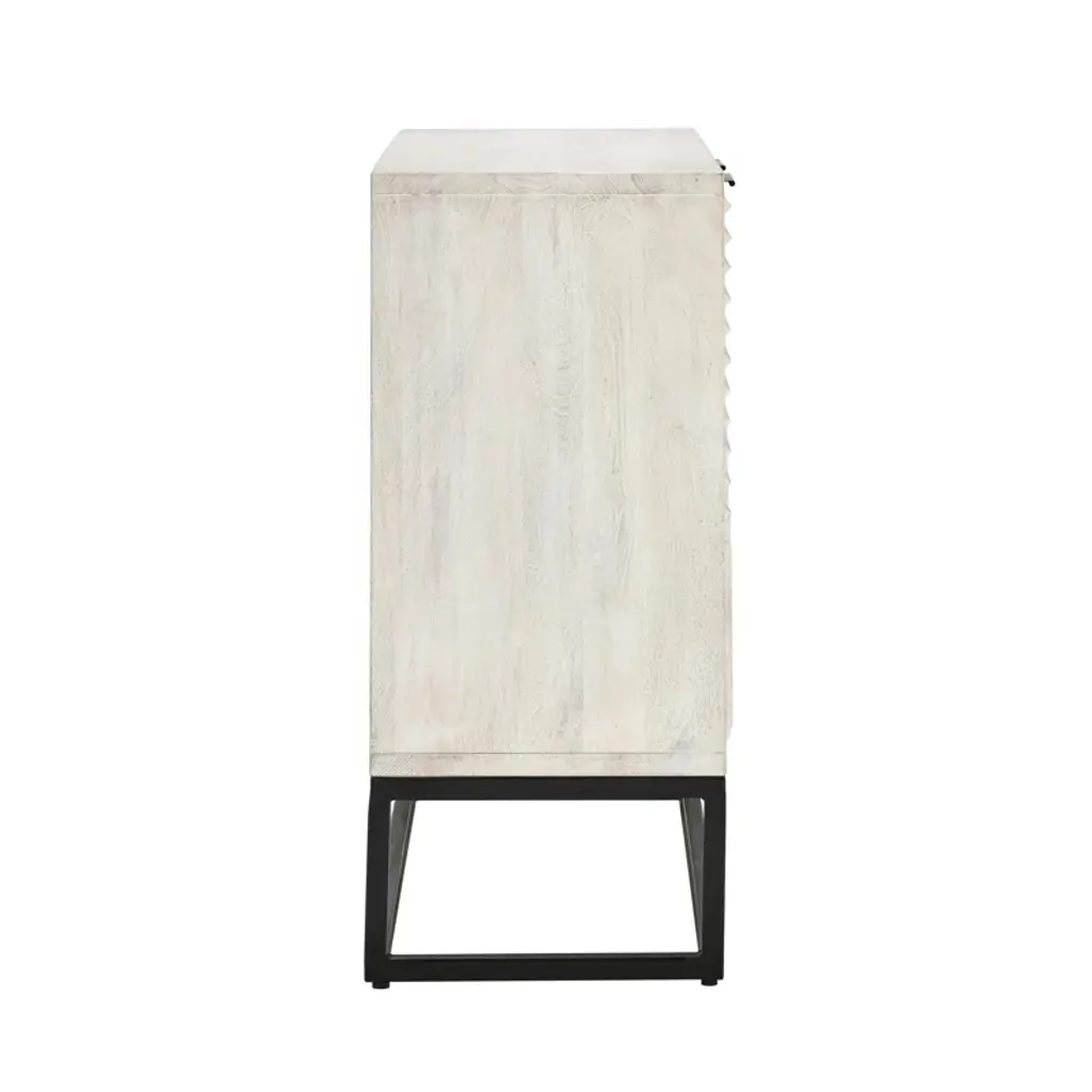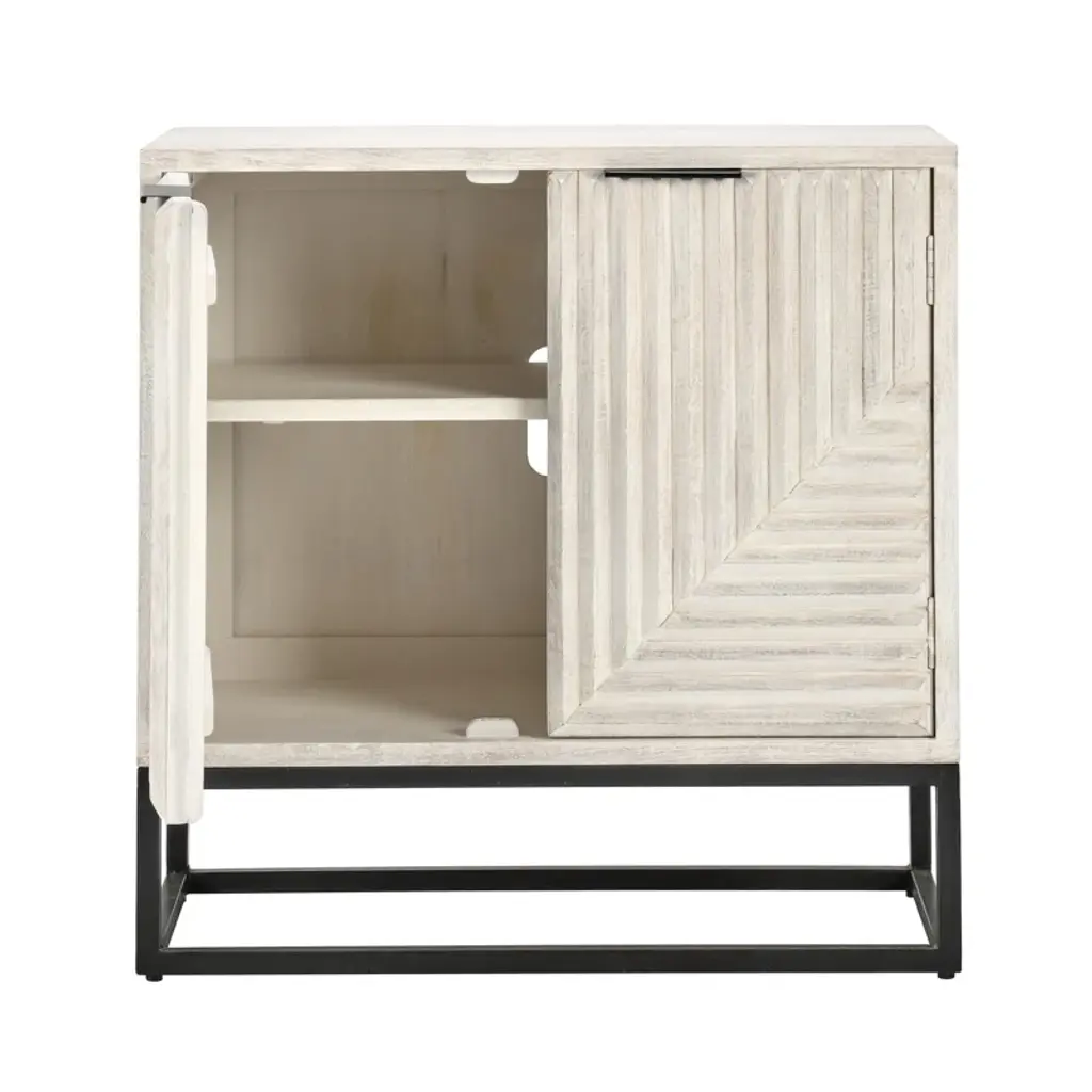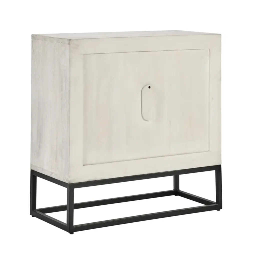 Modern marvel. Featuring an iron base and solid wood top, our cabinet brings industrial edge to your space. Two doors open to reveal spacious shelves, perfect for storing dinnerware, books, or decor. With built-in cable management, it's also an ideal spot for your media console. The sleek design pairs well with various styles, offering a versatile addition to any room. Note: tipover restraint device not included.