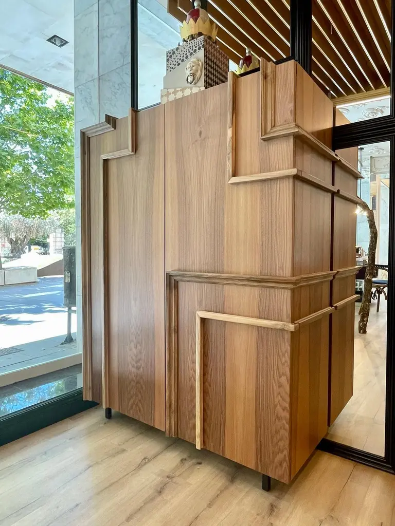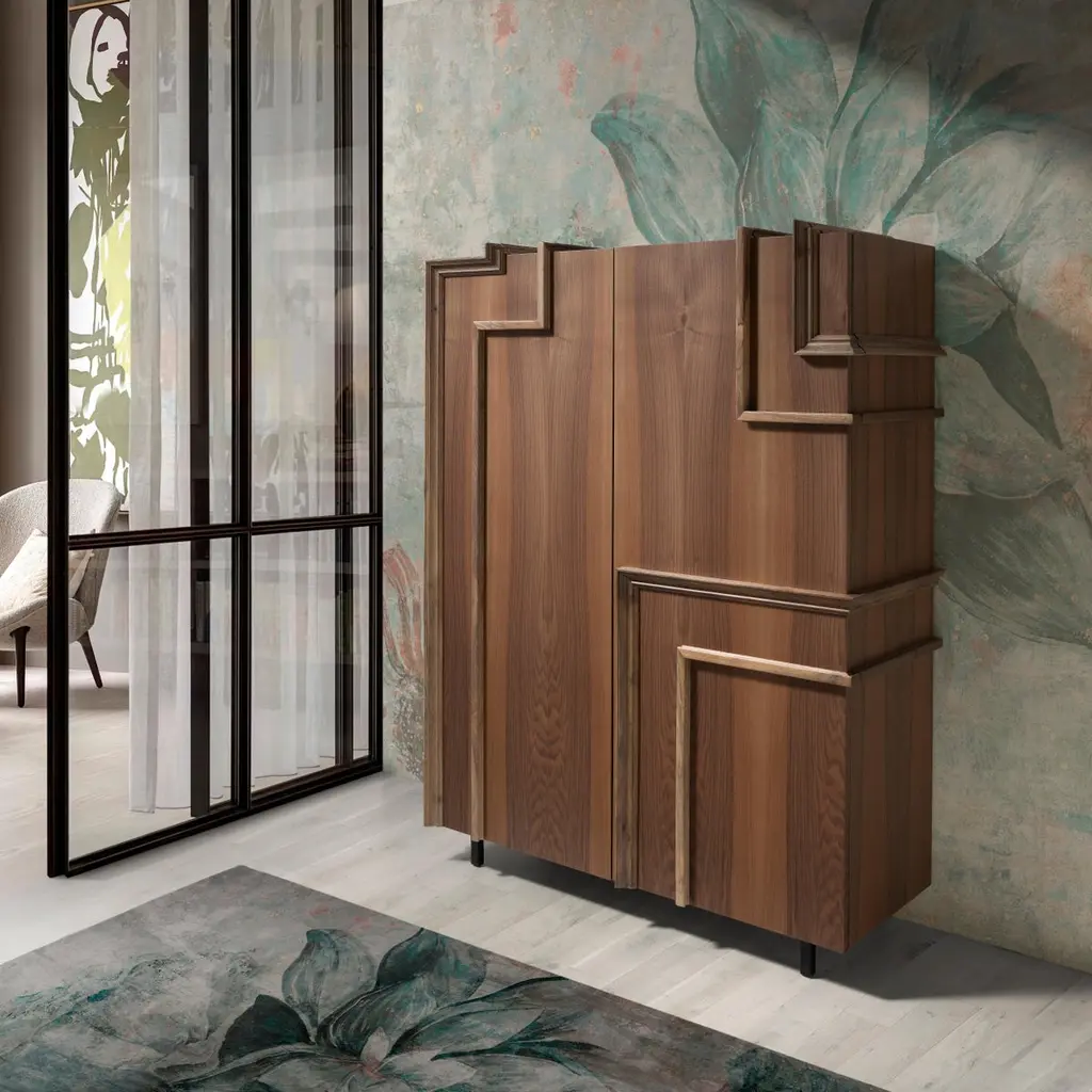 Khalo Wooden Cabinet by Lola GlamourDimensions: D 45 x W 120 x H 150 cmMaterials: Wood.It has a walnut wood skin and a set of relief moldings that run along its body and direct our gaze. Its timeless design and quality construction ensure it is a long-lasting and appreciated addition to your home.The Khalo series are design pieces that evoke sophistication and good taste. With two doors and six shelves, it not only provides a functional storage solution; It also becomes a focal point of elegance, adding a touch of class to your space.We are Félix and Désirée Ramos, brothers and product designers of our brand, Lola Glamour.We are interested in the singular, the different, the beauty, and the balance of color and materials. We have the ability to observe and the ability to translate any beautiful object into a piece of furniture.We are proud of having created our own style, a way of understanding design, which allows us to tell stories and connect with the souls of people and spaces.Lola Glamor is a Spanish company from Soria, which has designed and manufactured unique furniture in noble woods, with artisanal construction and extraordinary finishes since 1995. Artistic furniture that is customized in size and finish according to the client's needs.We offer original furnishing solutions for professionals and individuals from any country in the world, mixing materials, volumes, motifs, and colors that achieve their own style.We are, above all, the sum of a team of people who contribute their dedication and commitment to a unique level of demand, detail, and quality.