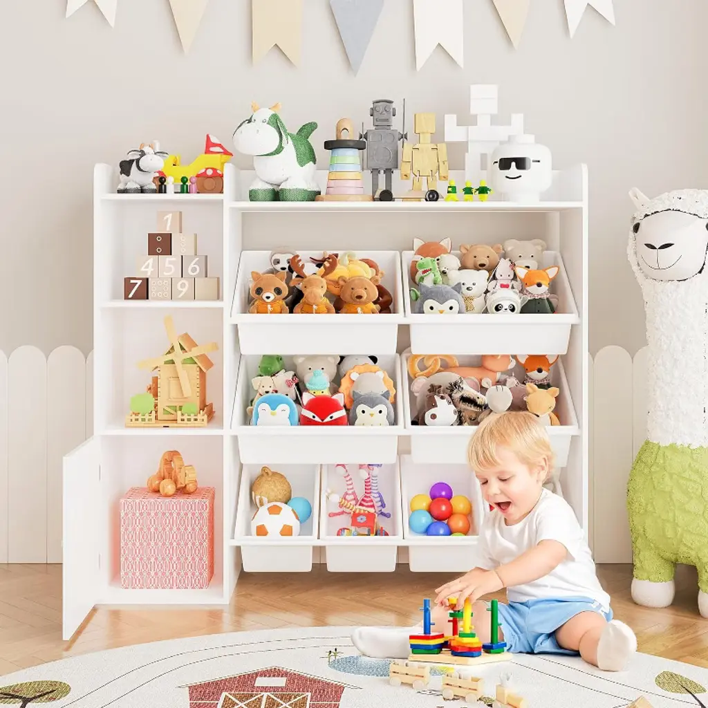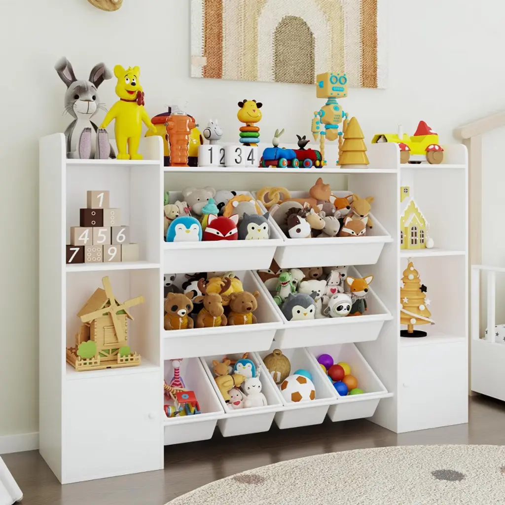 Create an orderly and inviting space with the Kids Toy Storage Organizer, a 43.5” wide multi-functional unit crafted from durable engineered wood. Designed to accommodate busy families and educators, it features 8 removable fabric bins (4 large and 4 small) for toys and supplies, 3 open shelves for book display, and a floor-level enclosed cabinet with doors to safely store larger items and keep dust at bay.Safety remains top priority thanks to the included heavy-duty metal anti-tip kit that anchors the unit securely to the wall, preventing accidents during active play. The upgraded floor cabinet is 2 inches taller, improving dust protection and making it easier to clean underneath. With a compact footprint, this stylish organizer fits effortlessly in bedrooms, playrooms, classrooms, or living areas.Key Features:Materials: Engineered wood frame, fabric bins, metal hardwareDimensions: 43.5"W x approx. 12"D x 47"HCapacity: Holds 50-80 toys and 30-50 booksCare: Wipe wooden surfaces with a dry cloth; spot clean fabric binsRecommended for: Kids 3+, homes, classrooms, daycare centersAssembly: Tool-free 20-minute setup with included instructionsBacked by a 1-year limited warranty against manufacturer defects, this organizer delivers both safety and convenience for a clutter-free environment.