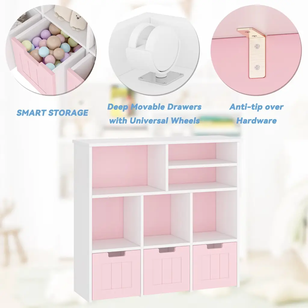 Product Description Featuring 6 compartment cabinets and 3 movable drawers, this toy organizer efficiently stores books, toys, and art supplies, keeping kids' rooms tidy. The spacious top surface accommodates lamps, alarm clocks, photos, and decor, adding both functionality and style to any room.Product informationSize: 39.4"L x 13"W x 35"HItem Weight: 85.98 poundsColor: Pink + WhiteMaterial: Wood + PlasticPackage List 1 x Toy Storage CabinetNotes:Different displays may cause the color of the item in the picture a little different from the real thingManual measuring,please allow 1~3cm error,thank you.