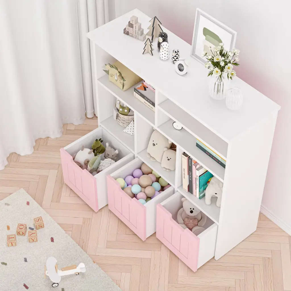 Kids Toy Storage Organizer With 3 Movable Drawers And 6 Storage Cubbies For Living Room, Playroom, Nursery, Bedroom, White And Pink