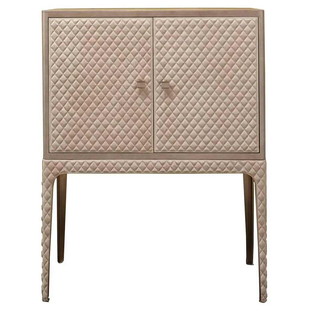 This stunning cabinet will be a versatile and precious addition to a modern home, where it will provide any room with storage space, while also adding elegant texture and a sophisticated allure to a wall. The wooden base boasts a natural oak finish. Its legs have brass tips and their horizontal top is adorned with an exquisite carved decoration. The top features four doors and is covered in a grey oak finish with an inlaid perimeter. The two top doors open into a yellow-lacquered interior with one glass shelf. The two lower doors hide six drawers with their front covered in yellow leather.