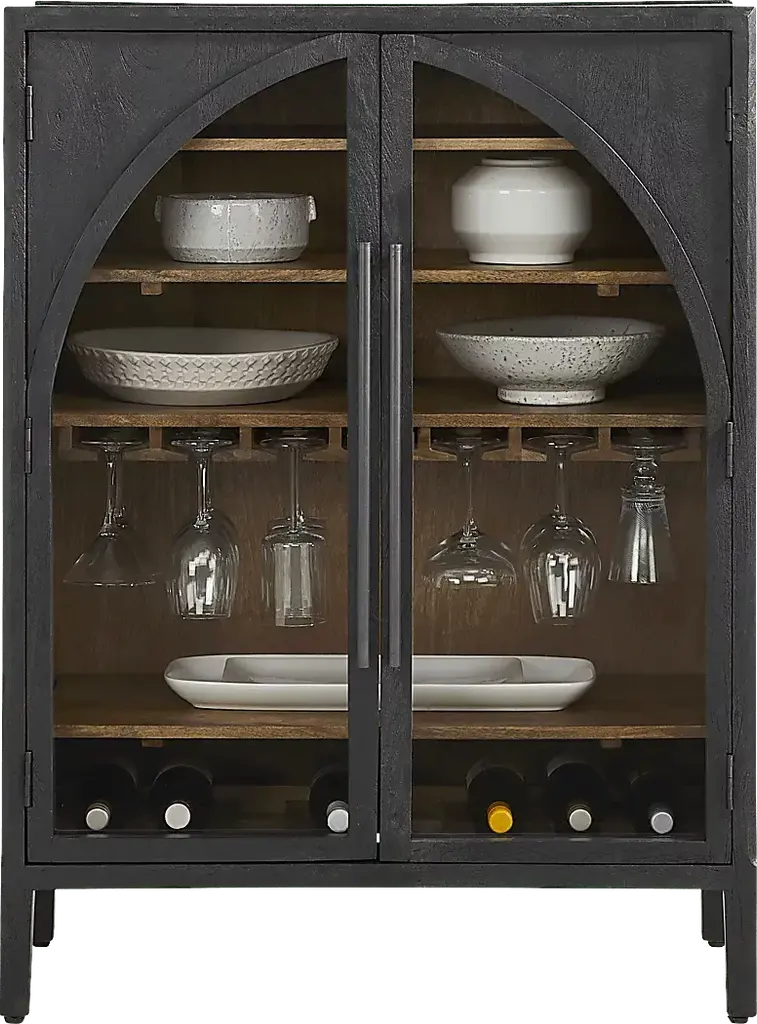 The quiet sophistication of a curated gallery blends with easy modern dining in the King's Road wine cabinet's sculptural silhouettes and balanced design. Its architectural charm comes to life through its symmetrical arched glass doors, brought into focus by a bold two-tone finish. The rich black exterior frames each curve with dramatic contrast, while the warm natural brown interior adds depth and dimension. Behind the cabinet doors, four spacious shelves offer room for dinnerware and decorative accents, while the wine glass rack on the third shelf provides room to hang your favorite glassware. Elongated metal pulls in black enhance the clean lines and complete the piece with elevated simplicity.