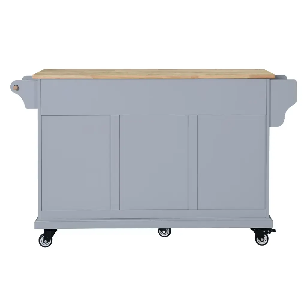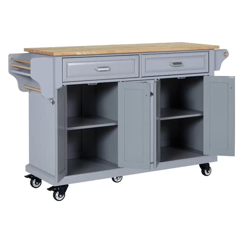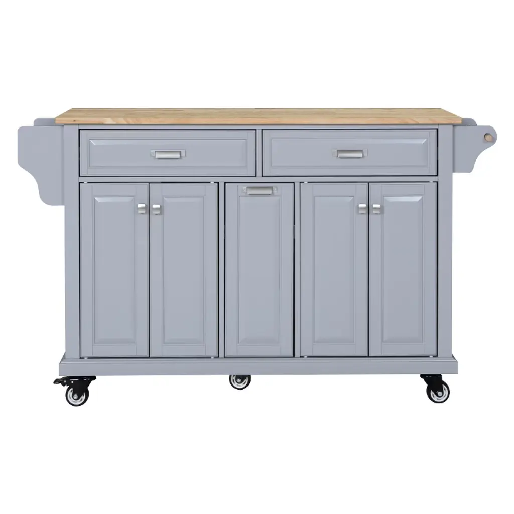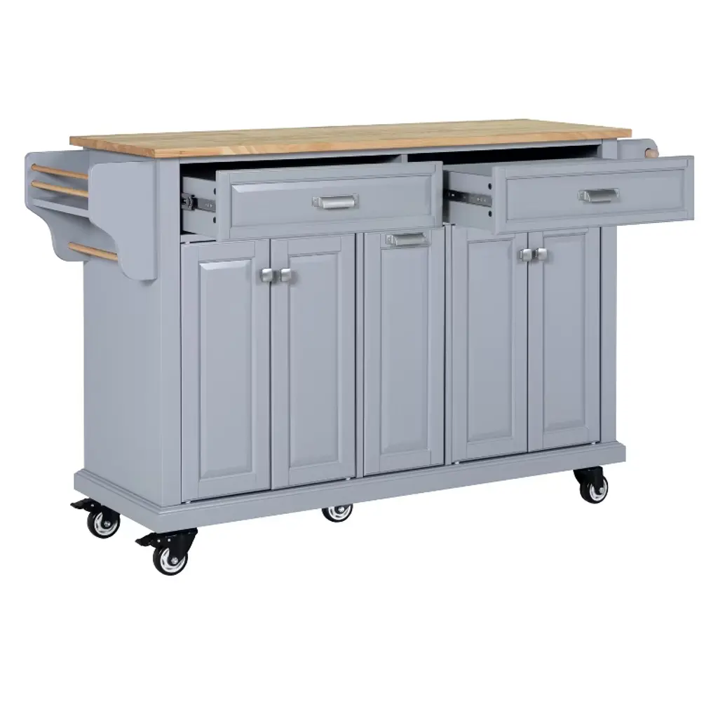Kitchen Island With Rubber Wood Countertop, Kitchen Cart On 5 Wheels With Storage Cabinet And 2 Top Drawers And A Center Double Layered Storage Drawer