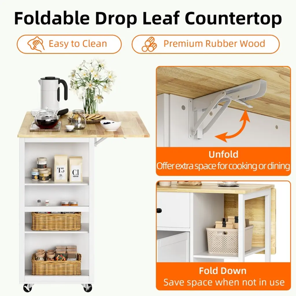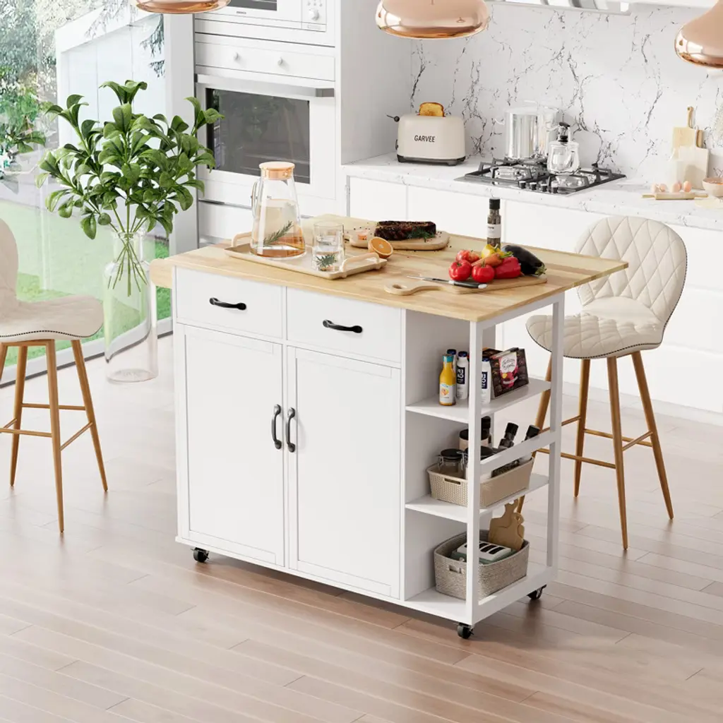Product DescriptionFeaturing an elegant five-layer wine rack, this kitchen island offers a sophisticated storage solution for your favorite wine bottles, perfect for entertaining or relaxing after a long day. Keep your culinary essentials organized with a three-layer spice rack and a towel holder, ensuring everything you need is always within easy reach. Maximize your kitchen space with versatile storage options including two spacious cabinets and two top drawers, ideal for pots, pans, utensils, and more. The expandable drop leaf adds extra workspace or dining area, making meal preparation and gatherings more efficient and enjoyable. Crafted with a durable rubber wood top, this kitchen island cart is built to last and easy to maintain. Mobility is effortless thanks to four smooth-rolling wheels, with two lockable wheels providing stability when you need it most during cooking or serving. Assembly is simple and straightforward with clear instructions and labeled parts, allowing you to quickly set up your new kitchen island. Made from hardwoods and engineered wood, this mobile kitchen island is the perfect addition to any kitchen looking for style, organization, and practicality.Product InformationProduct Dimensions: 49.21"D x 20.87"W x 8.27"HShelf Type: Tiered ShelfFrame Material: Rubber WoodColor: WhiteFurniture Finish: Painted, WhiteStyle: ModernAssembly Required: YesNumber of Shelves: 2Item Weight: 104.7 poundsMaterial: MDF+Rubber WoodPacking List:1xKitchen Island Cart1xInstructionNote:Carefully follow the installation instructions when assembling. Before beginning the installation process, ensure that you have all the parts and tools you need.Ensure that the kitchen island cart is placed on a flat surface to avoid tilting or rolling. If necessary, anti slip pads can be used to increase stability.