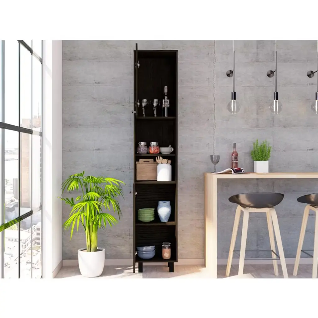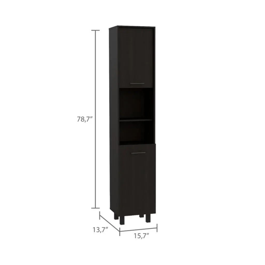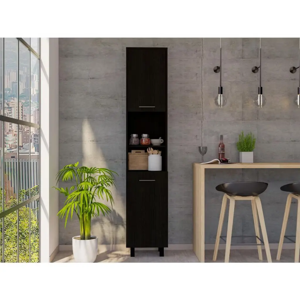 Kitchen Pantry 79" H, Two Open Storage Shelves, Three Internal Shelves, Two Doors, Four Legs, Black