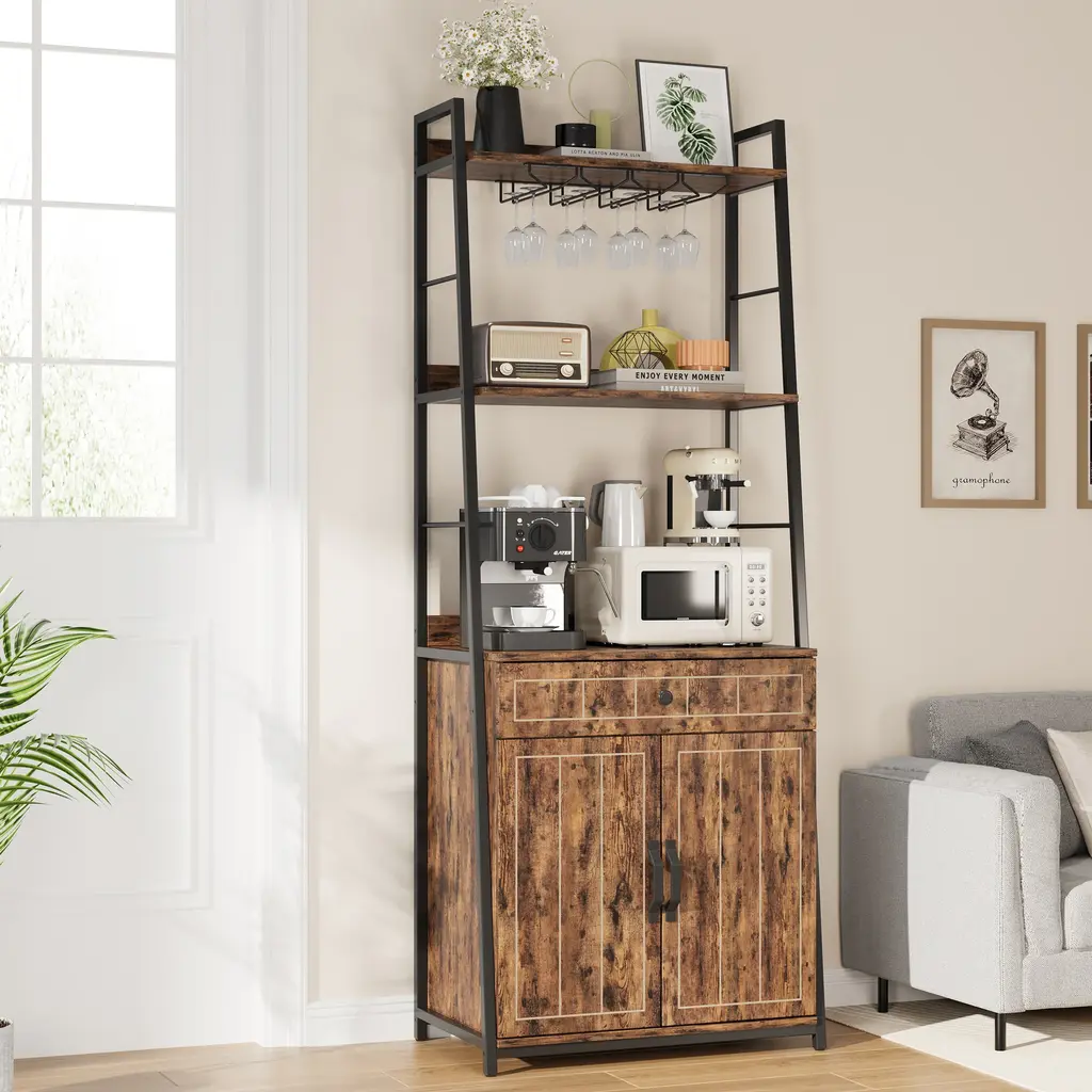 [Various storage space] Our 5 Tier Bakers Rack features two spacious open storage shelves ideal for keeping kitchen appliances easily accessible, along with a smaller open shelf designed for neatly organizing bottles and cans. The equipped glass holder offers extra space for placing your goblets. Additionally, this microwave rack is equipped with a large cabinet and a drawer, providing dust-proof storage space for food, dishes, or other kitchenware. [Trapezoidal Frame Design] This microwave storage rack well blends retro color MDF board with a sleek black metal frame, creating an industrial-inspired aesthetic. The trapezoid design on both sides ensures stability while adding a unique style to the whole microwave rack. The fusion of vintage charm and Trapezoidal design complements various interior styles, adding character and sophistication to your living space. [Versatile Baker Rack] This industrial baker rack ensures your kitchen items are in order. In addition to serving as a microwave stand, coffee bar station, and spice rack organizer, this utility shelf can also be utilized as a home bar for ice buckets, Coffee machines, kitchen gadgets, and small appliances. The multiple storage compartments cater to various needs, providing a convenient space to store and display a range of items. [Sturdy and Safe] Constructed of high-grade MDF board and thickened metal frame, this rustic microwave stand is sturdy and stable for long-lasting use. The load-bearing capacity of up to 150 lbs is enough to support coffee makers or large microwave ovens, juicers, etc. Besides, with the adjustable feet, this baker rack ensures stability on uneven surfaces, while safeguarding your floors from scratches and providing flexibility in placement.