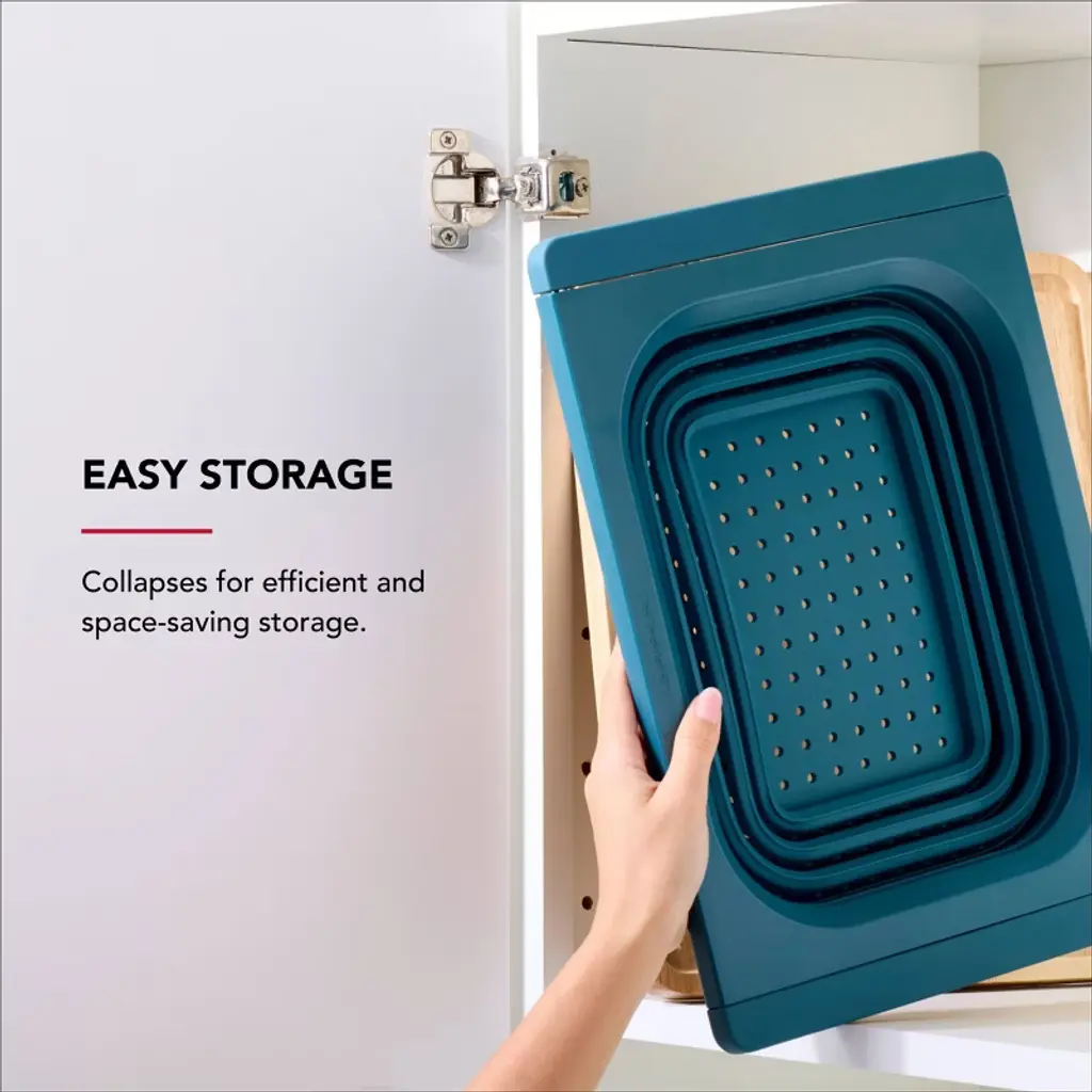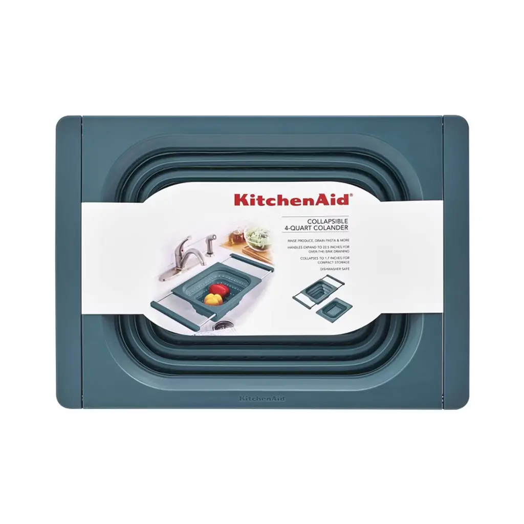 Rinse fruits and vegetables or drain pasta with this KitchenAid Universal Collapsible Colander. This essential tool collapses for efficient and space-saving storage in cabinets, and is made from durable materials that stand up to daily use. The expandable handles allow the colander to securely fit across almost any size sink. Dishwasher safe.
