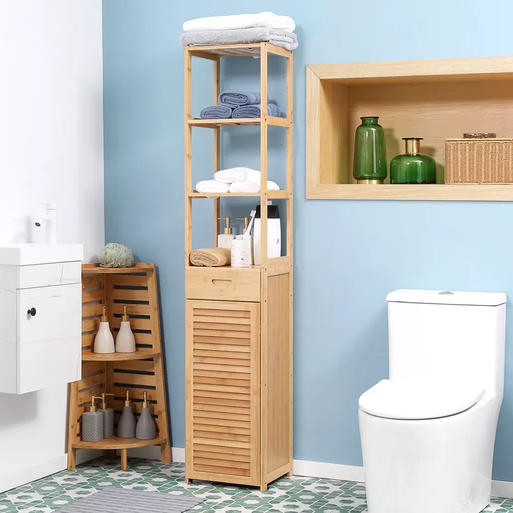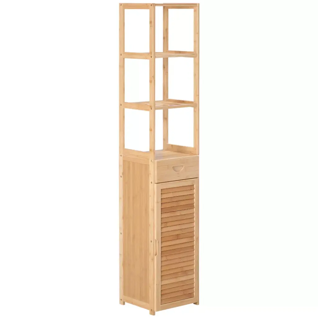 Kleankin Tall Bathroom Cabinet With Drawer And Slatted Shelves, Slim Bamboo Linen Tower With Louvered Door, Natural