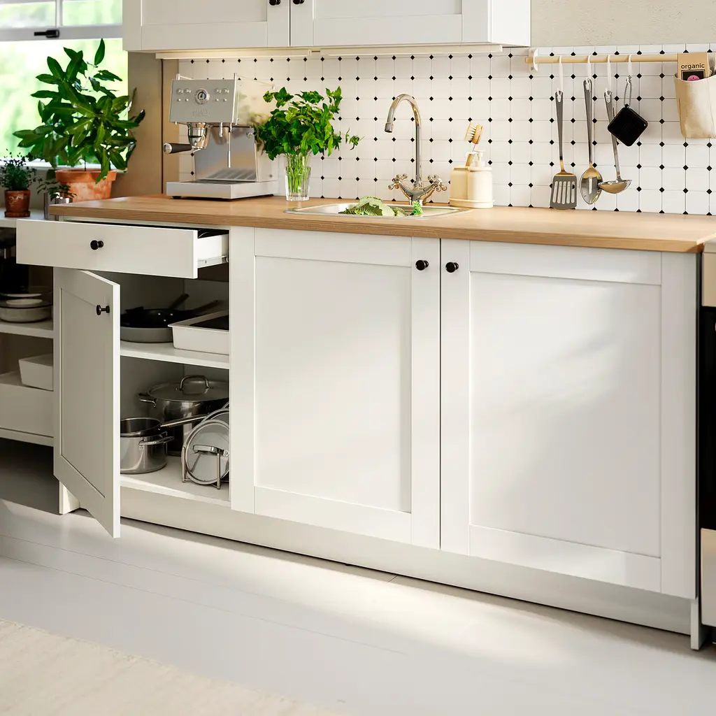 KNOXHULT Base cabinet with doors and drawer - white frame 72x24x36 ". Timeless white framed fronts combined with oak effect worktop creates a welcoming kitchen with a traditional appeal. ¾ drawer extension for good overview and easy access to the content.