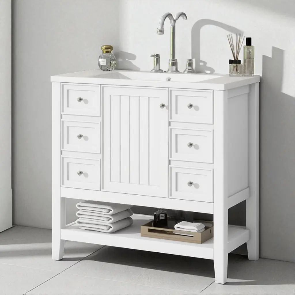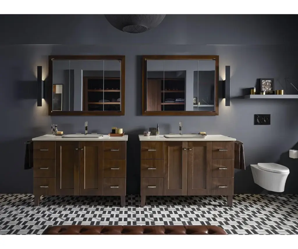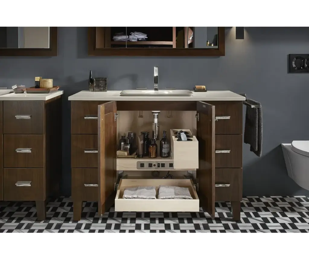 Kohler Tailored Vanities are made to order. Because of this, the vendor does not allow cancellations or returns. Kohler K-99535-LG Features: Vanity cabinet is constructed of solid wood and veneers, providing sturdy function and clean appearance Covered under Kohler's 1 year limited warranty Catalyzed conversion varnish is durable and moisture-resistant Three-way adjustable slow-close cabinet hinges offer 110-degree opening capability Part of the Kohler Tailored Vanities Collection Vanity features 2 full-sized cabinets, providing ample concealed storage space Vanity features 6 full-extension drawers, providing ample concealed storage space - drawers operate on smooth ball-bearing glides with soft-close hardware Vanity top and sink are not included with this model - must be purchased separately Configurable design does not include hardware - pick your own to customize the look of your unit (when adding to cart, hardware will be offered) Solid construction and assembly provide years of reliable performance Product Specifications: Overall Height: 34-1/2" (measured from ground level to highest point of vanity) Overall Depth: 21-7/8" (measured from back edge to front edge of vanity) Overall Width: 48" (measured from left edge to right edge of vanity) Cabinet Installation Type: Free Standing Number of Drawers: 6 Number of Doors: 2 Configuration: Vanity base only - top and sink must be ordered separately (see below for coordinating items) Coordinating Vanity Tops: K-5458: 49" Solid Surface Top with Cutout for Rectangular Verticyl Sink K-5424: 49" Solid Surface Top with Cutout for Oval Verticyl Sink K-5439: 49" Solid Surface Top Without Cutout Coordinating Accessories: K-99679-SH1: Rollout Drawer K-99680-SH1: Rollout Tray K-99677-SH1: Shelf K-99678-SH1: Shelf with Integral Power Strip K-99666: Mirror K-99669: Lap Drawer K-99673: 2-Drawer Bridge K-99684: Drawer Divider Insert K-99681: Power Strip K-99676: Side Kit K-99682: Organizer Tray K-99683: Makeup Tray K-99738: Appliance Tray Variations: K-99535-LG: This model K-99535-LGSD: This model with split drawers K-99535-TK: This model with toe-kick K-99535-TKSD: This model with toe-kick and split drawers