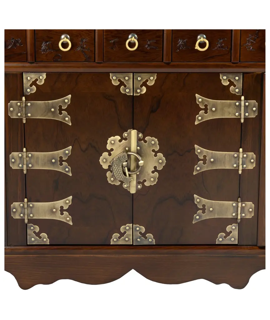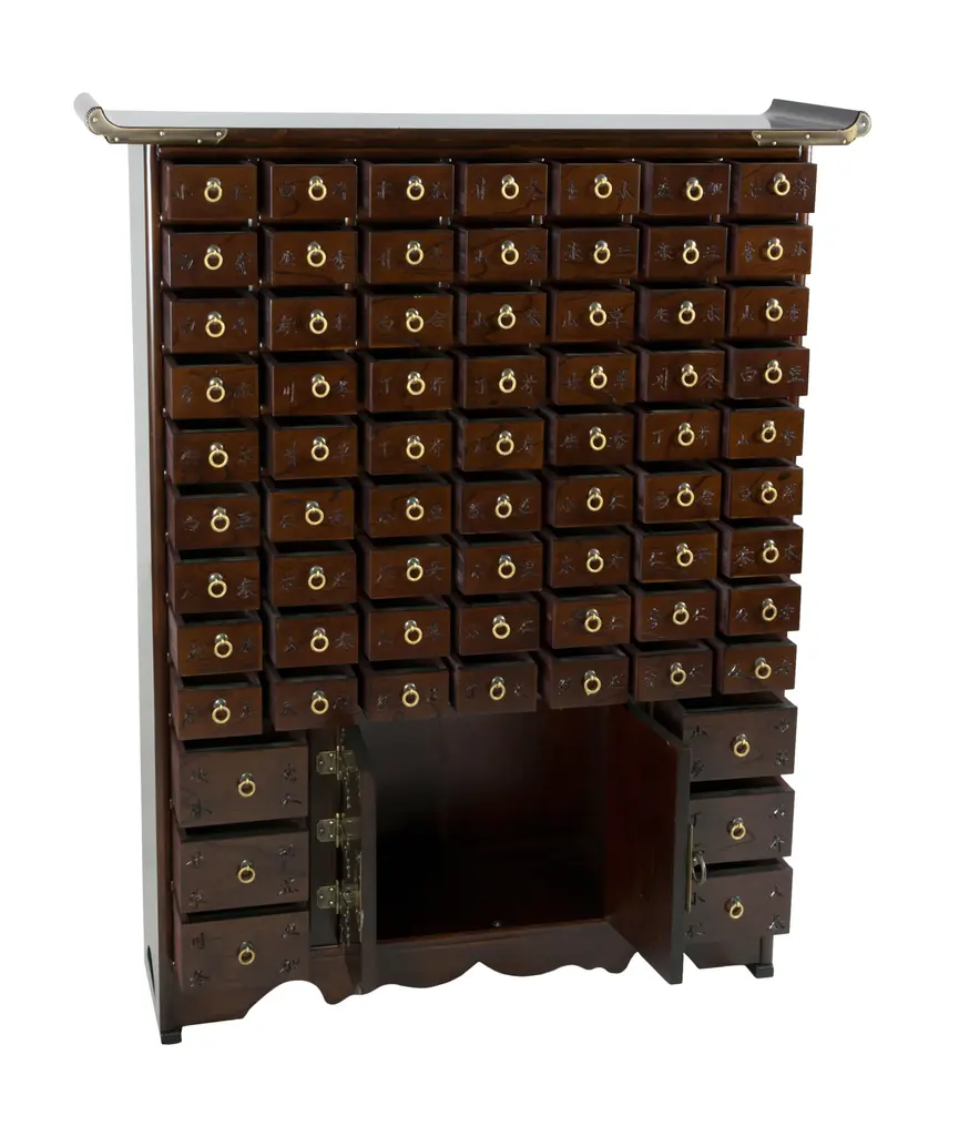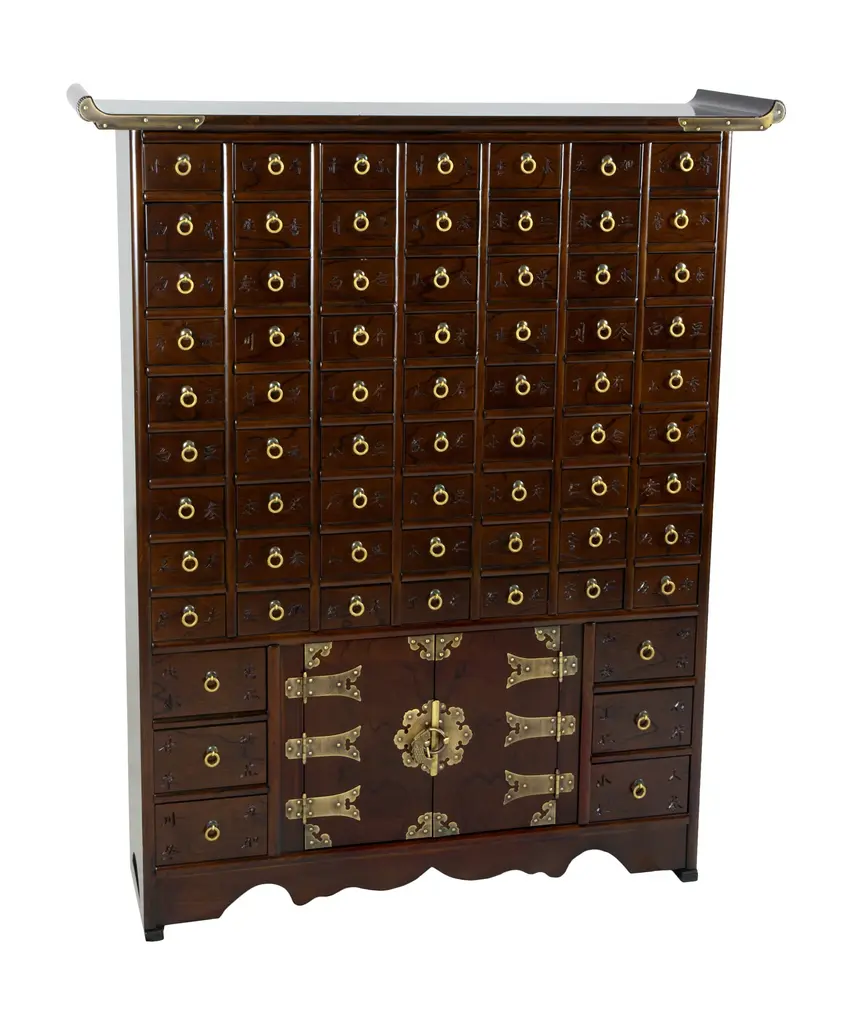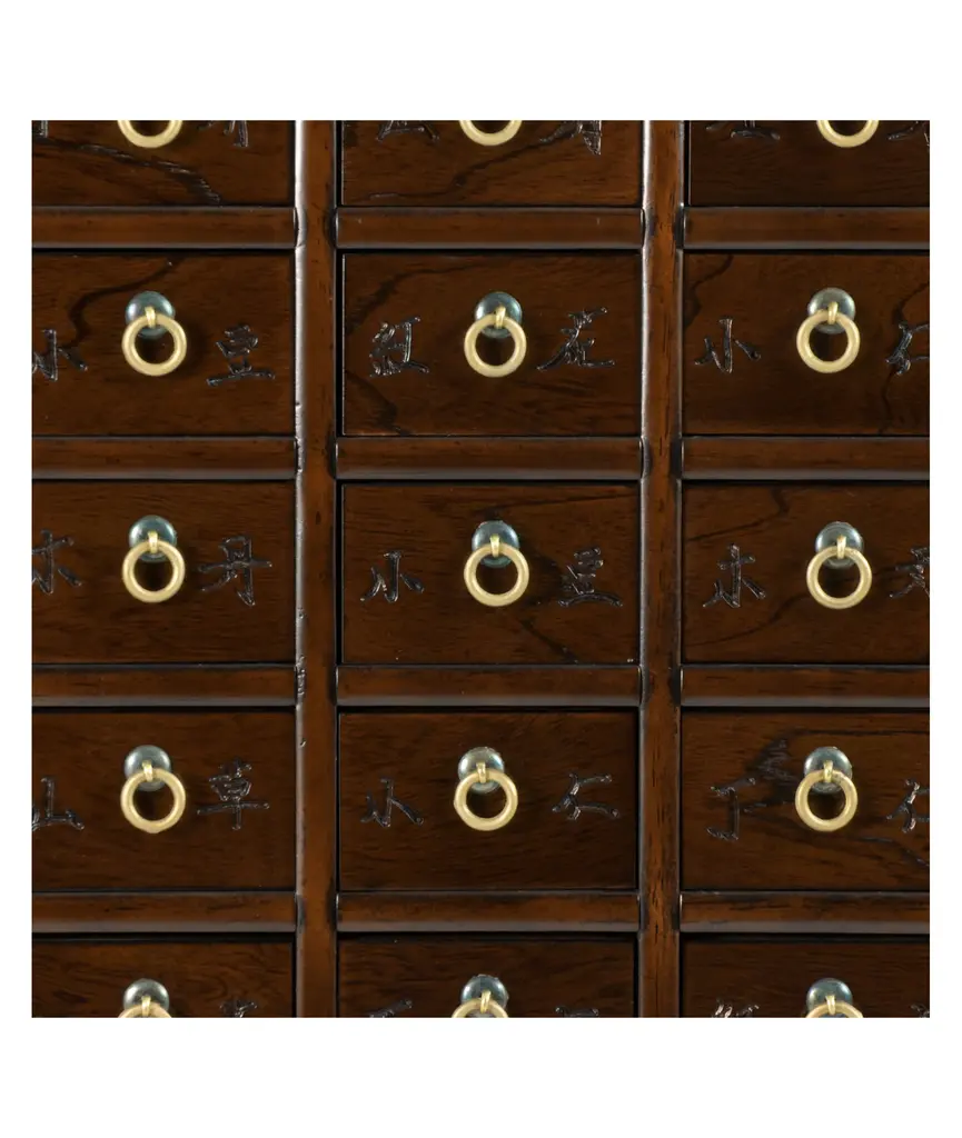Immerse yourself in the rich cultural heritage of East Asia with this Korean apothecary chest. This authentic east Asian herbal medicine chest is handcrafted in a classic Korean antique design, featuring 69 narrow drawers traditionally used for medicinal powders, minerals, roots, and herbs, but equally suitable for storing spices, jewelry, cosmetics, office supplies, and other small items in the modern home. Crafted with meticulous attention to detail, this chest is finished in richly grained dark stained Elmwood and accented by etched oriental brass fittings. The slim profile allows you to place this cabinet against a wall without impeding foot traffic, making it a versatile and functional addition to any space. Experience the timeless elegance and practicality of traditional Korean furniture design with this exquisite piece.Endless Organization - Narrow drawers perfect for storing and organizing small items from office supplies like pens, rubber bands, and paper clips; craft supplies like beads, buttons, and scissors; small tools like screwdrivers, nails, and screws; to cosmetics like lipstick, eyeliner, and mascara!Authentic Korean Design - Handcrafted in a classic East Asian antique style, this chest embodies the rich cultural heritage of Korea, adding a touch of traditional elegance to any space.Lockable Cabinet - Secure your valuables and add a touch of traditional charm with the included brass fish lock and key, believed to bring luck and prosperity according to Asian folklore.Durable Construction - Crafted from high-quality dark stained Elmwood and accented with oriental brass fittings, this chest is built to last for years to come.Narrow Profile: The slim profile of this chest allows you to place it against a wall without impeding foot traffic, making it a practical and stylish storage solution for any room.Includes lucky brass fish lock & key