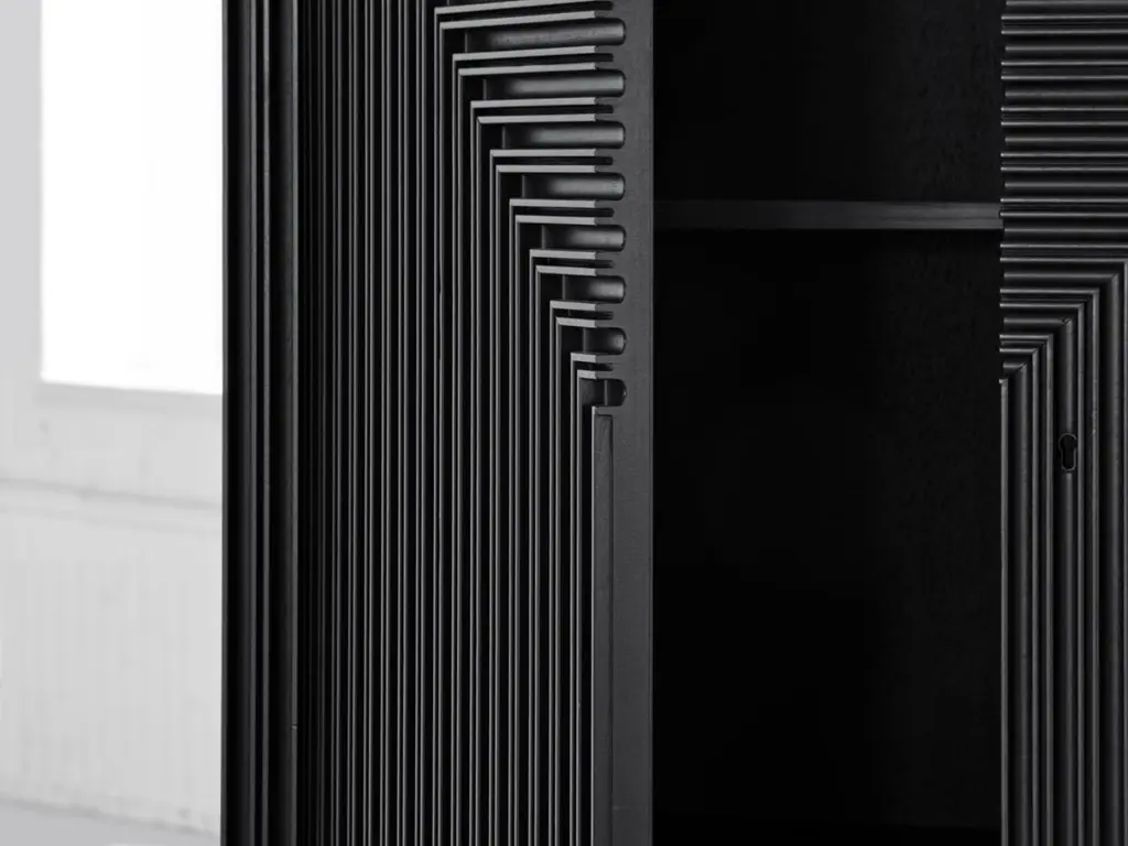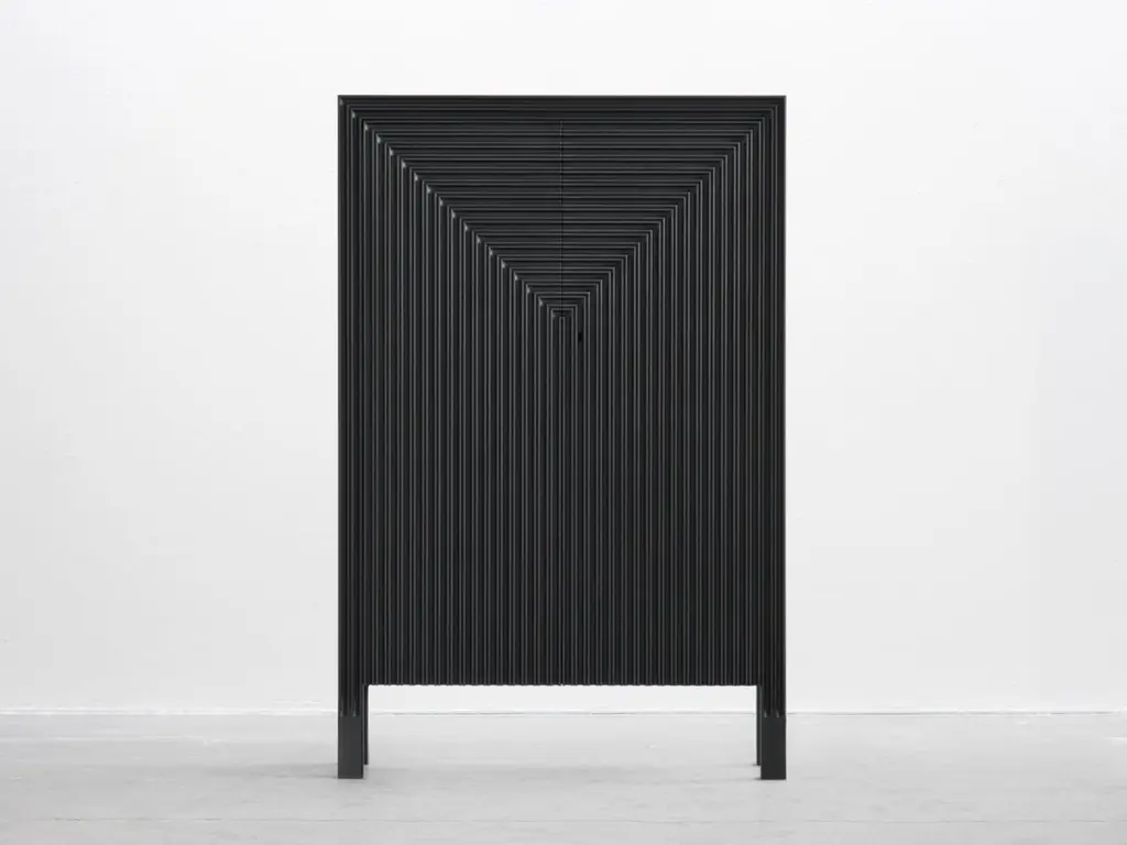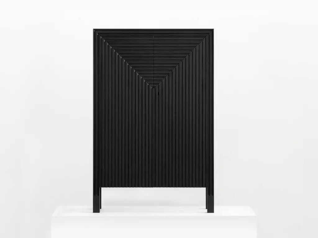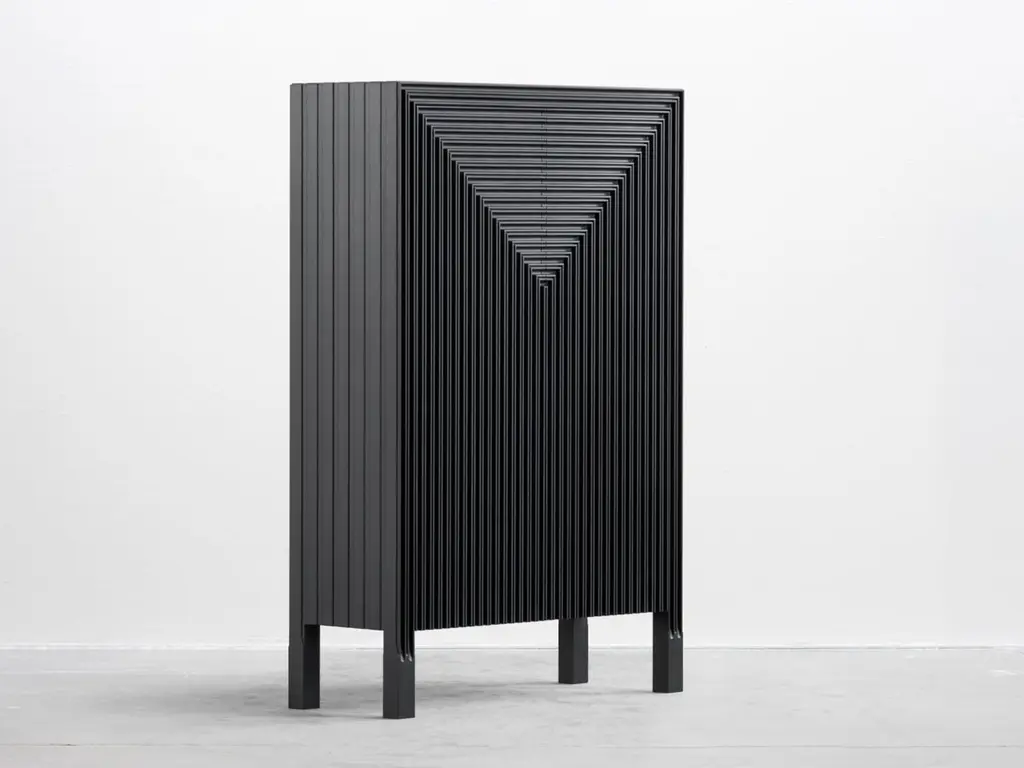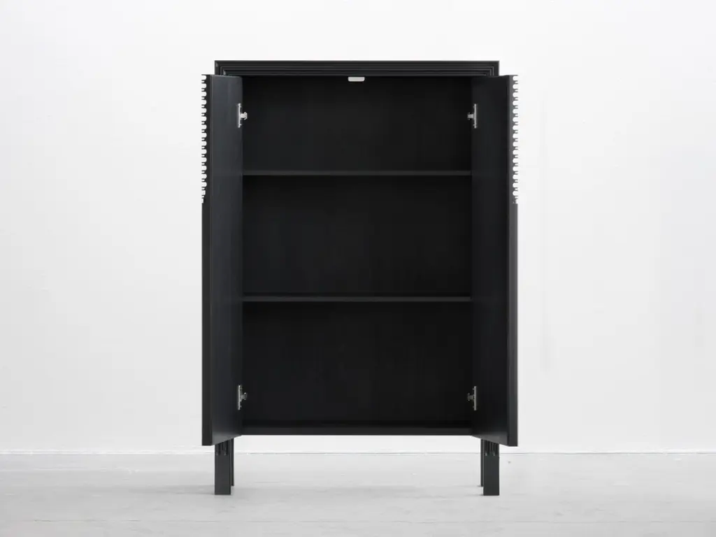 Korint Cabinet by SNICKERIETDimensions: D 28 x W 72 x H 110 cm. Materials: Stained and lacquered aspen and birch.Adjustments can be discussed as long as furniture archetype is maintained. Please contact us.Korint seeks harmony between expressions of classic cabinet making andindustrial production. Realized through extensive strip milling, the construction is based around a suspended framework that offer a seamless symmetry and a monolithic expression.SNICKERIET is a furniture studio with an explorative approach to traditional woodworking craft and philosophy. Projects are initiated as research into topics revolving technique, construction, decoration and material properties. The findings are released in the form of individual pieces of furniture. The studio was founded in 2011 and is based in Stockholm and Gothenburg.Karl-Johan Hjerling, designer, creative director, founderGunnar Dahl, Production manager, founderHannu Hietamäki, Lead cabinet makerRobert Zillén, Head of studio and client matters