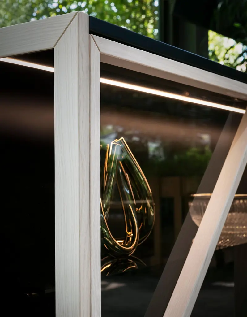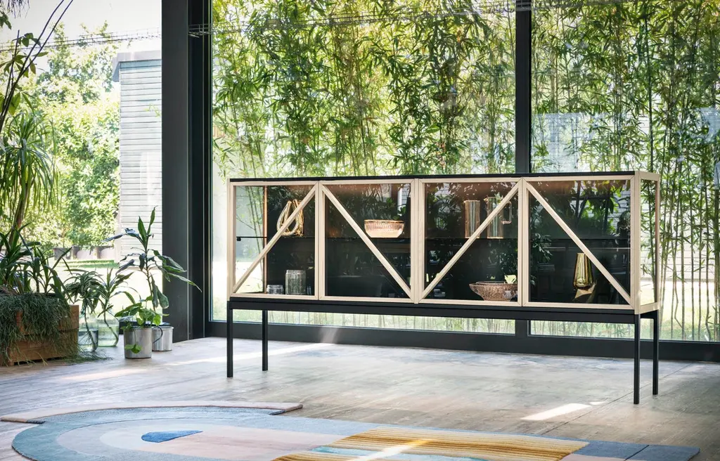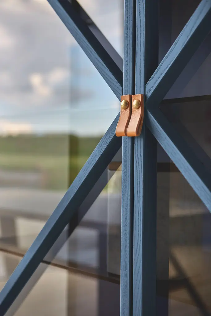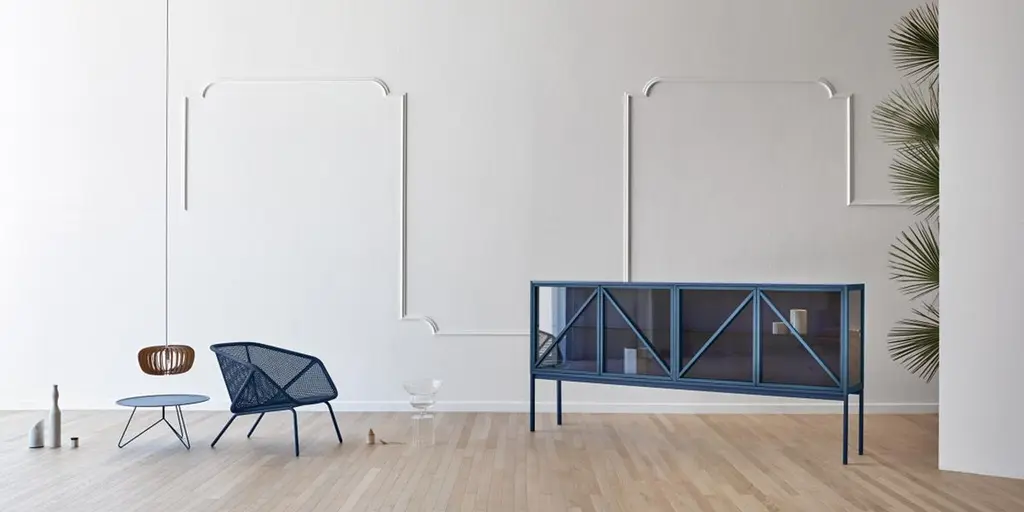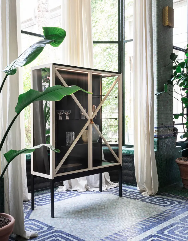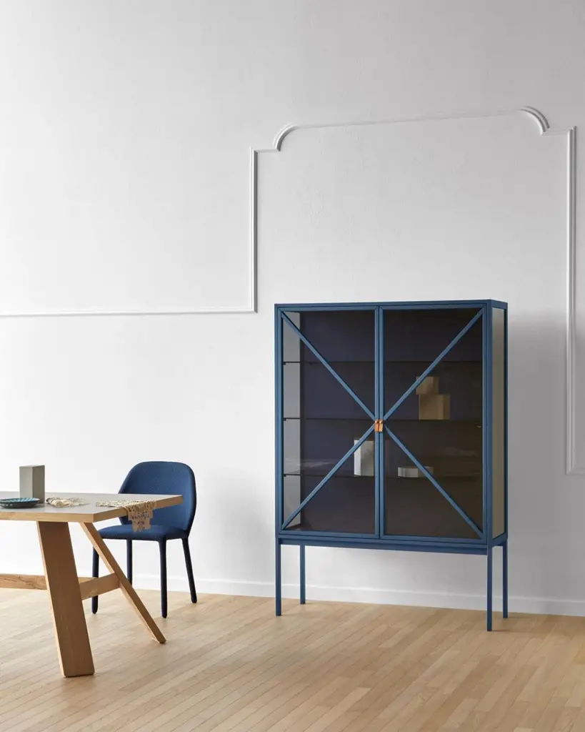Vertical version of Kramer vitrines, with leather handles. Available in two different heights and sizes, it tells stories to the domestic living by interacting with the transparencies of the smoked glass, with the led inside the cupboard. It is theatrical, scenic, it brings the volume of antique furniture to the contemporary.Formed by Gaia Giotti, Giona Scarselli and Cristina Razzanelli, E-ggs deals with design with a transversal approach, ranging from product design, interior and architecture. Attention and curiosity are captured by the discovery of the unusual in everyday life, in the search for new expressive and material languages. It is from the exploration of everyday needs that ideas for ideas are born.Additional Information:Material: Metal, glassFrame finish: Intense blue lacqueredDimensions: 127 W x 44 D x 180 H cmAvailable in other frame finish options: White lacquered, powder gray lacquered, silk gray lacquered, black lacqueredAvailable in other size options: SmallAvailable in other structural options: Horizontal version