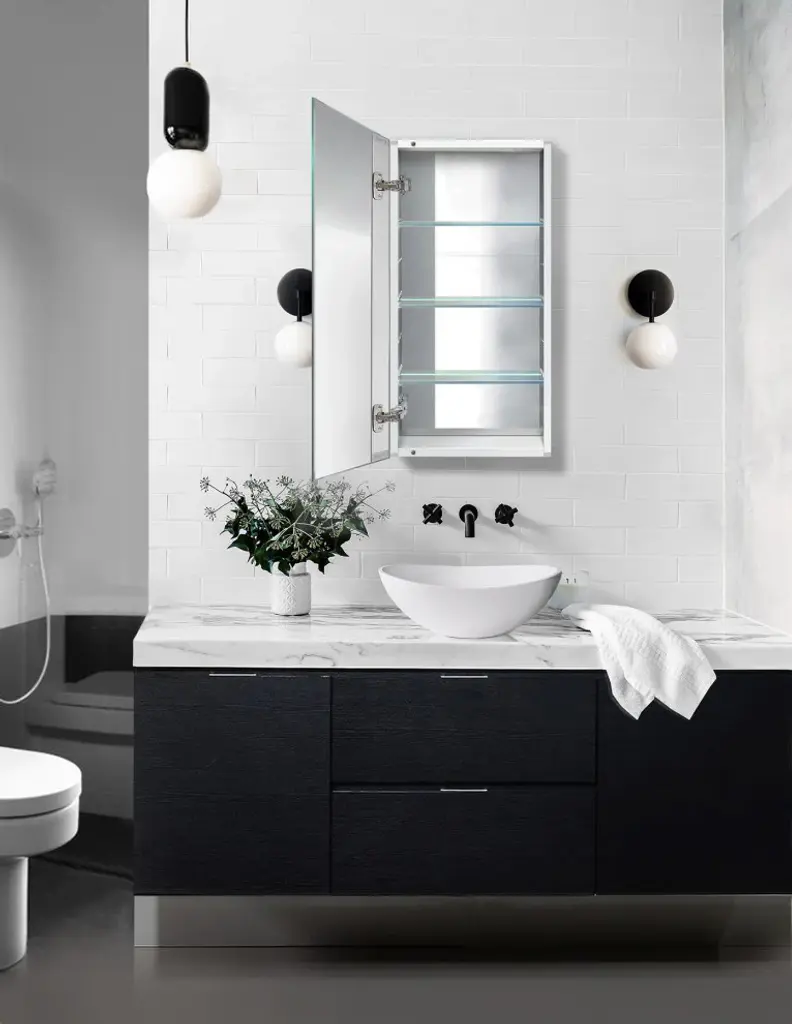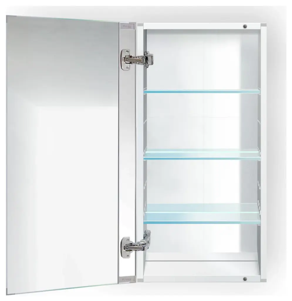 Functional. Sleek. Timeless. The Kruggs Reflections medicine cabinet offers the perfect blend of elegance and functionality for any bathroom environment. The cabinet features a modern, mirrored exterior to optimize the size of your bathroom. A mirrored interior on the front inside door and back panel of the cabinet ensures continuous reflection access. The interior also includes three clear, adjustable glass shelves to discreetly store your bath items. For flexible installation, the cabinet can be recessed or surface mounted, making the decor ideal for both large and small bathrooms. Soft-close, Austrian Blum hinges ensure a quiet bathroom atmosphere - premium touches without the extravagant price tag. An expression of style and practicality, this high-end medicine cabinet is a beautiful statement piece for your bathroom.