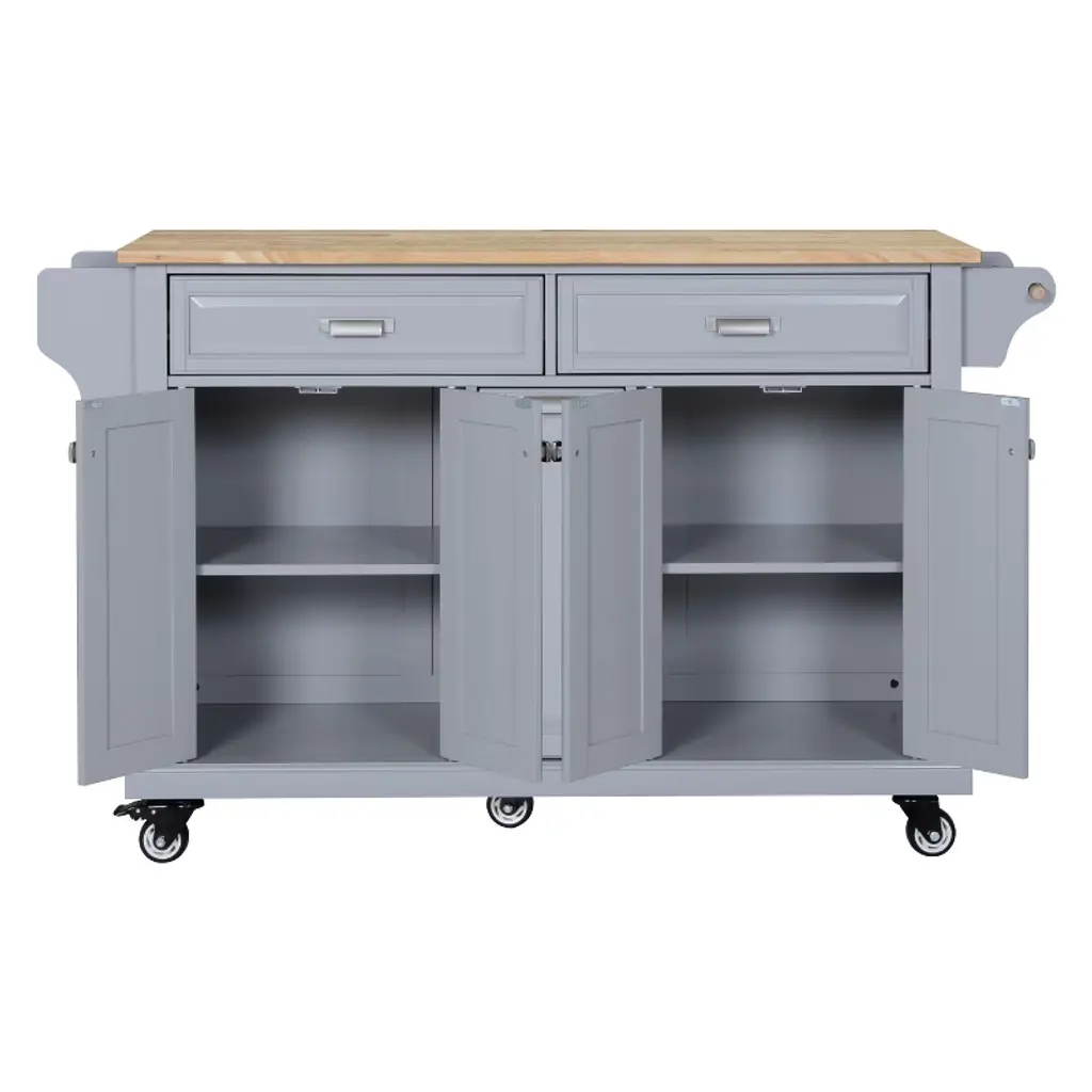 This expansive 60.5-inch kitchen island cart provides ample workspace and storage solutions for your culinary needs. The durable rubberwood top offers a sturdy surface that is perfect for food preparation and entertaining guests. As a comprehensive kitchen storage cart, it features two large top drawers, a double-layer storage cabinet, and adjustable interior shelves to accommodate items of various sizes. The five-wheel system ensures smooth mobility while maintaining stability during use, making this rolling kitchen island easy to position wherever needed. Crafted from solid wood and high-quality MDF, this kitchen cart with storage combines elegance with robust construction. The thoughtful design includes convenient accessories like a towel rack and spice organizer, making this kitchen island on wheels both functional and stylish.