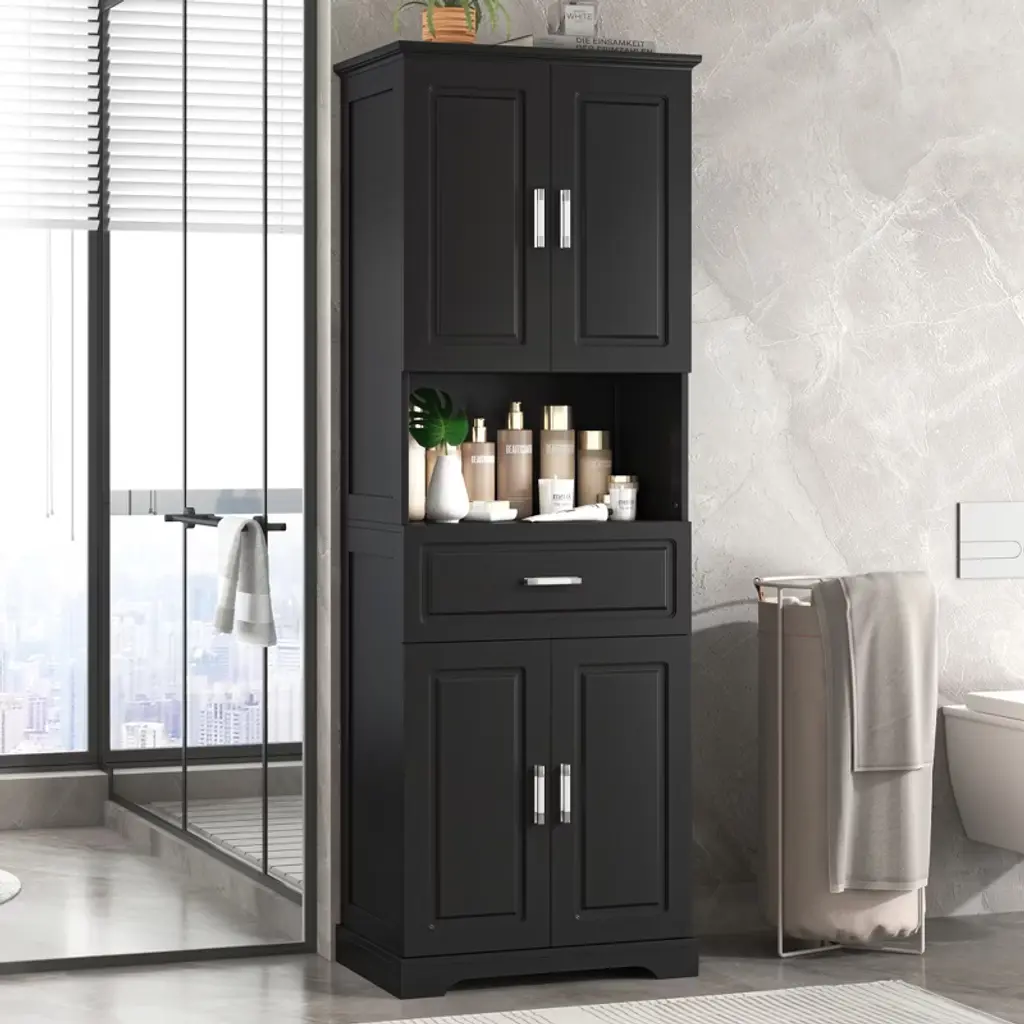 This cabinet is made of high-quality medium-density fiberboard with a lacquered finish, making it waterproof, smooth, and easy to clean. The shelves are adjustable to three heights, allowing you to store shampoo, towels, body lotion, tissues, and storage baskets, meeting your daily needs. The upper cabinet features two levels, with closed doors, perfect for storing decorative items or daily necessities. Additionally, a large center drawer with slides and two laundry baskets in the lower level provide even more storage space.