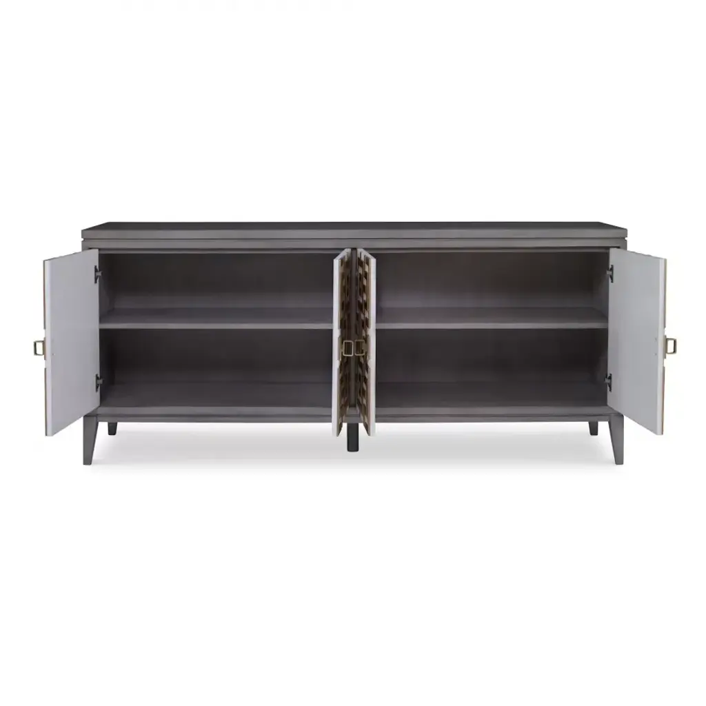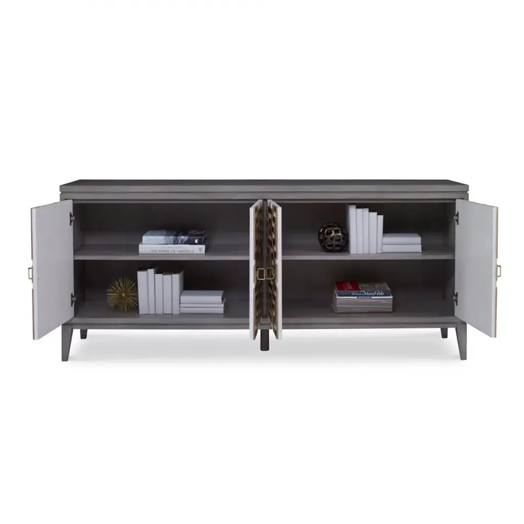 Crafted from Mahogany solids and veneer, this cabinet features four doors layered with gold painted fretwork over ivory textured panels. The outside, top and base are finished in ash grey. Brass hardware completes the look. Adjustable shelves included.
