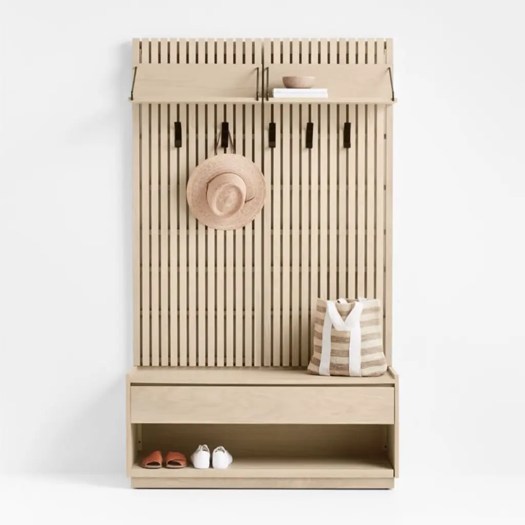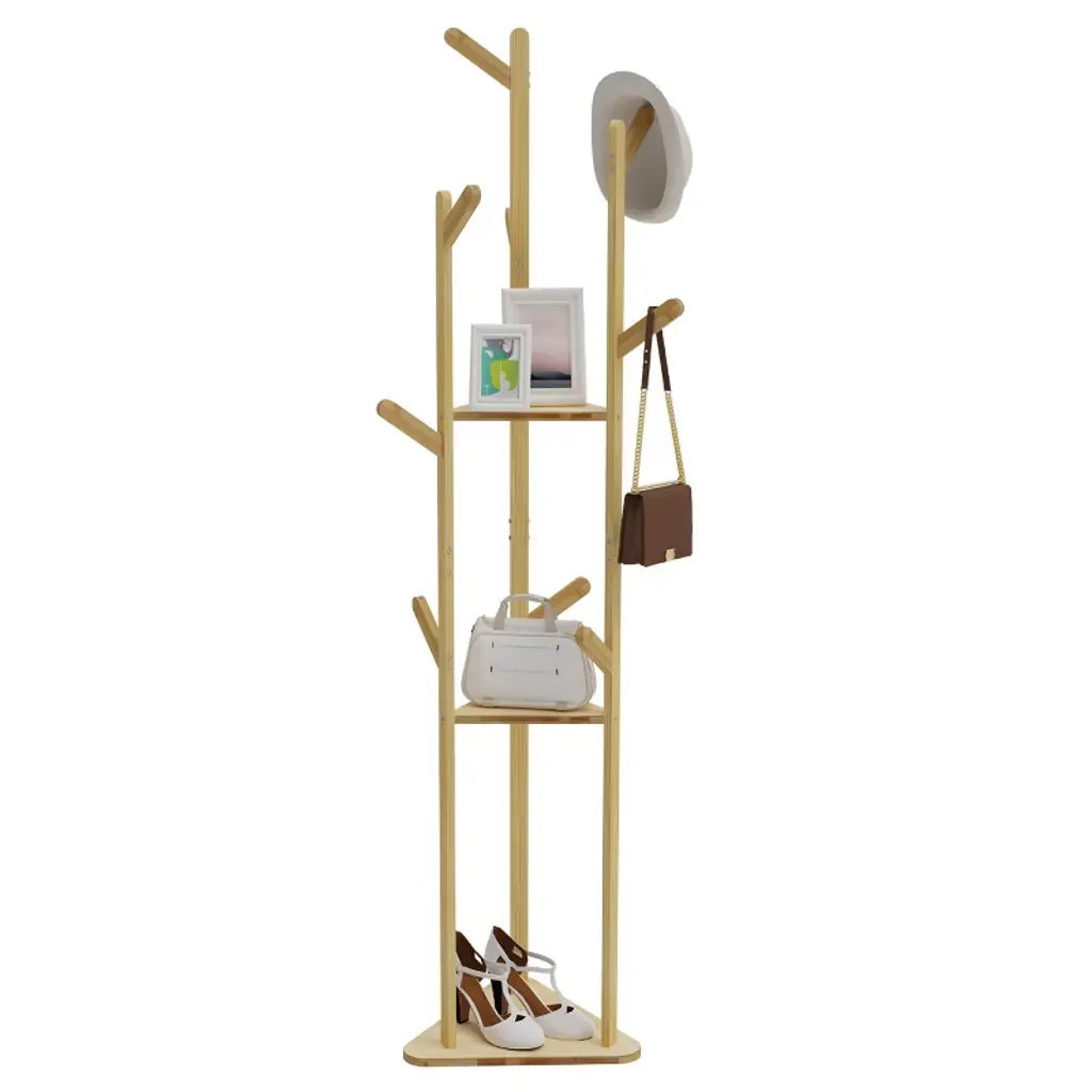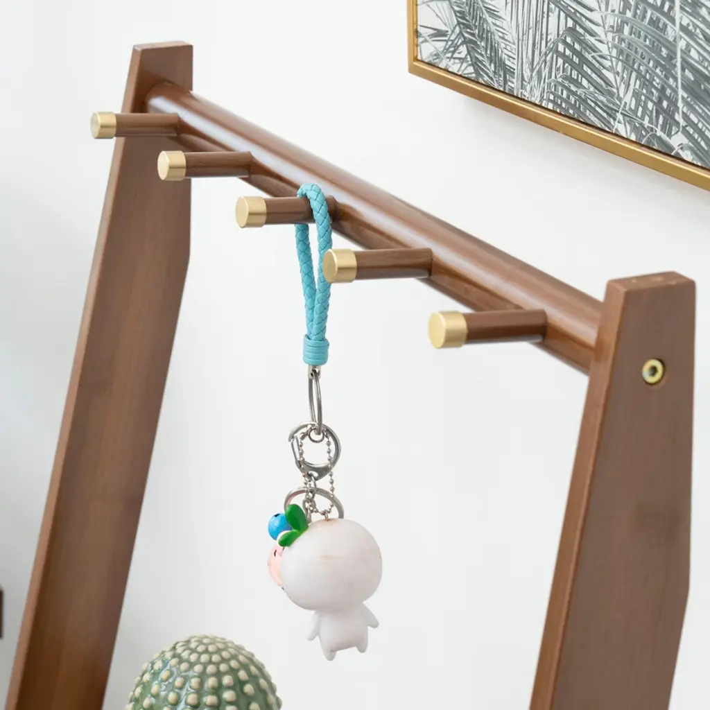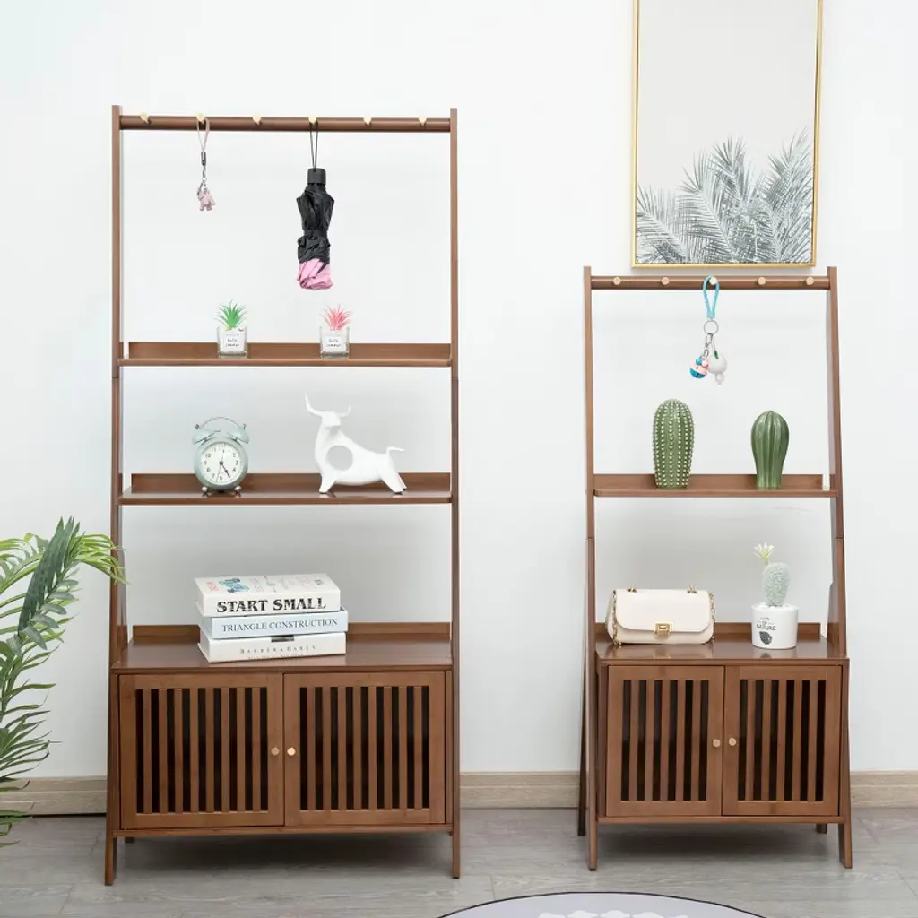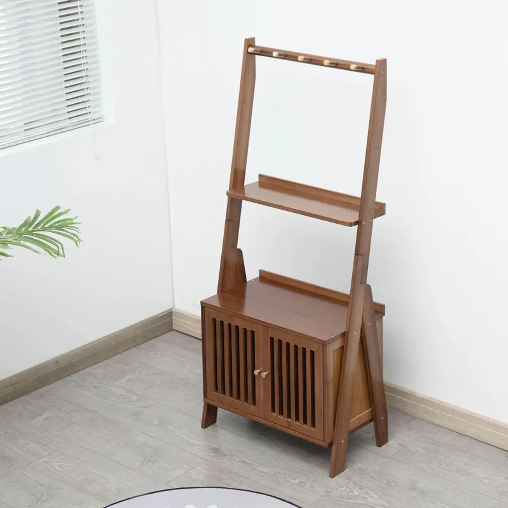 This shelf is made of high quality bamboo wood, high hardness, stronger load bearing and more stable. The surface is polished smooth and flat, not solid, effectively preventing items from falling. The overall triangular stabilizing structure prevents tipping and better protects you and your family's safety. The top with five elongated hooks, you can hang multiple keys, folded umbrellas or other items. The bottom comes with a double-door storage cabinet with a ventilated door design, which is dustproof as well as ventilated to prevent moisture and odor from arising. The top of the cabinet and a layer of partition, open design, can display your ornaments in all directions, showing your unique fashion taste. The original wood color style perfectly fits various styles of home decorating environment, with a wide range of practicality, bedrooms, living rooms, bathrooms, kitchens, flower rooms, all suitable to enhance the fashionable atmosphere of the home.