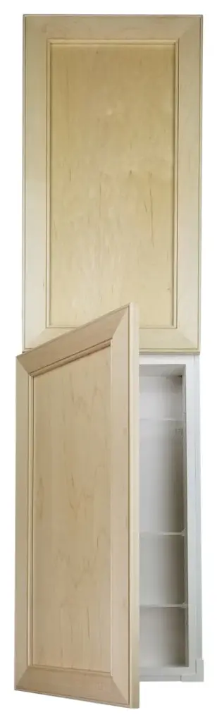 Perfect for any bathroom. Recesses in the wall between the studs, and simply screws to the studs on each side of the opening. Only the doors are outside the wall. Fully adjustable glass shelves inside. Our unique, patented design of shelf supports keeps each shelf in place. Concealed hinges with soft close built in assures the door will never slam shut, but softly close on its own instead. Box is SOLID pine and the Villa Bead Panel style door is SOLID maple. We''ve painted the inside of the box white, so you don''t have to! Unfinished door can be painted or stained. The box is 3.5" deep inside and gives you plenty of usable depth, but fits in standard 2x4 walls. This model has TWO doors which open to reveal two separate cabinet sections. Cabinet box is 12.5" wide inside. Doors are reversible to open either Left or Right. Completely assembled! All you need to do is put one screw in each hinge to mount the door. Then insert it in the wall and screw it to the studs with included screws. If you are replacing a current cabinet, measure your wall opening! White plastic trim surround covers the rough edges of your opening up to 1/2" all around. Doors cover the trim surround when closed so the only thing you see outside the wall are the doors. Made in USA.