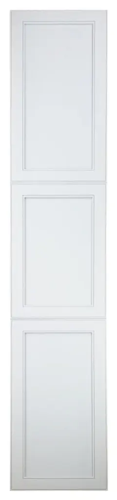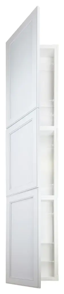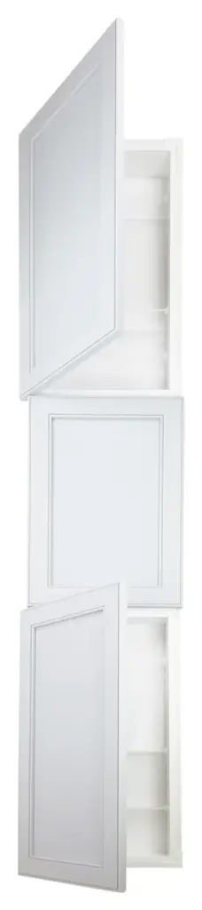 Perfect for any bathroom. Recesses in the wall between the studs, and simply screws to the studs on each side of the opening. Only the doors are outside the wall. Fully adjustable glass shelves inside. Our unique, patented design of shelf supports keeps each shelf in place. Concealed hinges with soft close built in assures the door will never slam shut, but softly close on its own instead. Box is SOLID pine and the Inset panel style door is SOLID maple. We''ve painted the inside of the box white, so you don''t have to! Doors are primed and ready for you to paint them. The box is 3.5" deep inside and gives you plenty of usable depth, but fits in standard 2x4 walls. This model has THREE doors which open to reveal two separate cabinet sections. Cabinet box is 12.5" wide inside. Doors are reversible to open either Left or Right. Completely assembled! All you need to do is put one screw in each hinge to mount the door. Then insert it in the wall and screw it to the studs with included screws. If you are replacing a current cabinet, measure your wall opening! White plastic trim surround covers the rough edges of your opening up to 1/2" all around. Doors cover the trim surround when closed so the only thing you see outside the wall is the door itself. Made in USA.