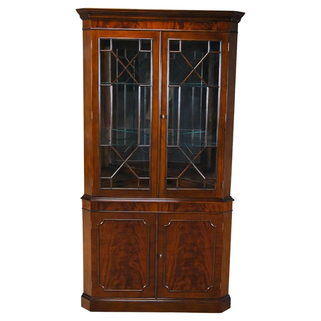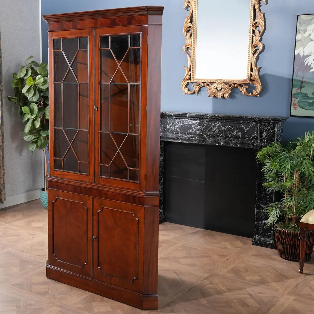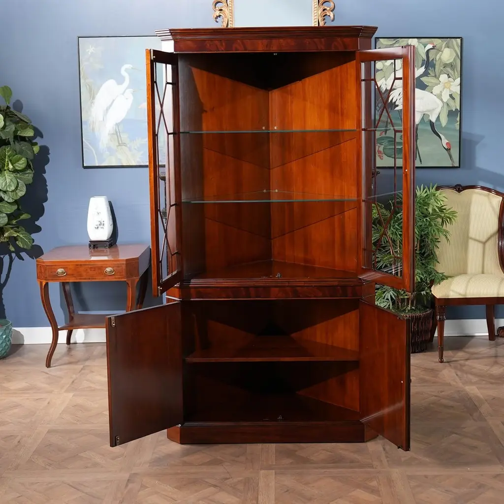 This double door, Large Mahogany Corner Closet is manufactured from kiln dried, plantation grown, mahogany, and features figured mahogany veneers on the door fronts. The attention to detail and expert craftsmanship is apparent in the hand carved solid mahogany details throughout this china closet. The top section has a mirrored back, glass shelves, solid mahogany door frames and lattice work creating a perfect setting to display your treasured valuables. The lower section of the Large Mahogany Corner Cabinet features a wooden shelf and closed additional storage space. This high quality china closet comes in two part construction for ease of transportation and installation.In order for this cabinet to be displayed properly in a corner of the room you would need to have 30 inches of wall space available on each wall.Measures 42 w x 22 d x 80 h