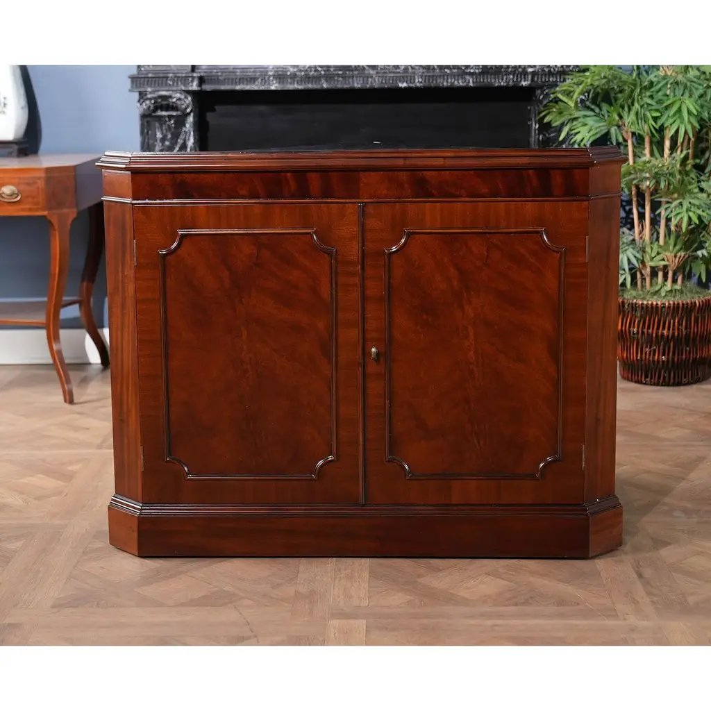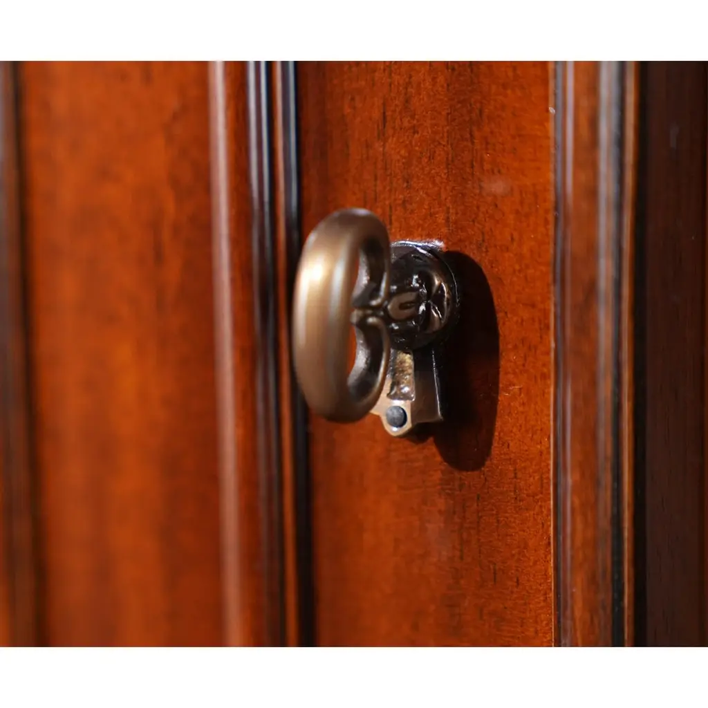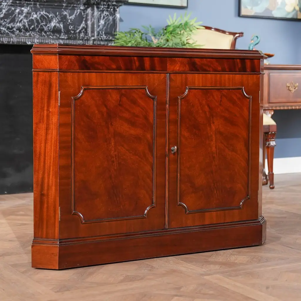 This double door, Large Mahogany Corner Closet is manufactured from kiln dried, plantation grown, mahogany, and features figured mahogany veneers on the door fronts. The attention to detail and expert craftsmanship is apparent in the hand carved solid mahogany details throughout this china closet. The top section has a mirrored back, glass shelves, solid mahogany door frames and lattice work creating a perfect setting to display your treasured valuables. The lower section of the Large Mahogany Corner Cabinet features a wooden shelf and closed additional storage space. This high quality china closet comes in two part construction for ease of transportation and installation.In order for this cabinet to be displayed properly in a corner of the room you would need to have 30 inches of wall space available on each wall.Measures 42 w x 22 d x 80 h