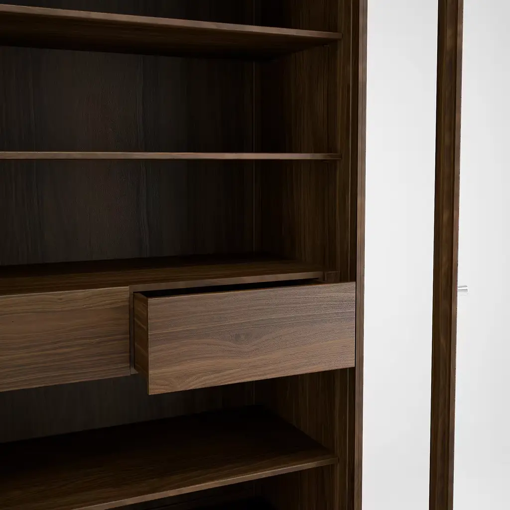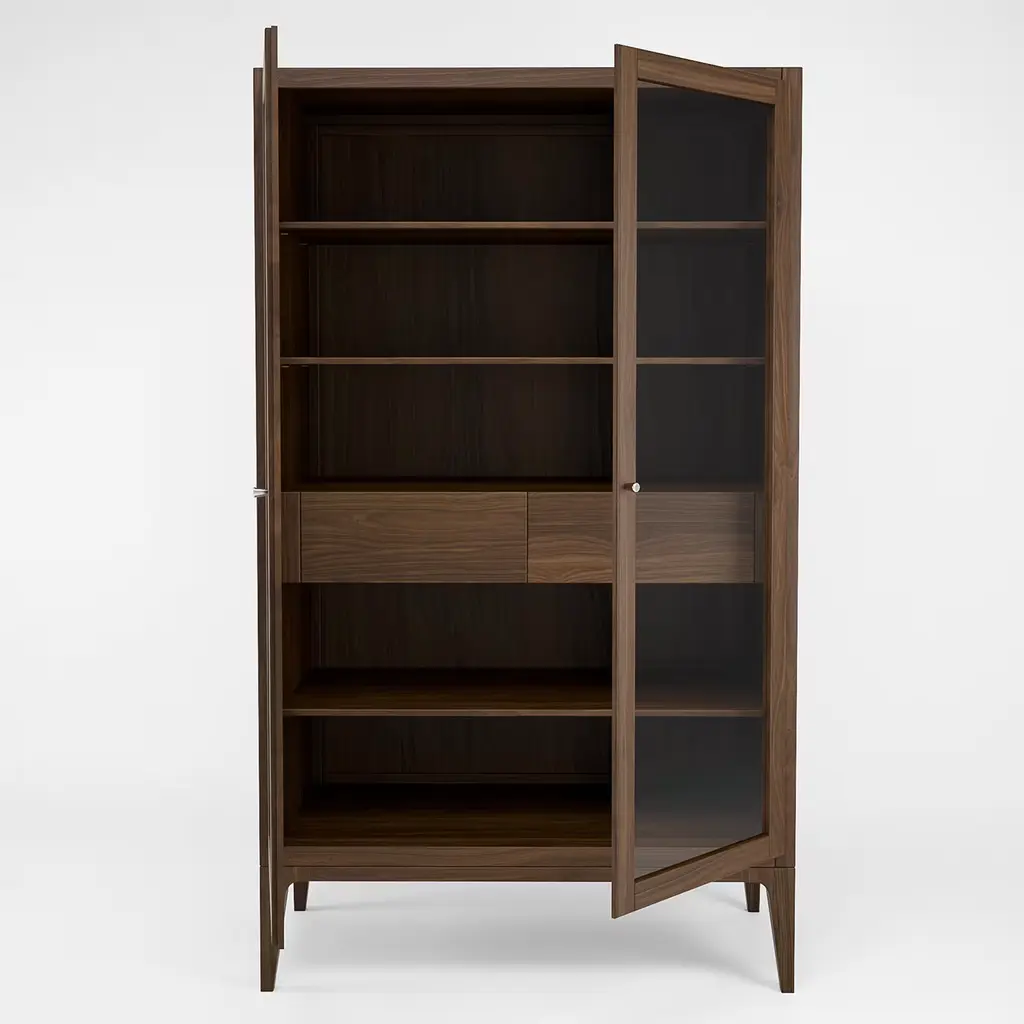 Handcrafted of solid American walnut with meticulous attention to detail, this remarkable display cabinet is Italian finesse epitomized. Showcasing a grand, linear silhouette, the deliberate lack of ornate detailing lets the warm and rich wood tones take center stage. This cabinet features three wooden shelves, providing spotlight for treasured collectibles and a central section with two drawers. Lateral wood panels sides and glass doors with metal knobs complete this modern and elegant cabinet that can be fully customized upon request. Assembly required, detailed instructions included.