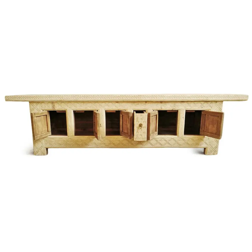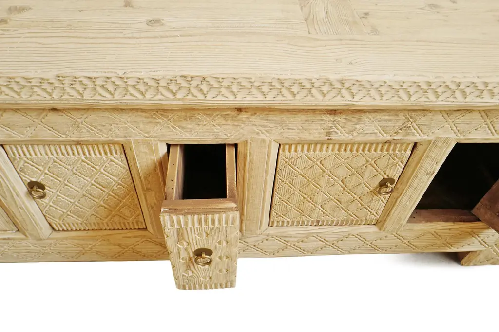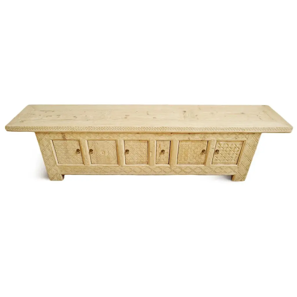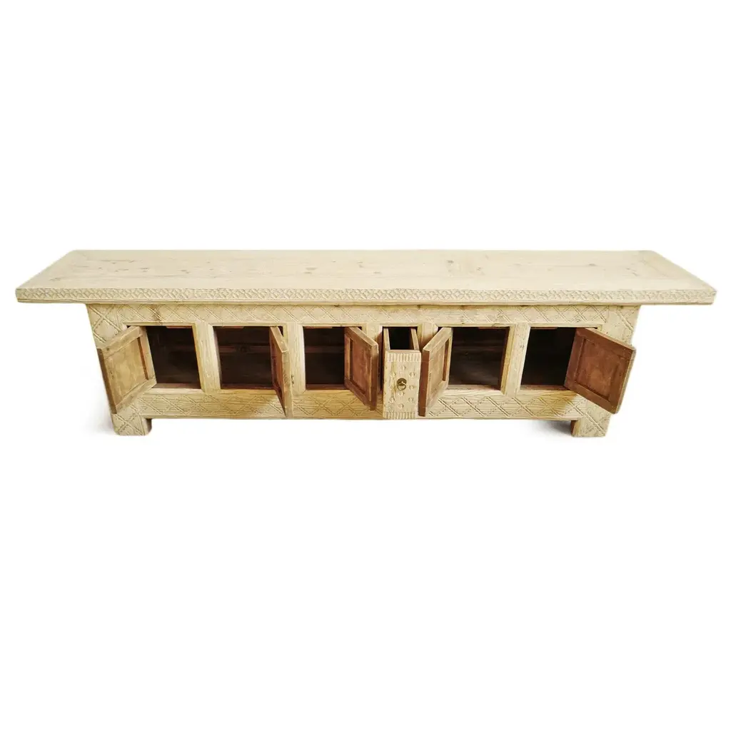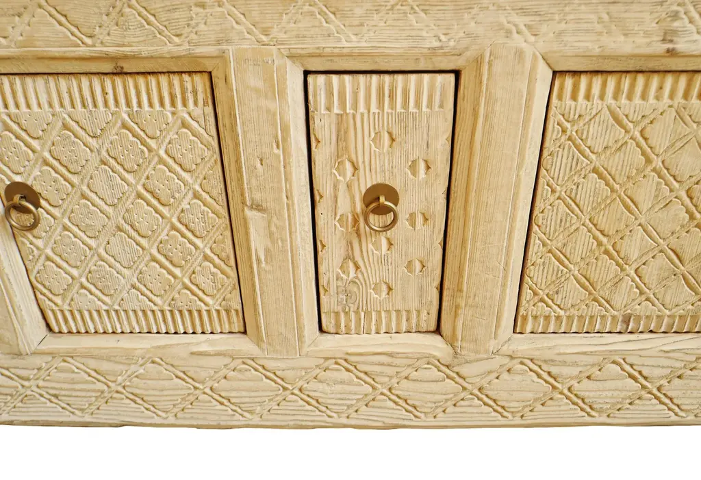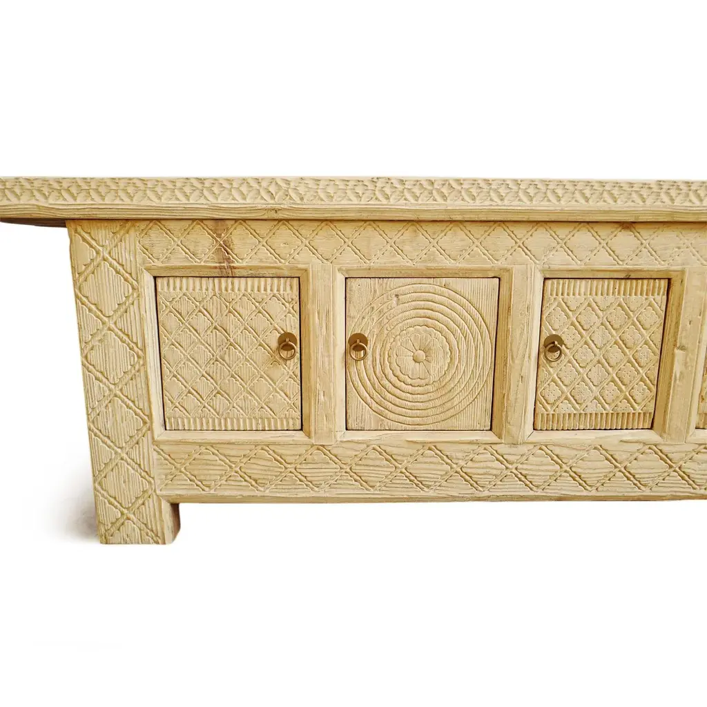 Beautiful hand carved vintage Mongolian cabinet. Solid wood with light raw finish. Perfect for use as a media cabinet, sideboard, or entry bench with storage. Intricate carved patterns on front with five doors and one narrow drawer with brass finish iron ring pulls. Each cabinet may have slight variations in natural wood tones/grain and inherent imperfections.