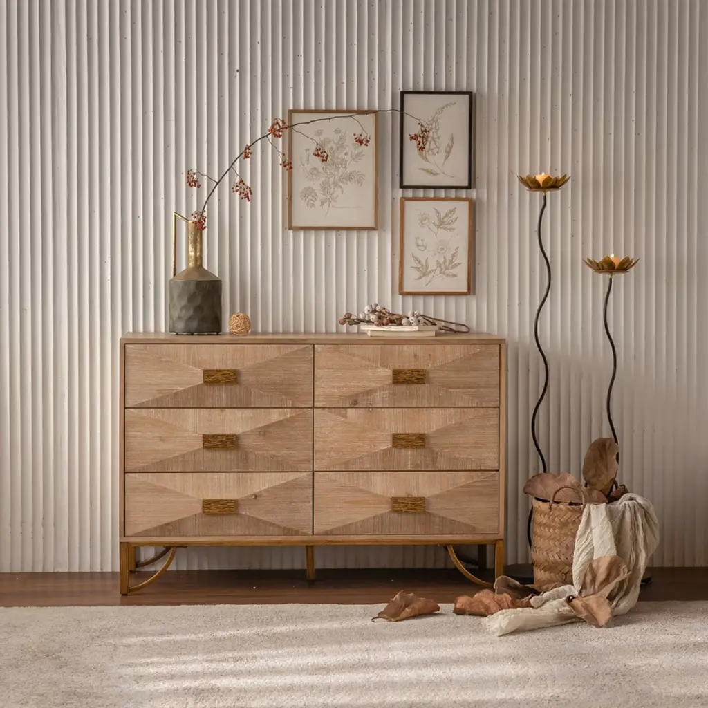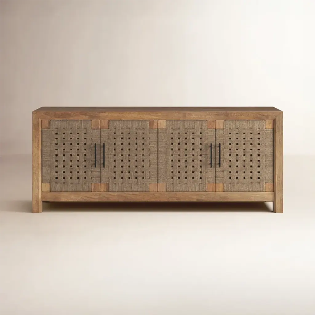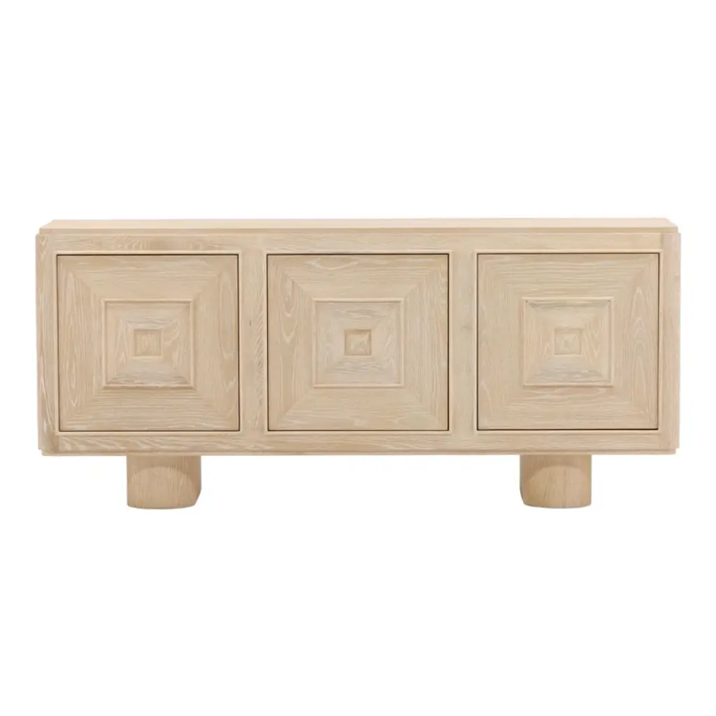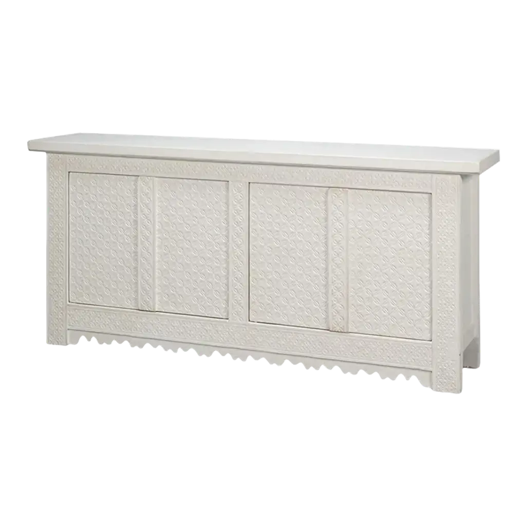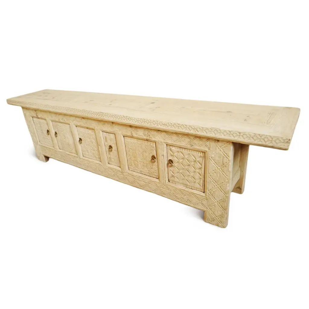Beautiful hand carved vintage Mongolian cabinet. Solid wood with light raw finish. Perfect for use as a media cabinet, sideboard, or entry bench with storage. Intricate carved patterns on front with five doors and one narrow drawer with brass finish iron ring pulls. Each cabinet may have slight variations in natural wood tones/grain and inherent imperfections.