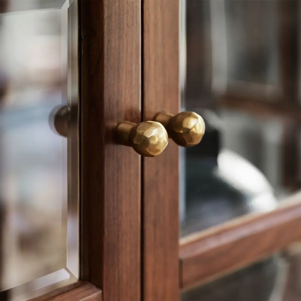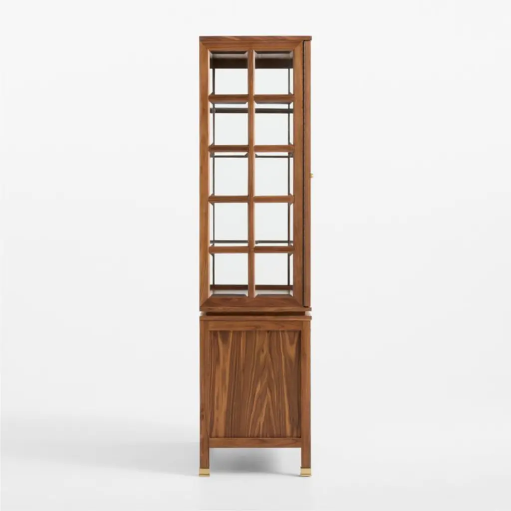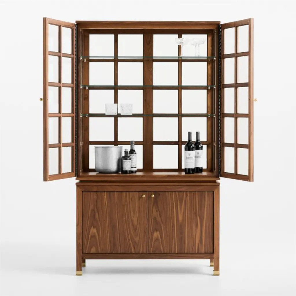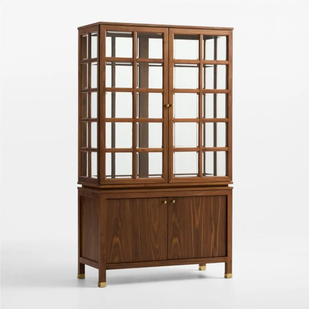 Designed with glass & finished on all four sides, our Lattice cabinet can float in a room to showcase collectibles, glassware, books or fine ceramics. Crafted of statement-making walnut, the heirloom-quality cabinet is meticulously crafted. Beveled walnut mullions frame the upper cabinet, gridding the beveled glass panels geometric pattern. Four adjustable tempered glass shelves provide an airy, variable display of your showcased items. Below, flat-panel doors highlight the wood's active grain, concealing ample storage space. Brass-plating lends a warm glow to the sculpted pulls and protective sabot-capped feet .Introducing The Collected Home. Our exclusive new collaboration with interior designer Jeremiah Brent is rich with bespoke details and bold individuality.