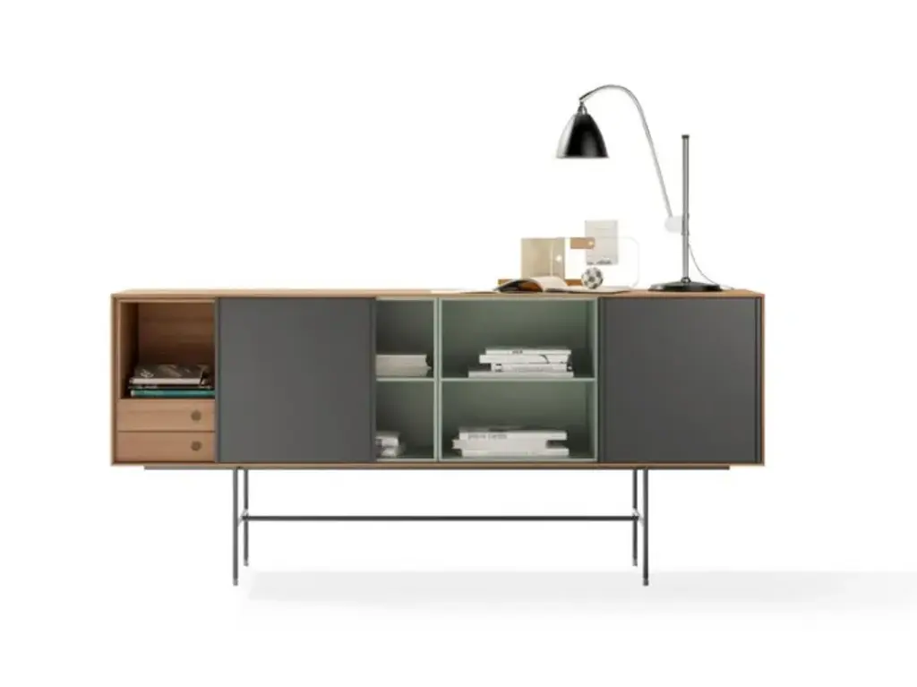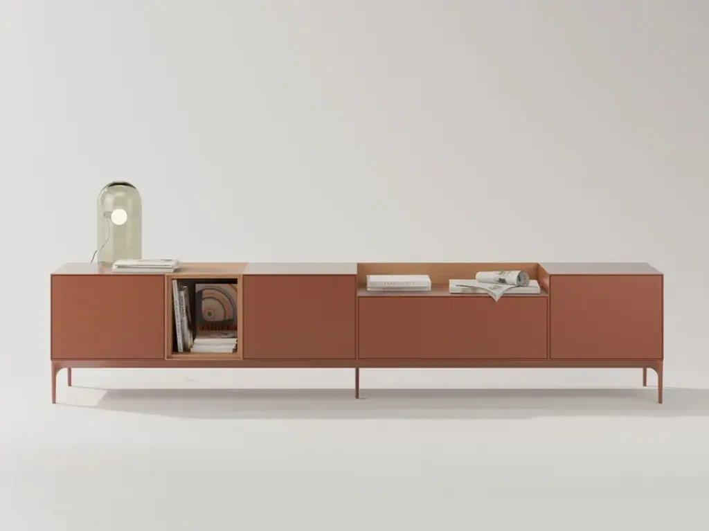 Lauki TV UnitIn the photo:Elliptical legs 256 x 18 x 45 cm in Indian3 doors 48 x 36 x 45 cm– Casing: Indian– Door fronts: Indian1 open compartment 32 x 36 x 45 cm– Casing: Tobacco Oak– Back panel: Tobacco Oak1 flap door unit with back panel 80 x 27 x 45 cm– Casing: Indian– Door front: Indian– Back panel: Tobacco OakFor additional finishes and color combinations, please contact our customer service center.The aesthetic subtlety of this collection draws you to it and invites you to touch and contemplate it. A thin half-centimetre frame envelopes the entire piece, outlining the push-to-open drawers that lend a touch of imagination and resolution to a design that is easy to admire yet difficult to materalise. The Lauki collection is made up of multiple boxes that can be arranged on the floor, piled on top of one another or hung from the wall. Moreover, these boxes are available in a wide range of different measurements, finishes and functions (drawers, doors, open modules, etc.), thus enabling you to create an endless variety of configurations to suit any room. For example, the same module can be used as a bedside table or an office drawer unit. With just a few different modules, you can design a solution for an entrance hall or any other room in the house. And by putting a larger number of them together, you can create a TV unit, sideboard or even a filing cabinet for the office.